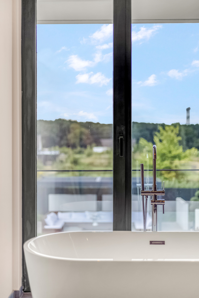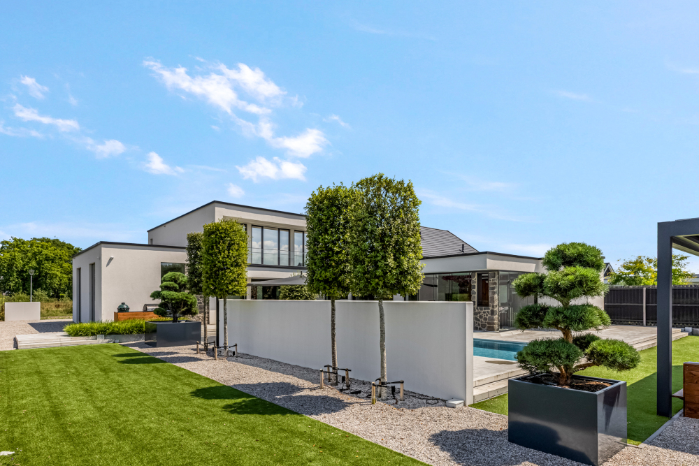 Inside, the spacious kitchen with a cooking and sink island forms the heart of the home. All elements — kitchen, bathrooms, wardrobes, and vanity units — are fully custom-designed with attention to detail and style. The bright living room and corridor with an impressive glass façade create a stunning connection to the architect-designed garden and breathtaking views. With four spacious bedrooms and two luxurious bathrooms, there’s plenty of room for the whole family.