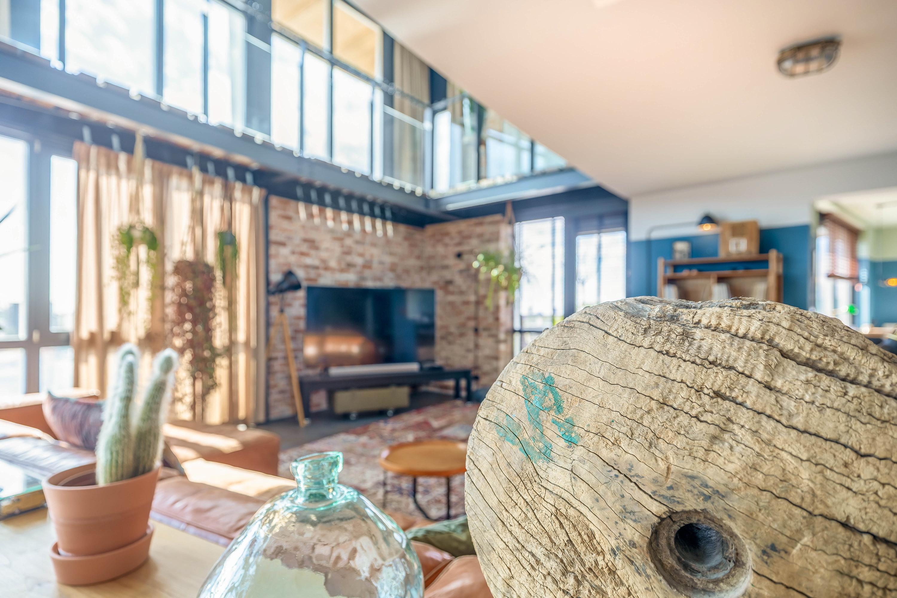 Entrance with wardrobe and guest toilet. The extremely spacious living room (85 m²) boasts incredible natural light thanks to a massive 7-meter-high window and an impressive mezzanine with an industrial-style balustrade. The entire floor is finished with luxurious Italian stone flooring and underfloor heating. On both sides of the living room, you’ll find expansive rooftop terraces, facing southwest and southeast respectively – 98 m² total. Enjoy all-day sun and phenomenal views. The skyline of Rotterdam feels almost within reach.