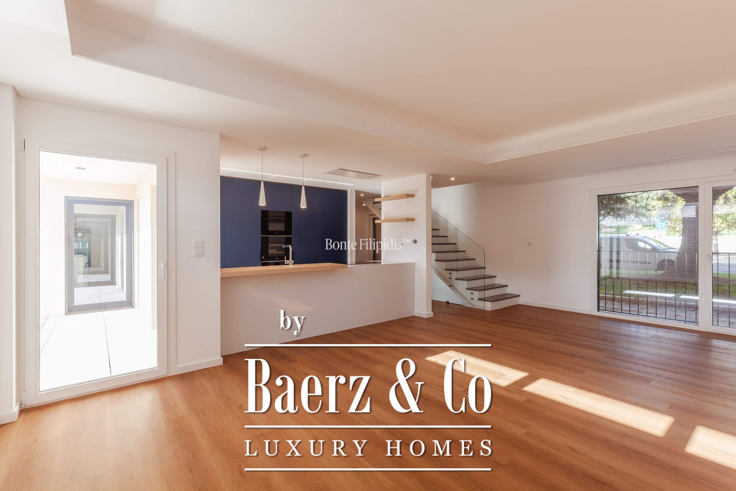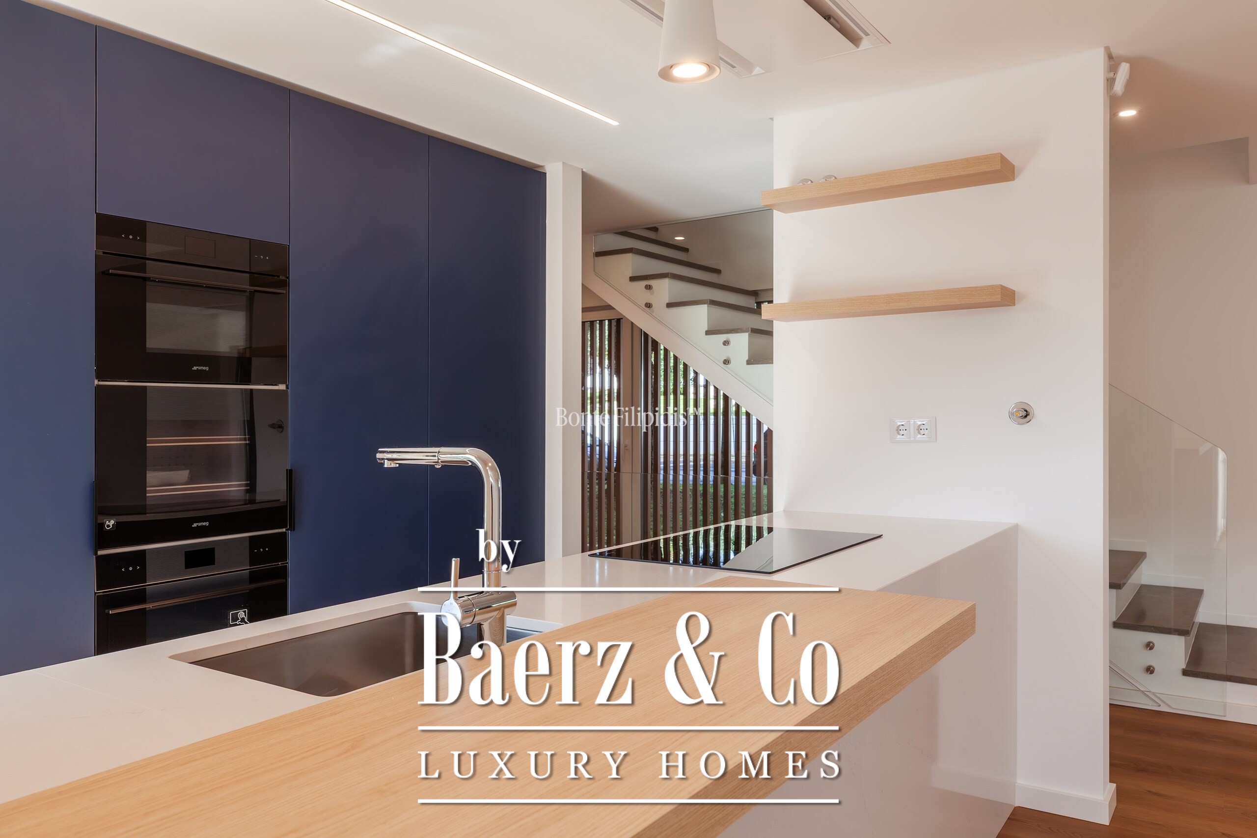 A top-floor multipurpose room with a full bathroom leads to a private terrace, offering a discreet retreat above the surroundings. The house features solar panels and electric underfloor heating in the bathrooms, while pre-installation for electric vehicle charging and a garage for three cars reflects modern priorities.