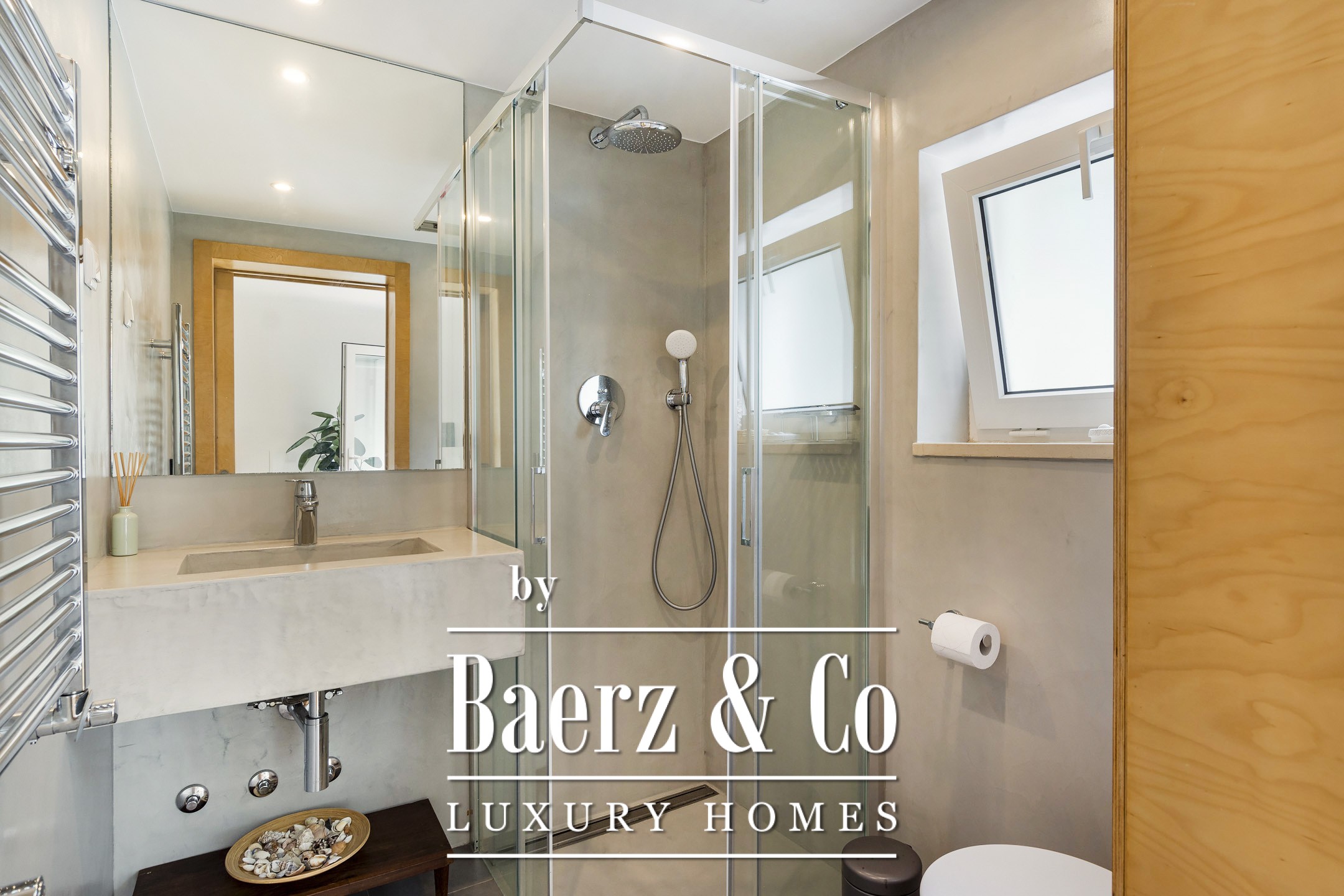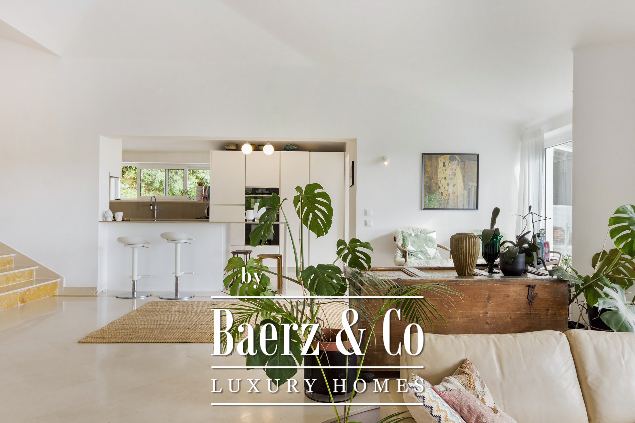 The principal floor introduces a large entrance hall with discreet storage, leading into a luminous living room divided into two intimate areas, completed by expansive windows and a fireplace. The home’s kitchen seamlessly connects to a terrace with panoramic sea views, perfect for quiet mornings or gathering with family.