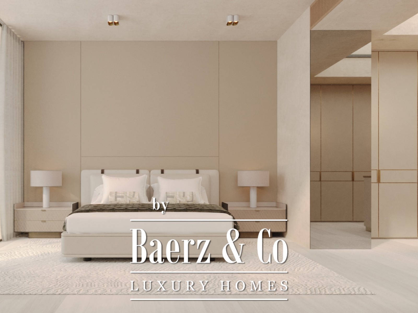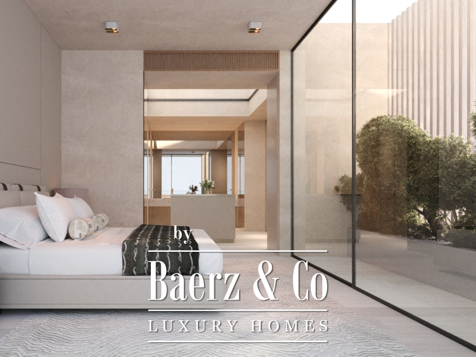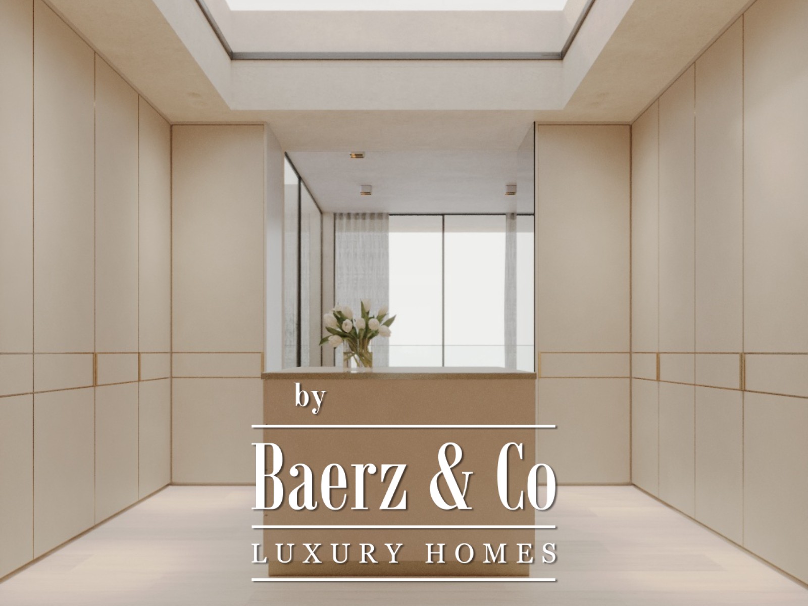 The lower level balances utility and leisure, featuring a spacious garage, a fully equipped gym, an indoor pool, a sauna, technical rooms and storage, as well as an informal living room and two bathrooms. The ground floor unfolds into an elegant living and dining area, a modern kitchen, home office, interior garden, and seamless access to an outdoor deck with a striking infinity pool—spaces that invite both relaxation and refined entertaining.