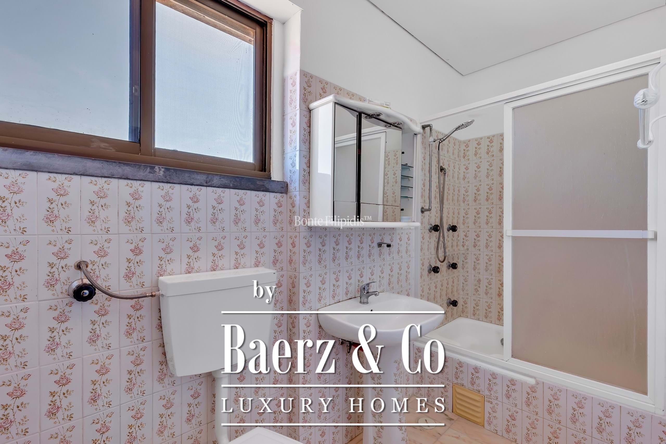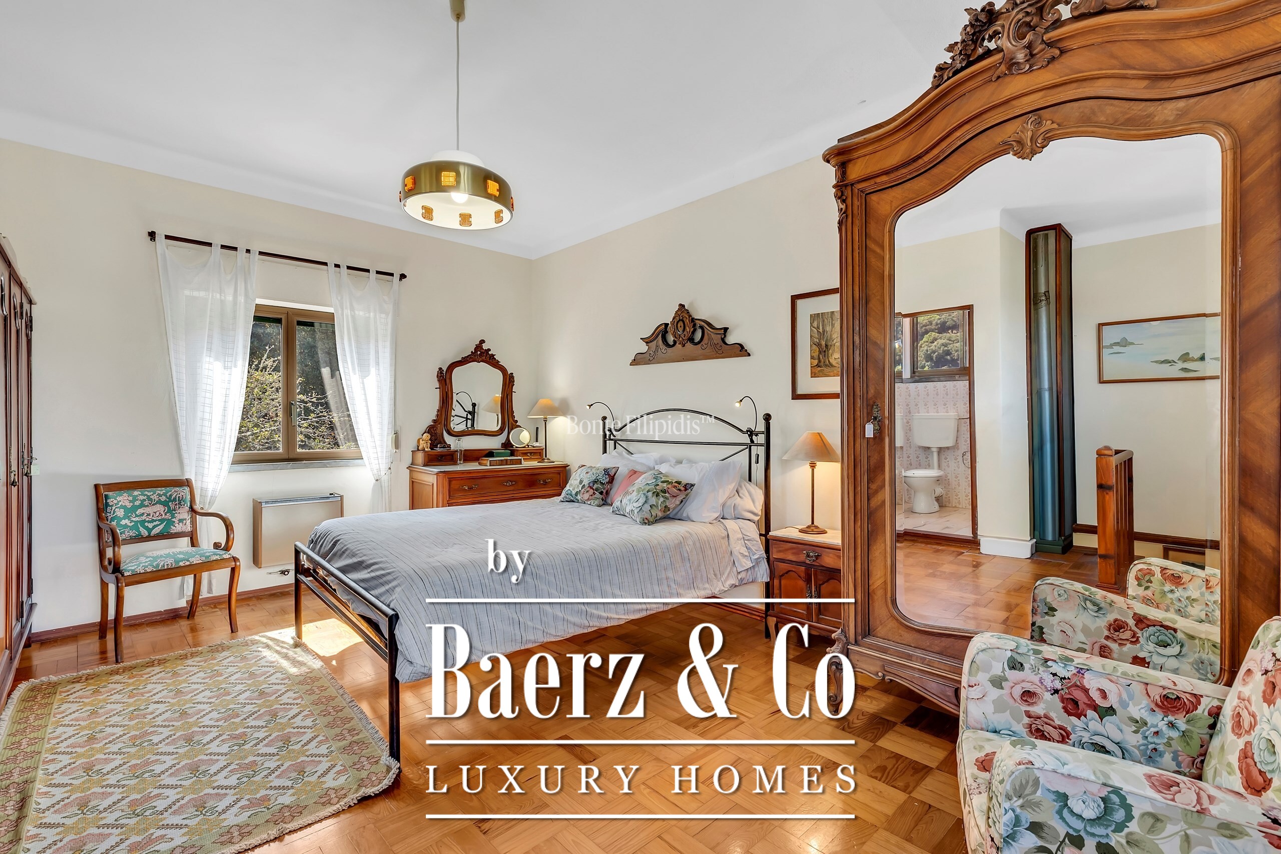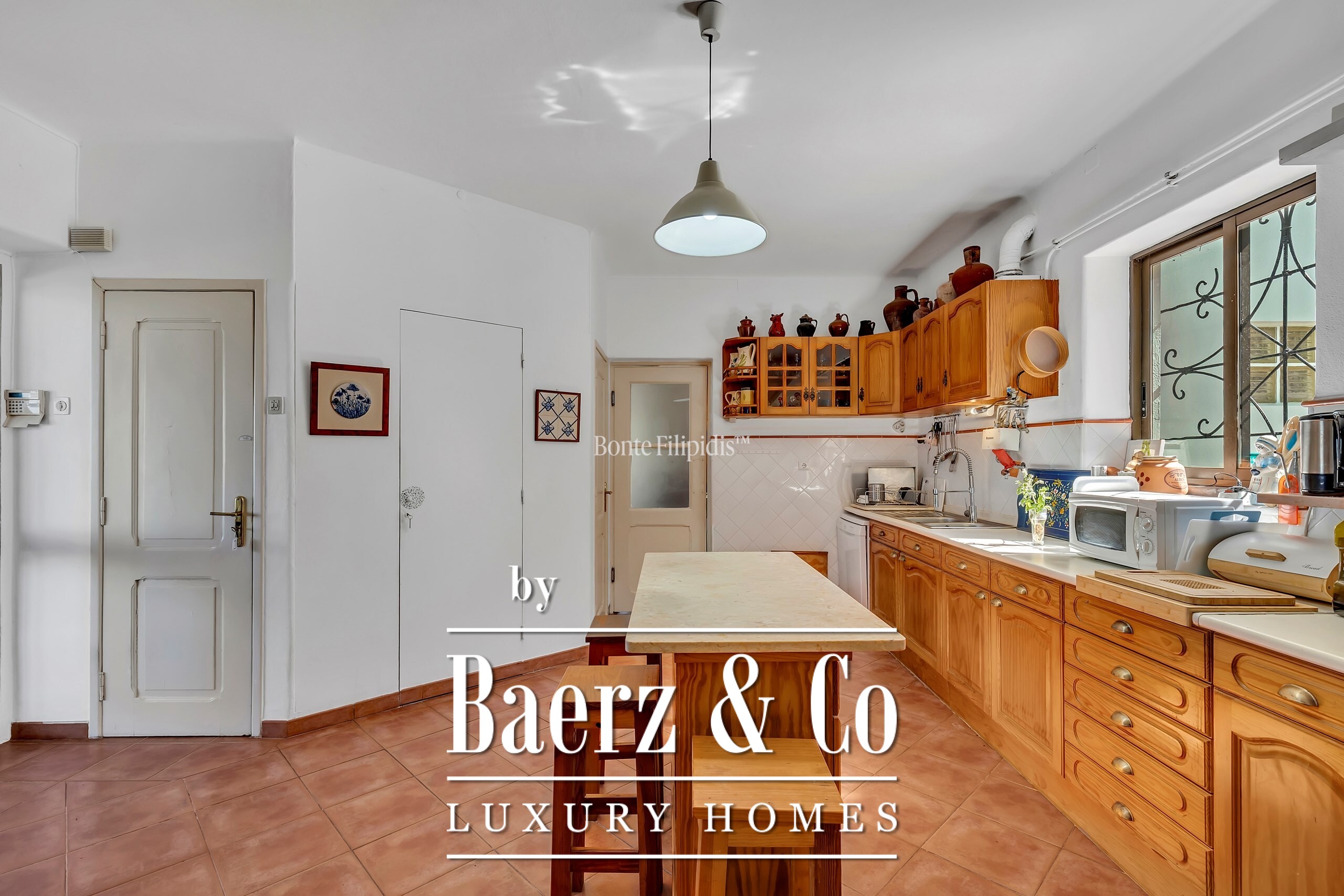 A quietly functional layout defines the interiors. Two distinct living rooms, one anchored by a fireplace, open onto a panoramic balcony, while a spacious kitchen, three bedrooms including a suite, and a dedicated playroom offer ample space for living and entertaining. Terracotta floors, double-glazed windows, and built-in wardrobes showcase traditional finishes and comfort. Thoughtful inclusions such as a wine cellar and generous entrance hall enhance the sense of arrival.