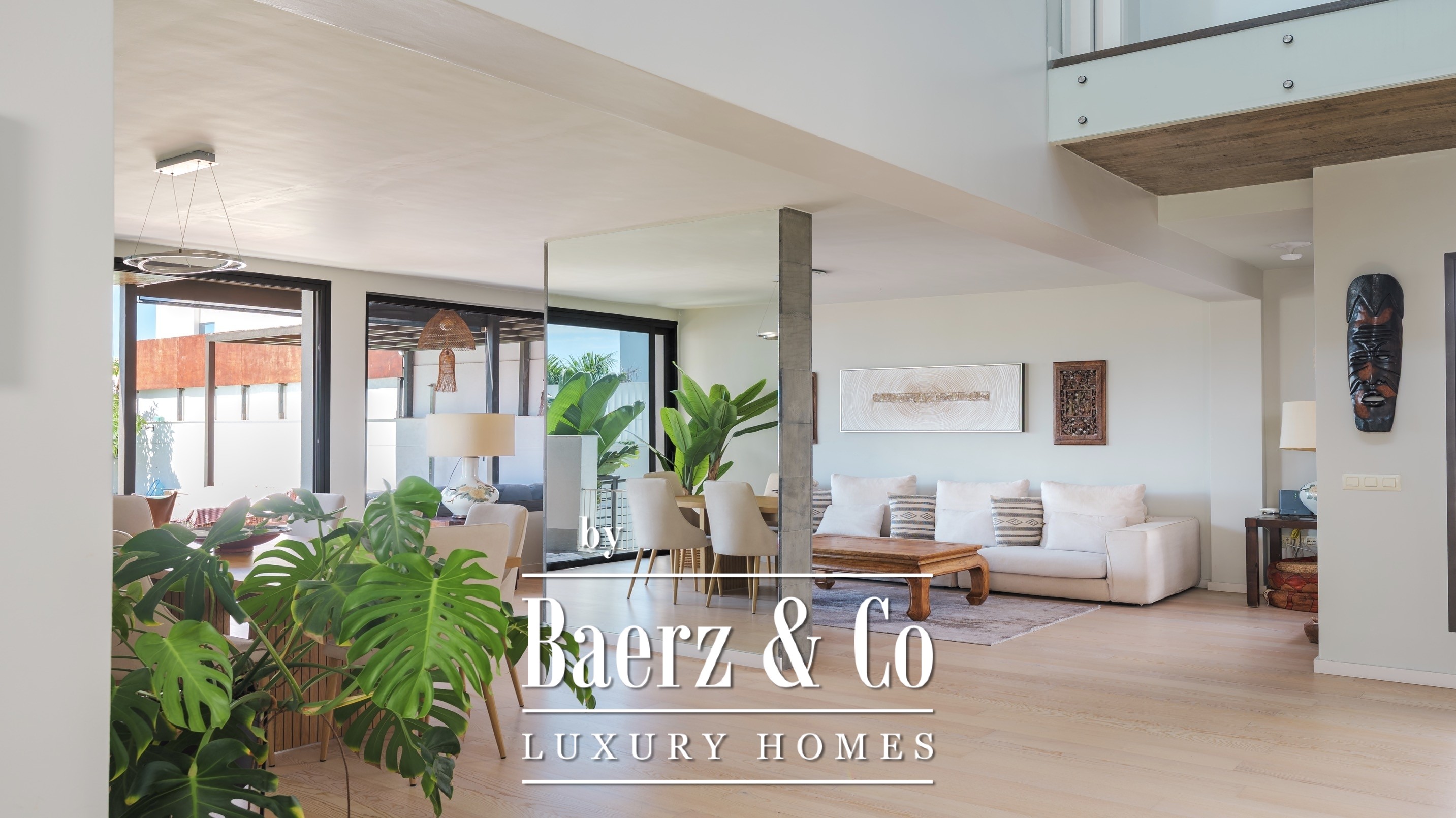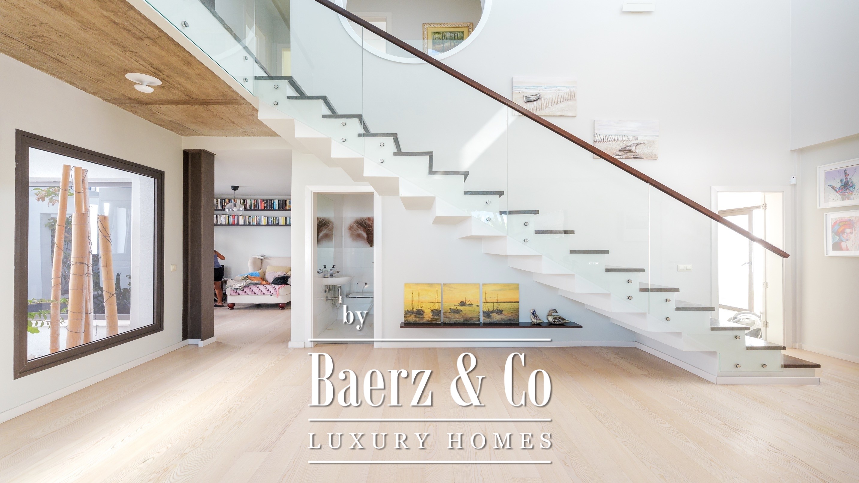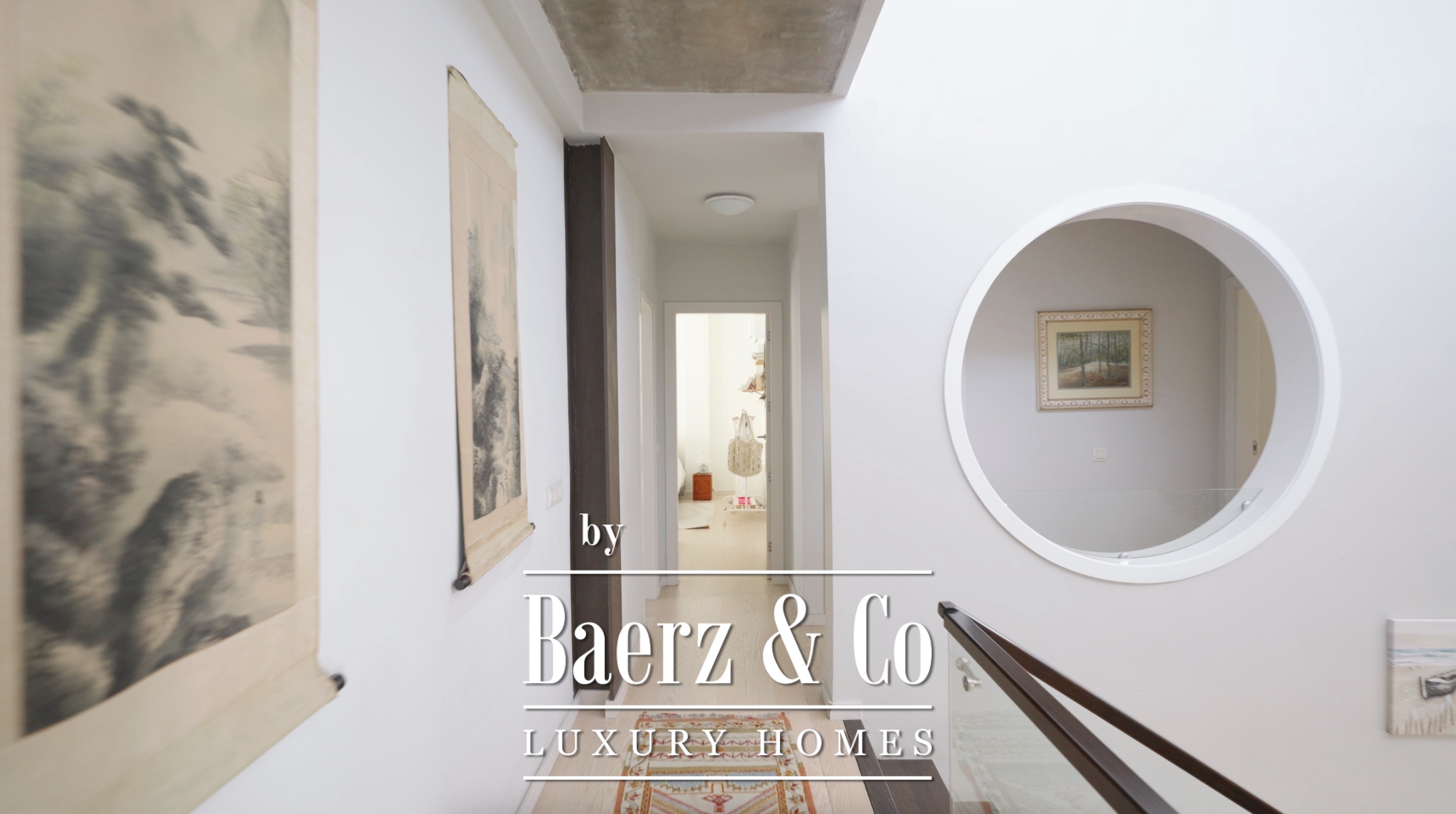 A private ramp leads to the main entrance, parallel to the garage access. Inside, the large living room with sea views is particularly striking, there is also an office with sea views, a guest toilet and a fully equipped separate kitchen with direct access to a large terrace and patio, ideal for al fresco dining.