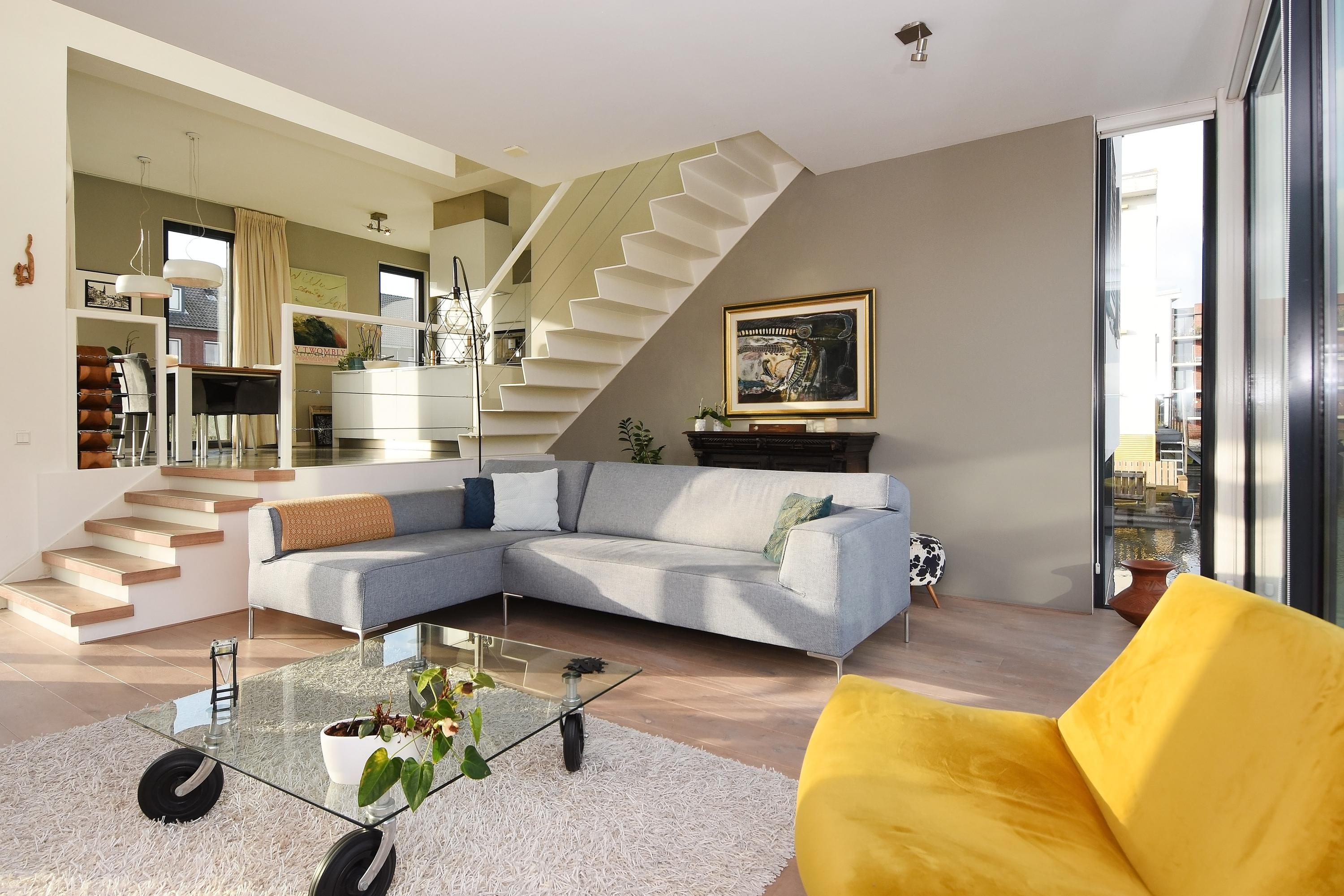 Upon entering this split-level home, you will be completely surprised by the playful layout, the amount of space and the abundant light pouring in through the large, tall windows. The comfortable and stylish kitchen is fully equipped with a cooking island, various built-in appliances and an ideal space for a generous dining area. From here, a short staircase leads down to a bright, cosy and spacious living room with a unique, unobstructed view of the water. Adjacent to the living room, you step directly onto a wonderful sunny floating terrace with an outdoor rain shower and swimming ladder, where you can enjoy the peace, freedom and sun for hours.