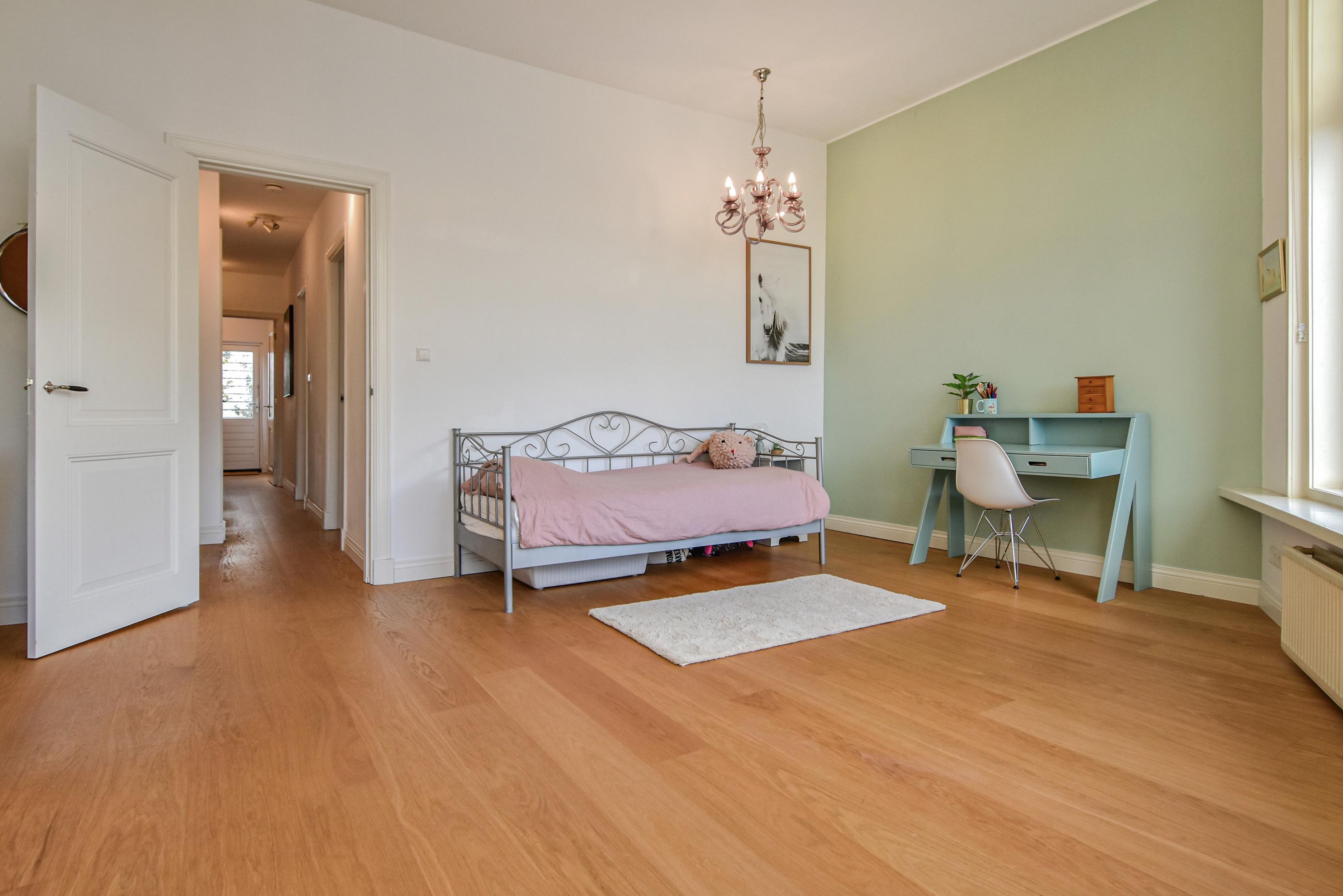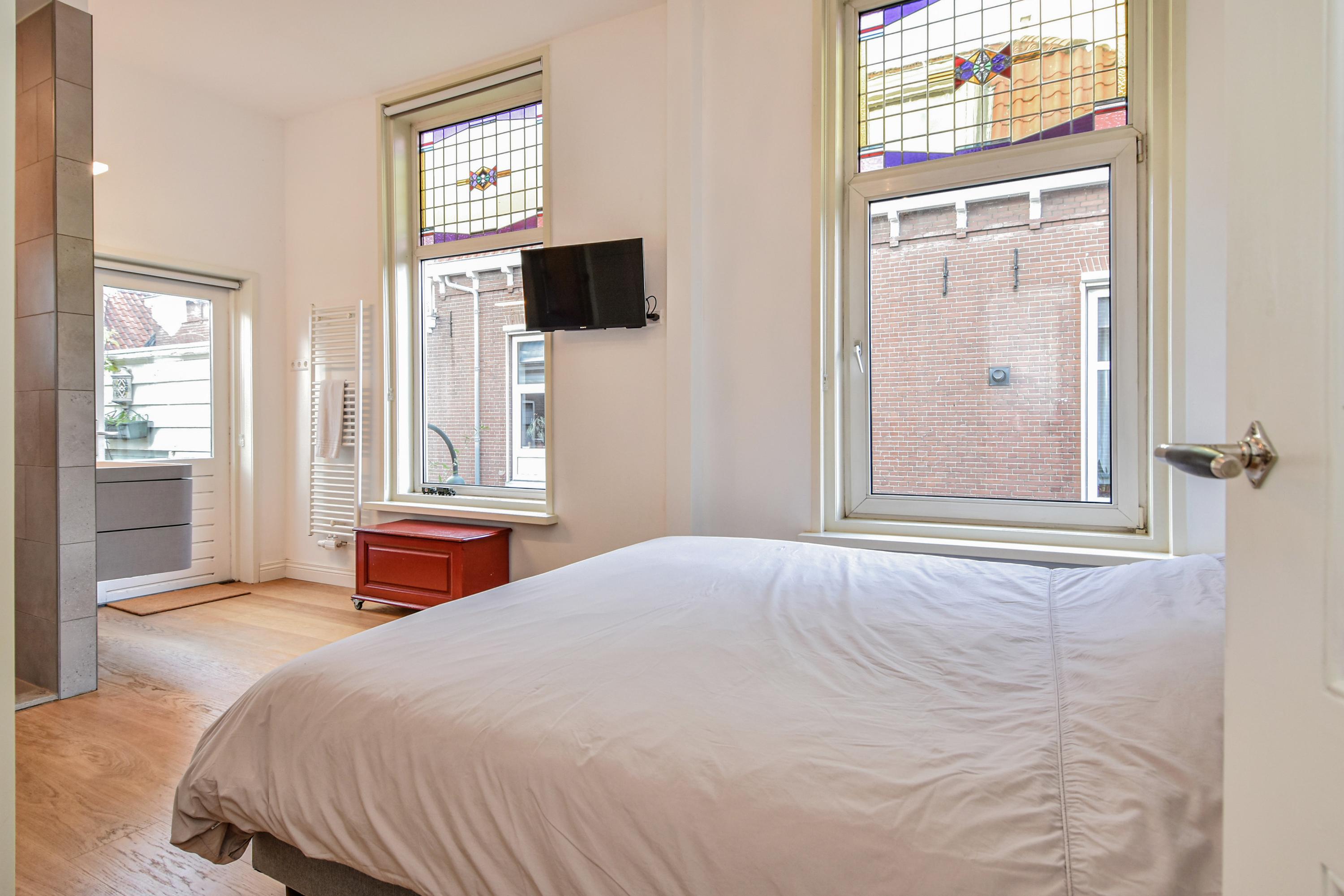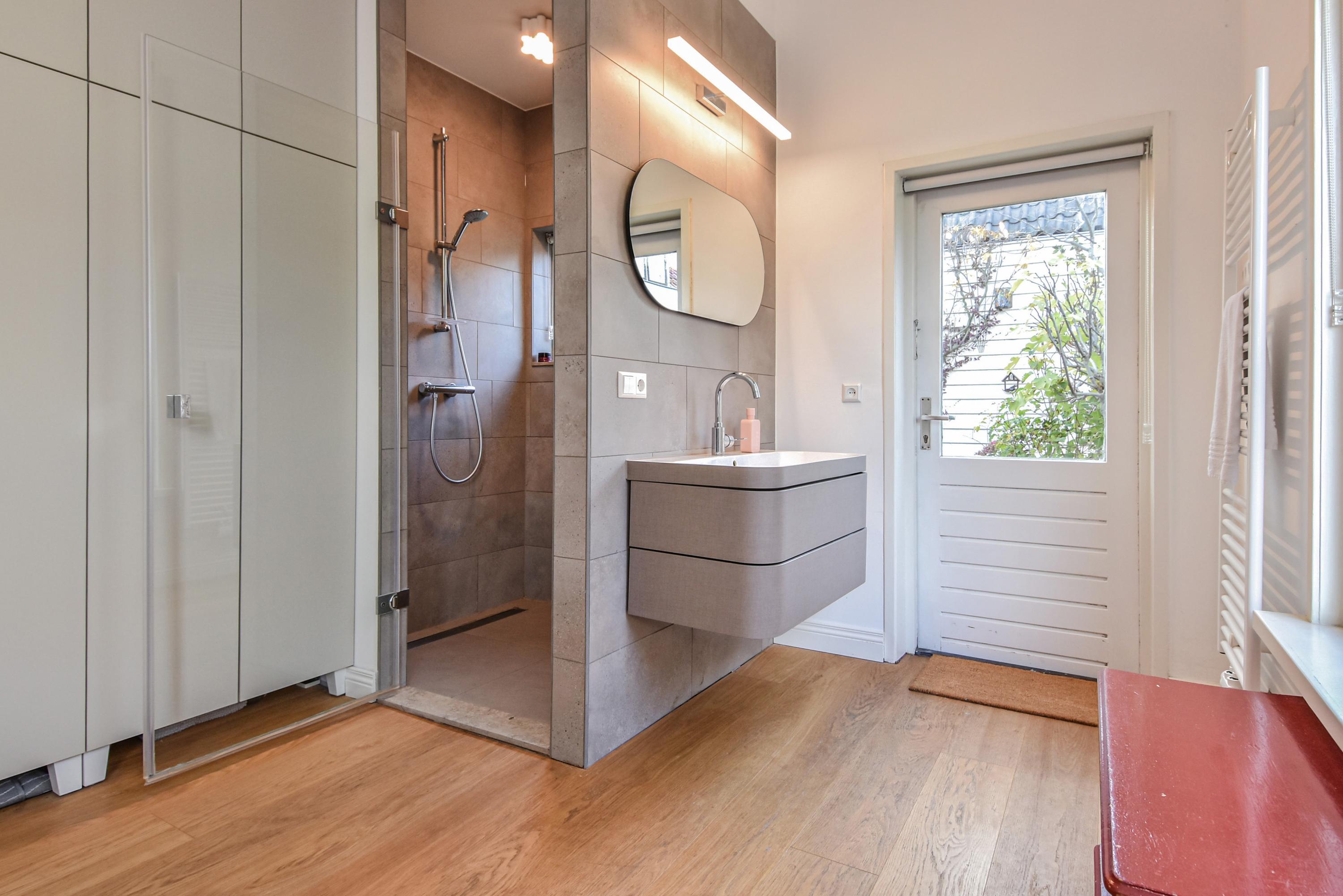On either side of the kitchen are two inviting living areas: on one side a sitting room, and on the other a cozy living room with a comfortable seating area. Adjacent is an integrated studio, also featuring a high ceiling and French doors opening to the street. This room is arranged as a bedroom with its own bathroom, including a walk-in shower, double washbasin, and toilet—ideal as a guest suite, annex apartment, office, or practice space at home. At the rear, there is a large, practical bicycle storage room with attic space, accessible via Broerhuisstraat. From the living room, a straight staircase leads to the first floor.