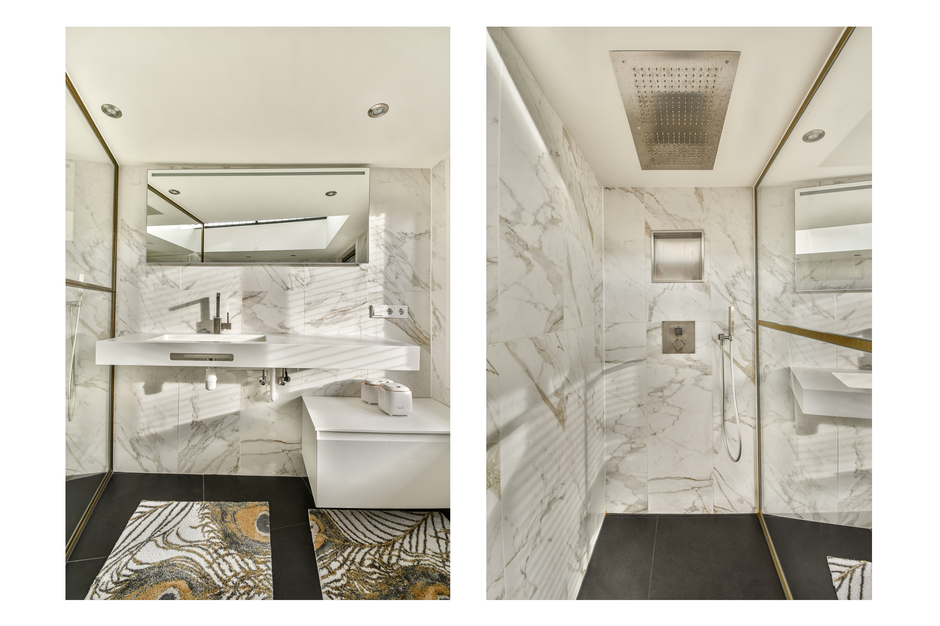 A luxurious bathroom benefiting from beautiful natural light, equipped with a bathtub, walk-in shower, and elegant vanity unit. A built-in cupboard houses the central heating combi-boiler.