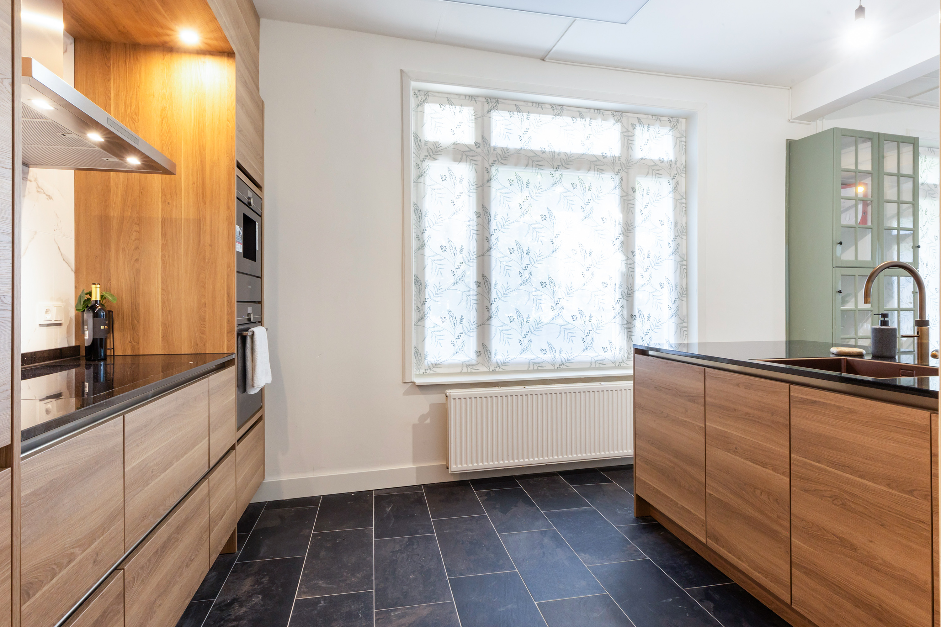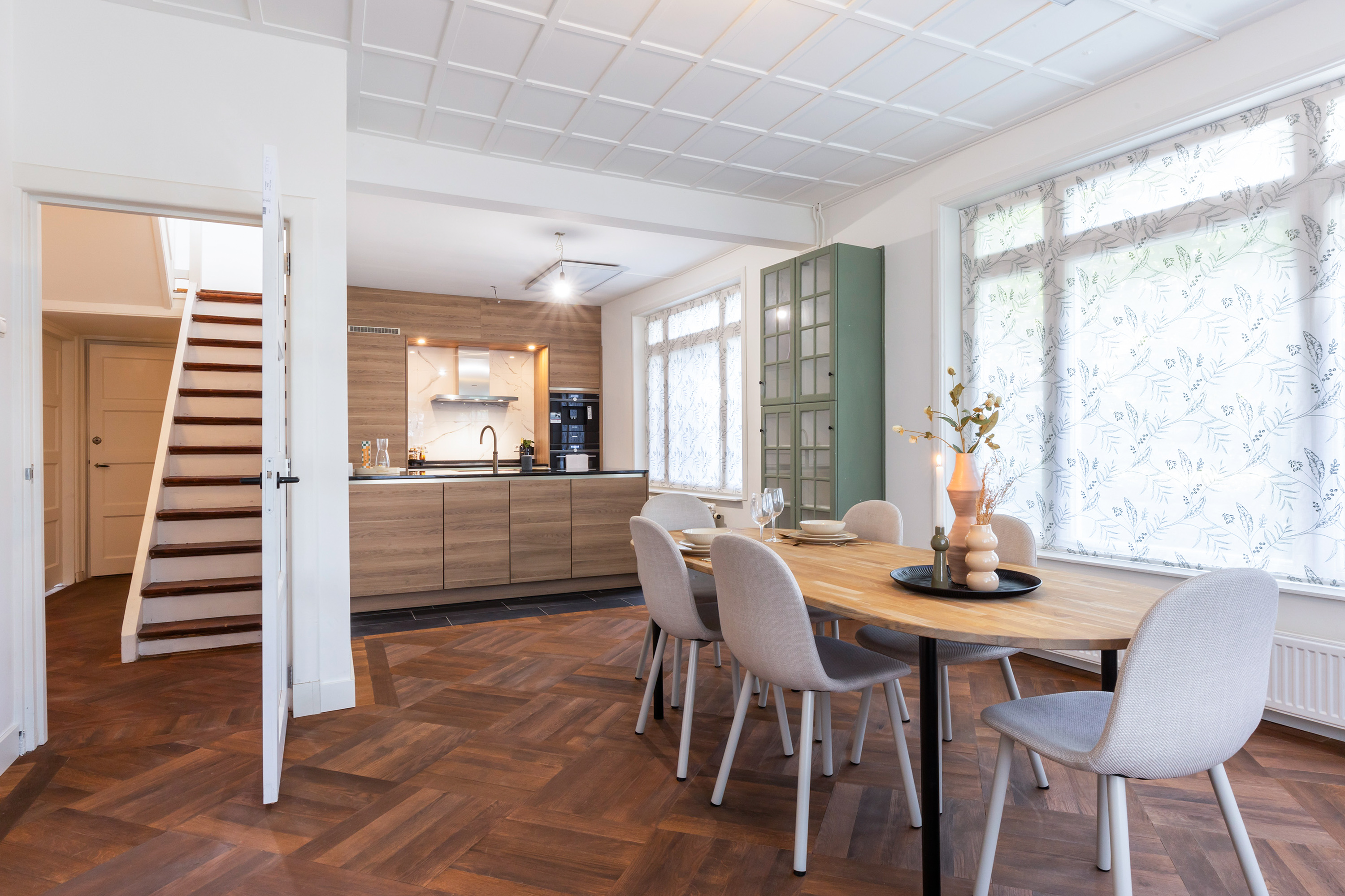 Inside, the atmosphere is warm, stylish and surprisingly spacious. The double front doors open onto a generous hallway with cloakroom space, access to the cellar and a modern toilet. From here you can reach both the kitchen-diner and the en-suite living rooms.