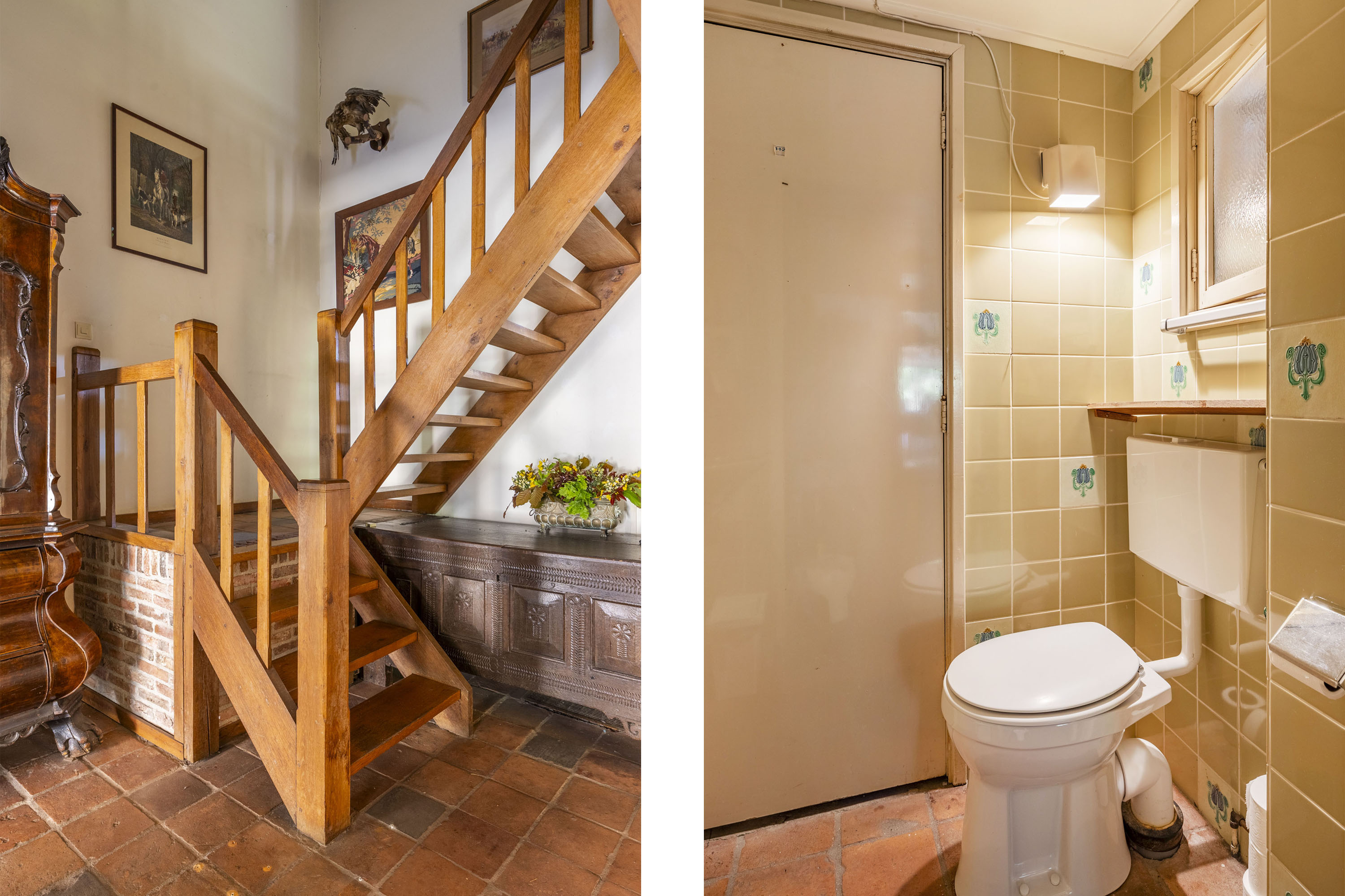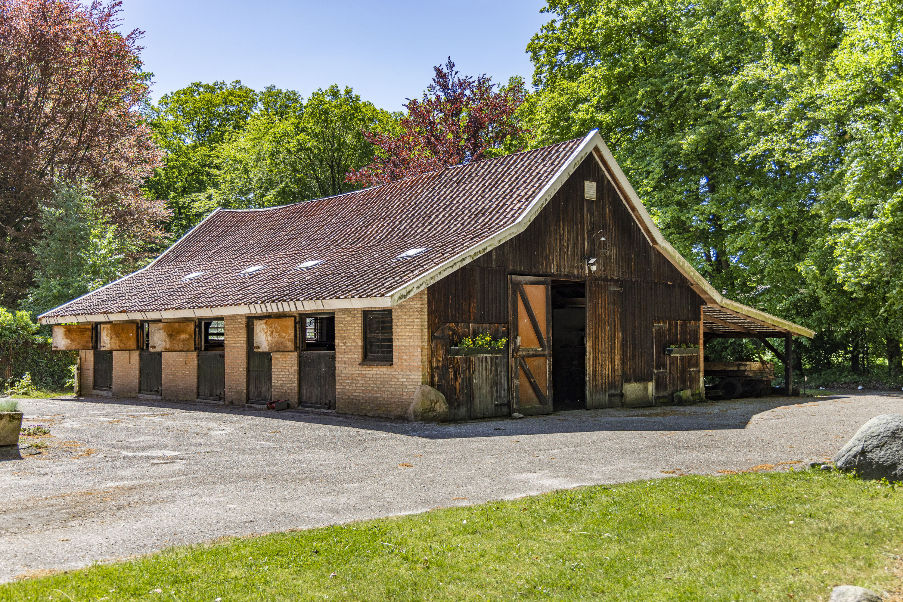 The back of the farmhouse remains structurally original, featuring beautiful wooden beams and a traditional stable door (the so called ‘niendeur’). Where cows once stood, there are now five horse stables, a tack room and additional facilities including an office, shower and laundry connections.