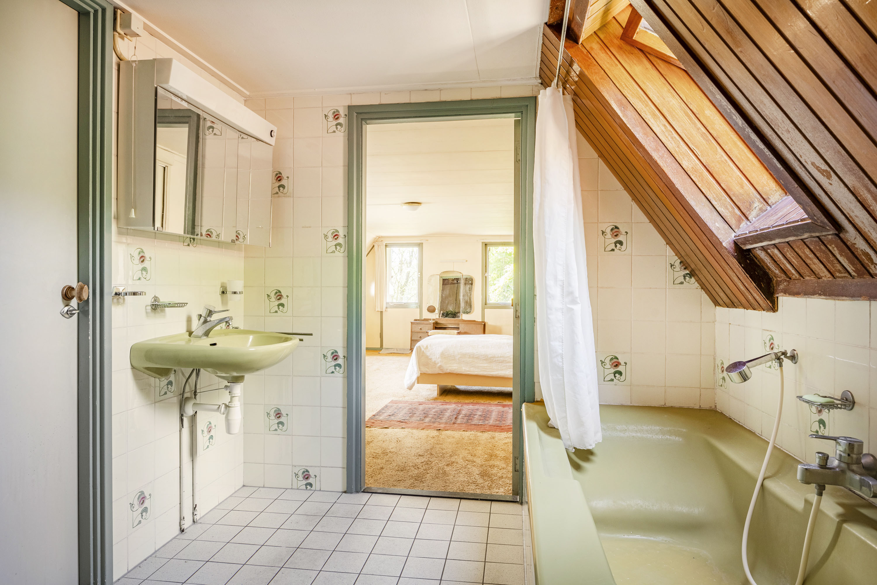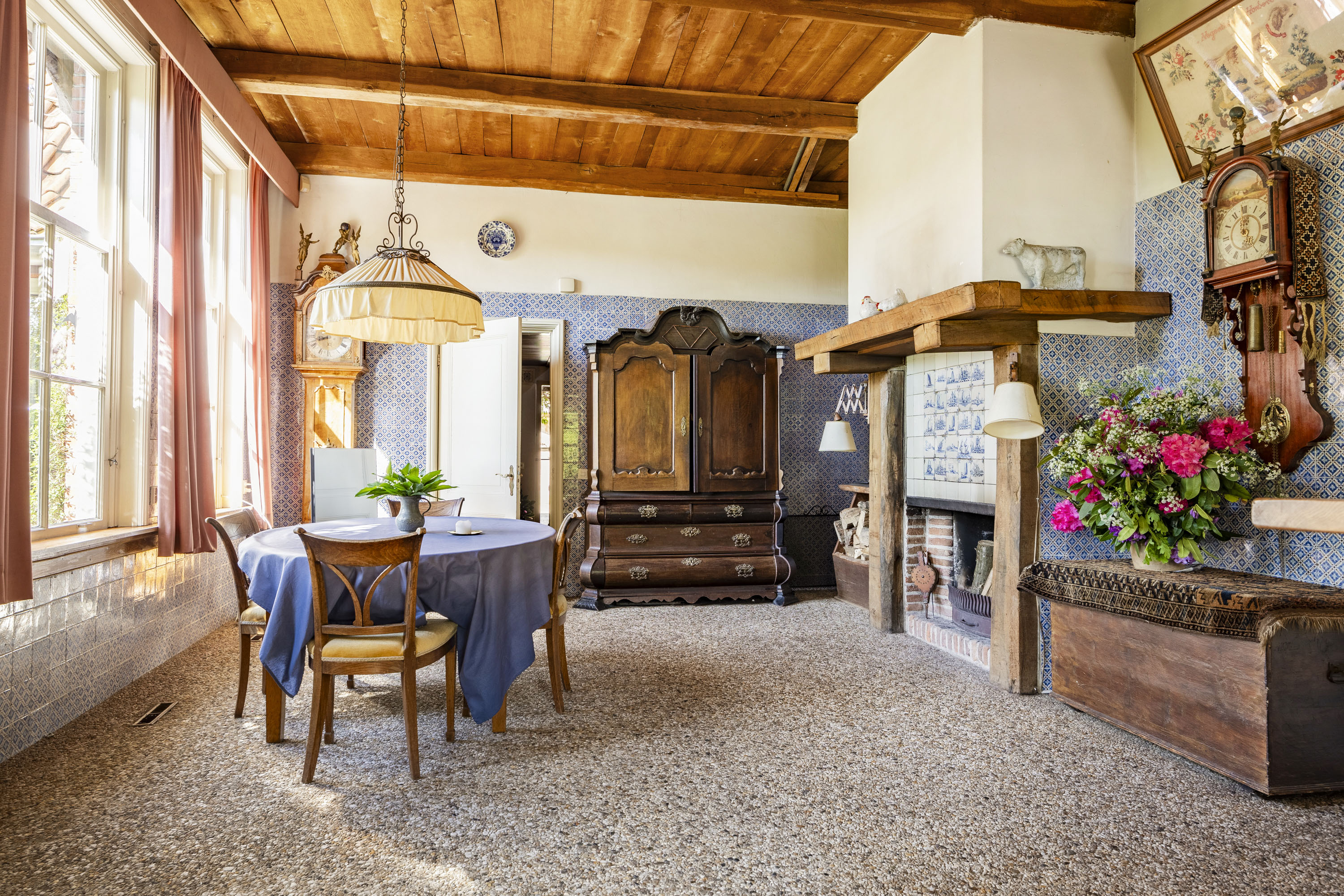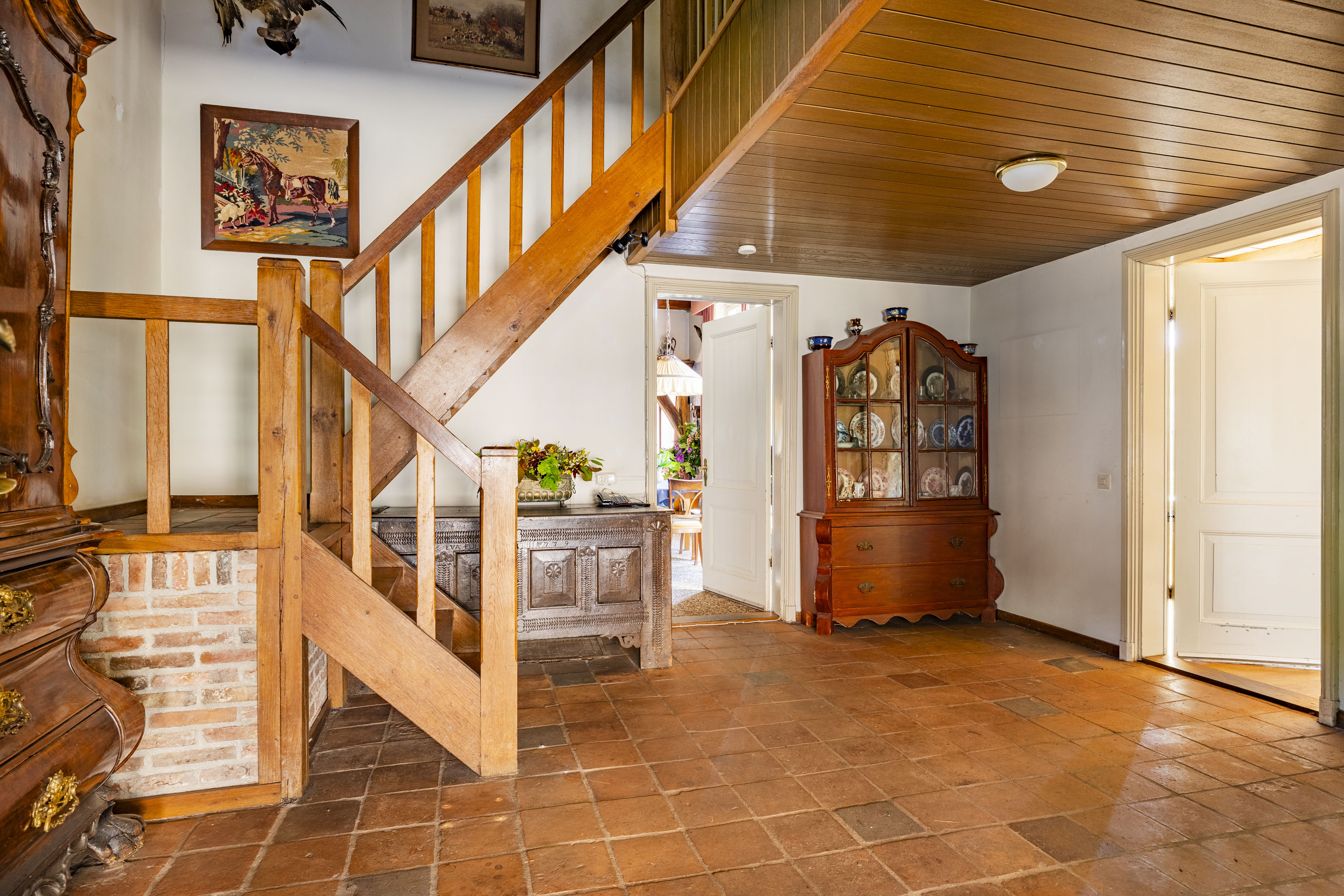 A covered entrance, made of Bentheim stone, leads into a bright hallway with a tiled floor. The hallway provides access to the staircase, guest toilet, a country-style kitchen and a spacious living room in the traditional “endskamer”. Both the kitchen and the endskamer offer views of the scenic Twente countryside, while fireplaces create a warm, intimate atmosphere.