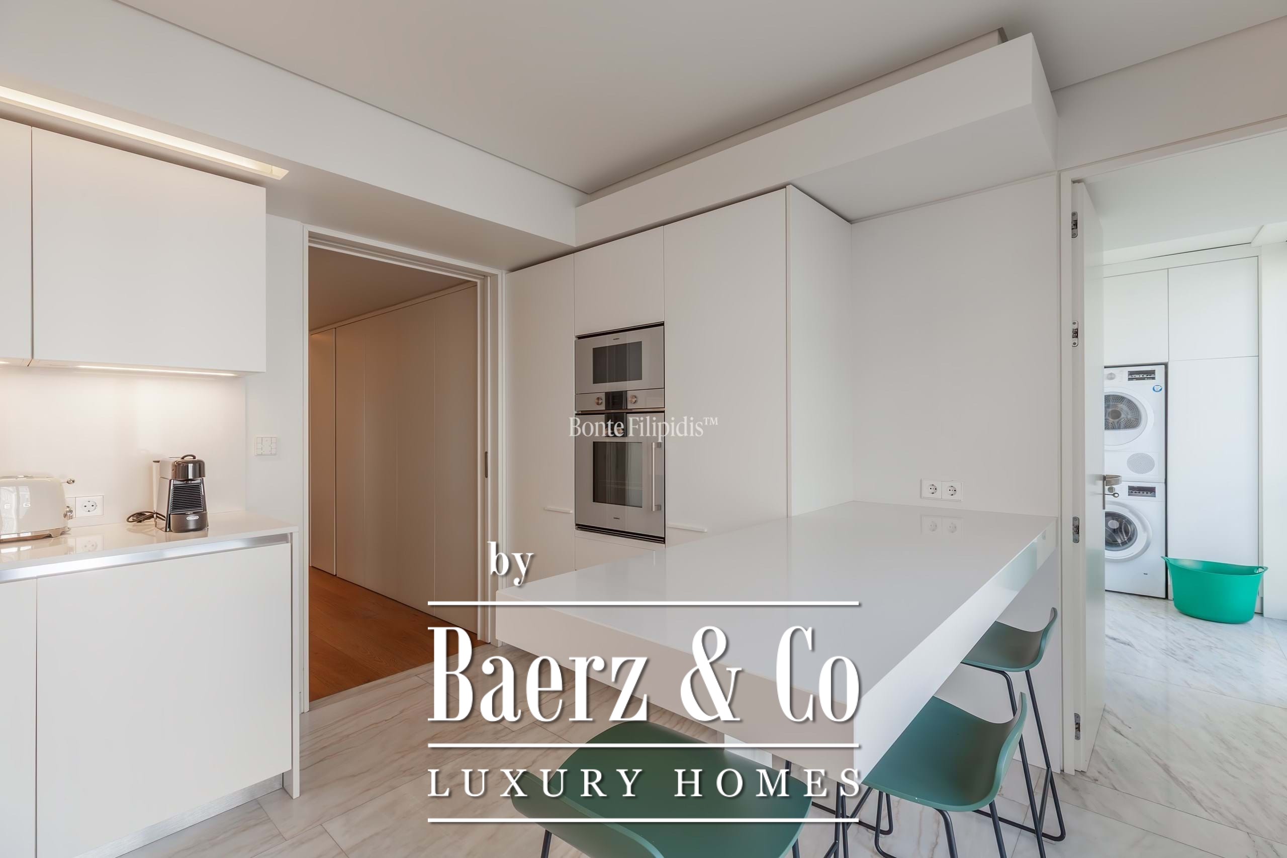 The apartment’s open-plan living and dining area extends directly to the terrace, forming the core of its social rhythm. The contemporary kitchen is fully equipped, with a dedicated laundry area and ample storage, blending utility with understated style. Two of the four bedrooms are suites, with the master featuring a walk-in closet, abundant natural light, and direct terrace access. The private zone balances quiet retreat and generous proportions, while considered wood panelling and curated furnishings shape an atmosphere of warmth and discretion.