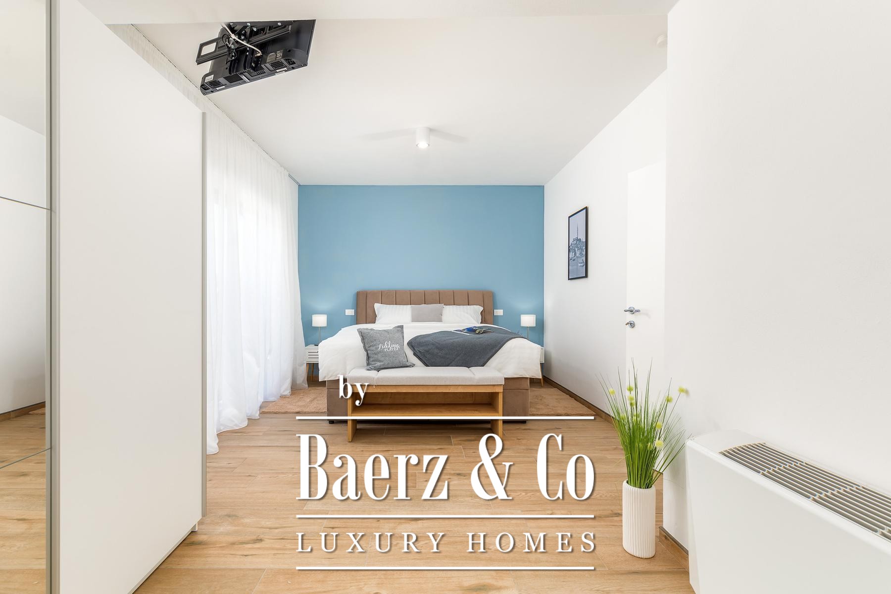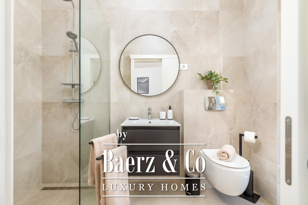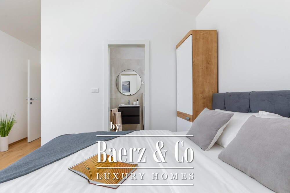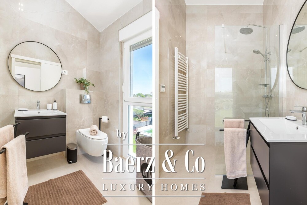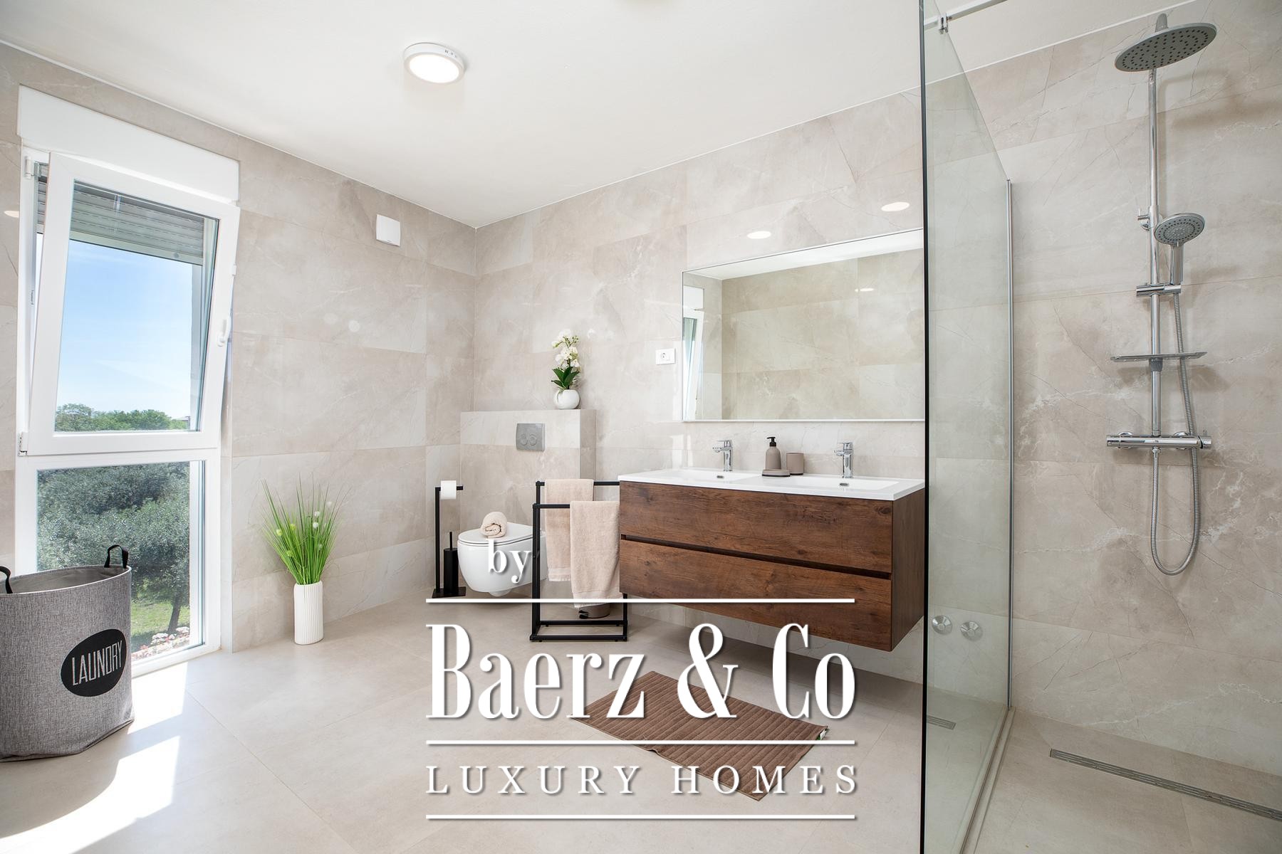 The top floor hosts an additional bedroom with access to a 40 m² terrace that offers sweeping views of the Brijuni archipelago. This level also includes a dedicated gym area and sauna, maintaining the villa’s refined focus on wellbeing. With five bedrooms and five bathrooms, solar panels, underfloor heating, and a heat pump system, the villa unites efficiency and comfort.