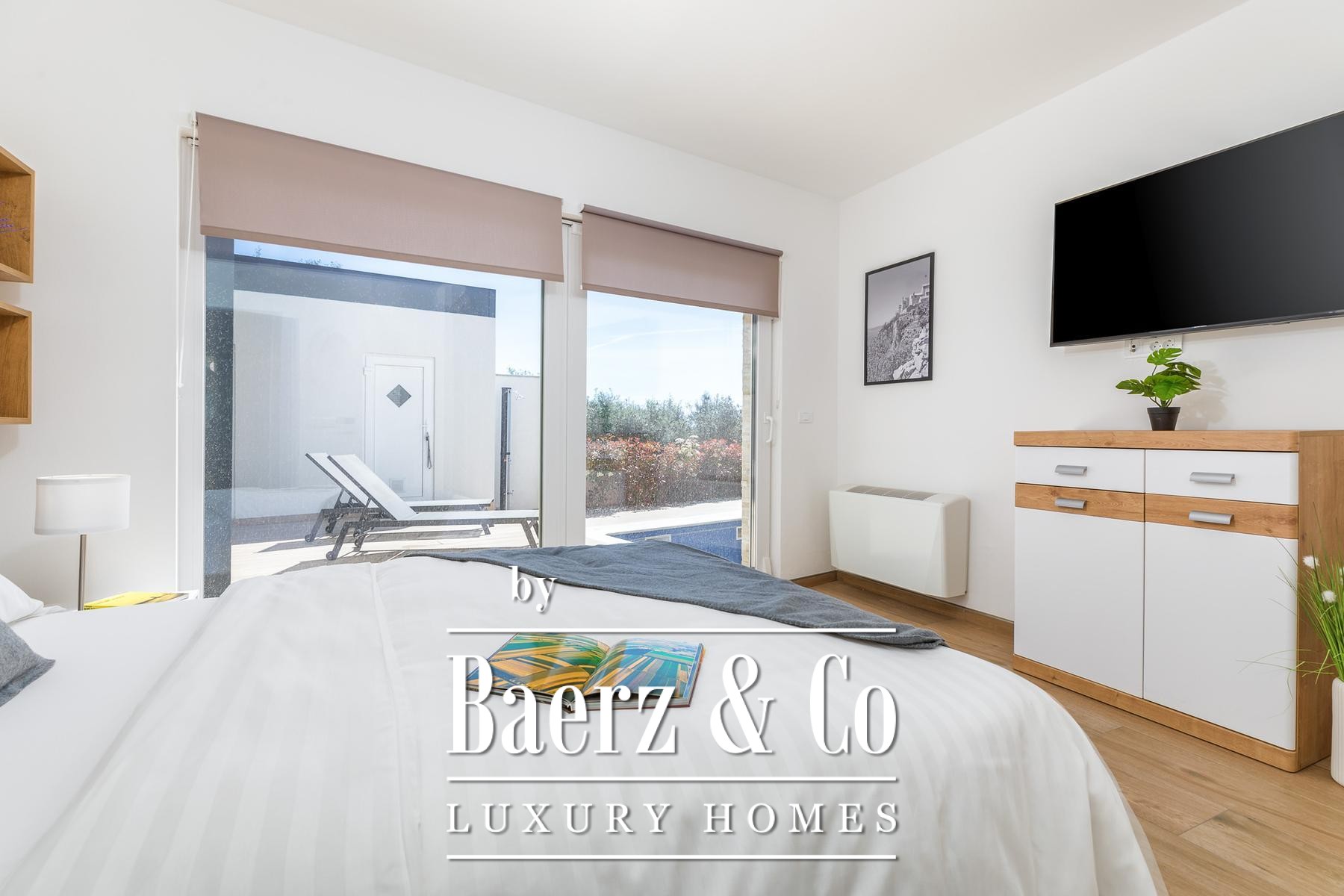 Mediterranean plantings and an automatic irrigation system frame the pool, while four private parking spaces welcome residents home. The villa is a brief walk or drive from the centre of Fažana, connecting privacy with the rhythms of coastal life.