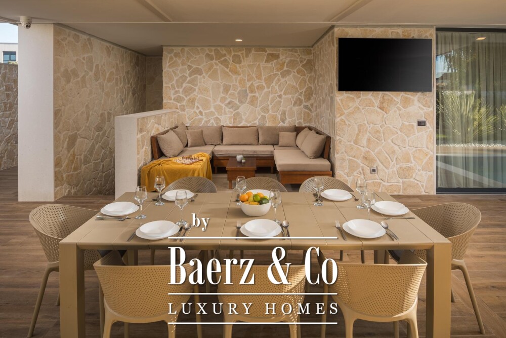 Villa Funtana with pool and roof terrace stands in the heart of Istria, drawing a quiet line between contemporary design and relaxed coastal living. This villa in Funtana comprises 330 m² of living space on a 750 m² plot, just five minutes from the Adriatic shoreline. The modern architecture features an open ground floor where a glass wall connects the living room and dining area to a striking 50 m² swimming pool, creating a luminous core that defines the home’s atmosphere.
