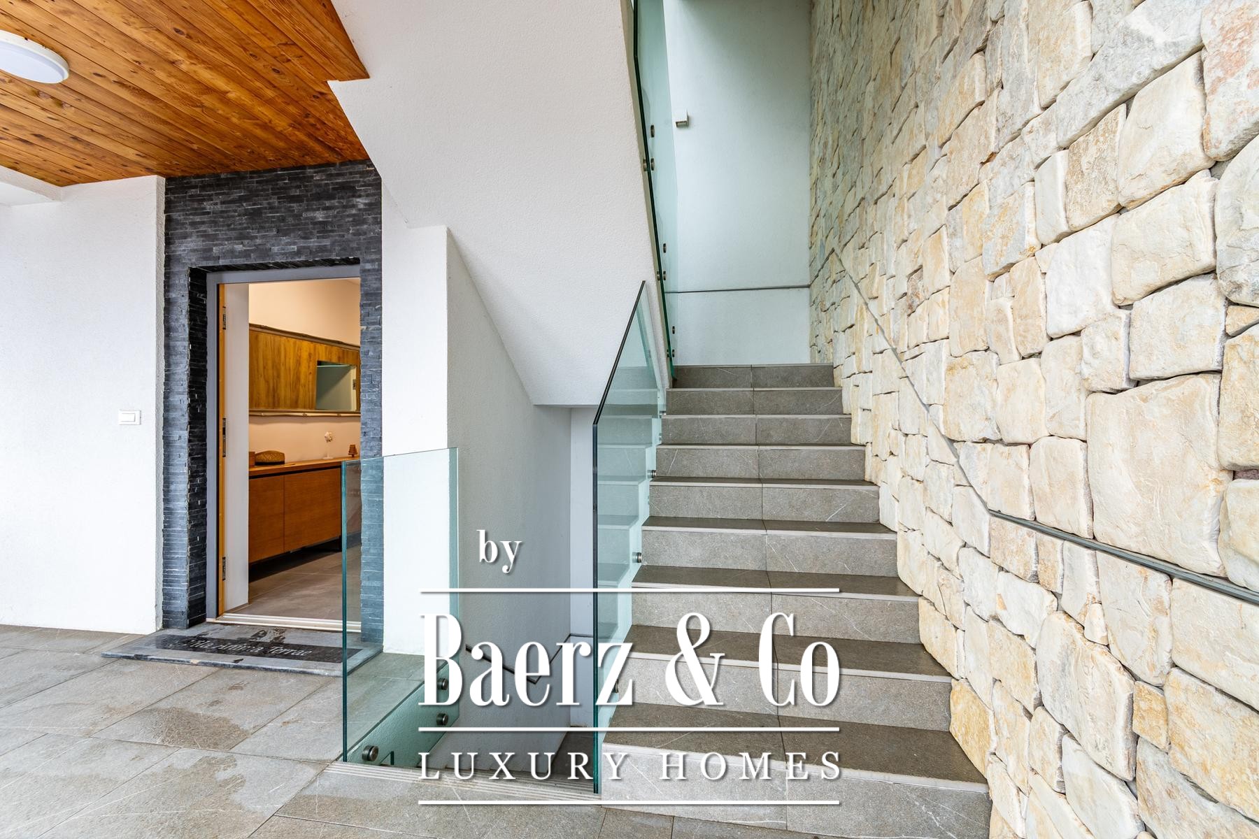 The villa’s architecture flows effortlessly between its three levels. The ground floor features an open kitchen, dining, and living zone, anchored by a fireplace and opening onto a broad terrace that welcomes natural light. A bedroom and bathroom with WC complete this floor. On the first level, a separate entrance leads to two bedrooms, a spacious bathroom, and a flexible kitchenette and living arrangement, with another terrace that frames the scenery. The finished basement provides a private sauna, wine cellar, and garage, grounding the home in quiet luxury.