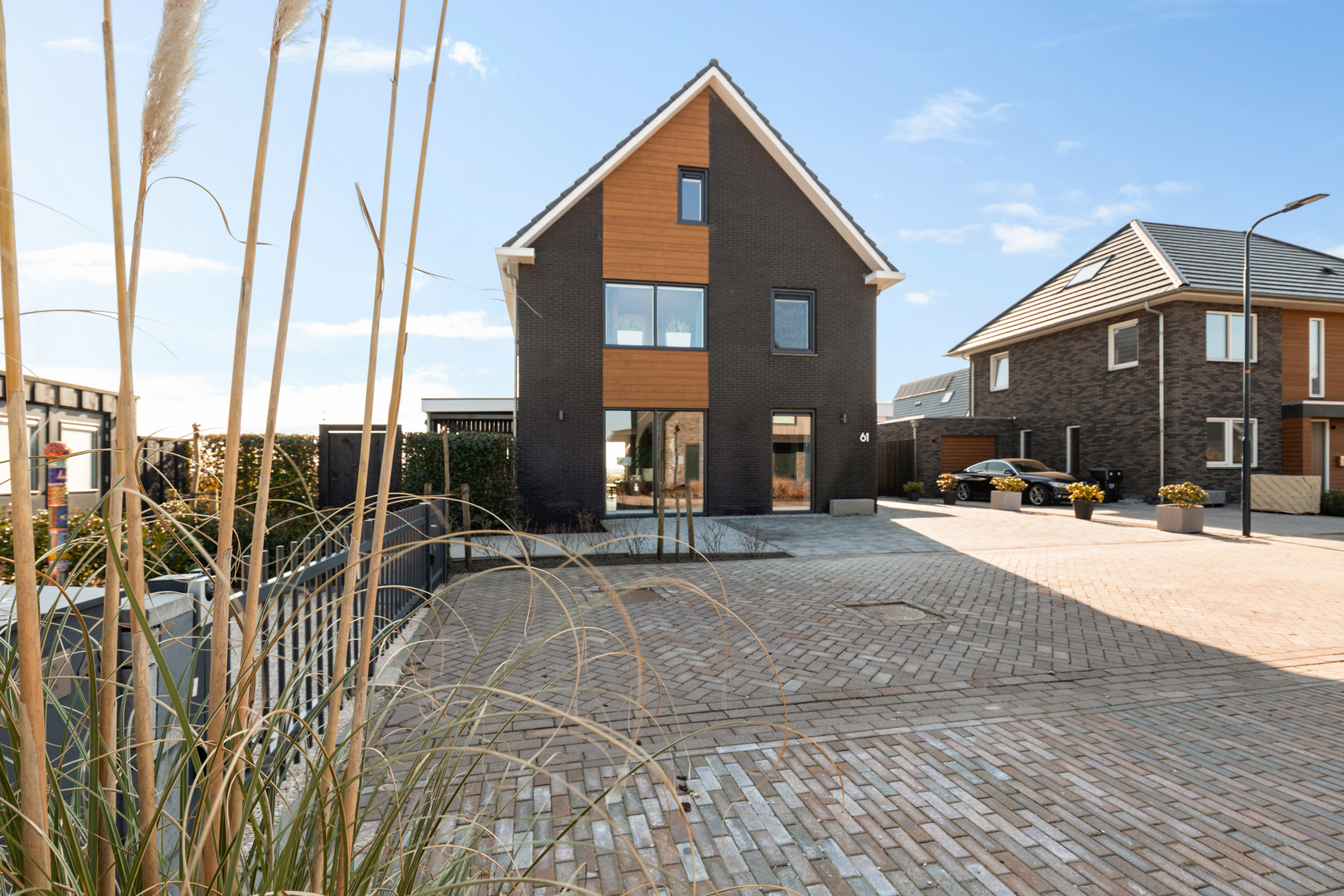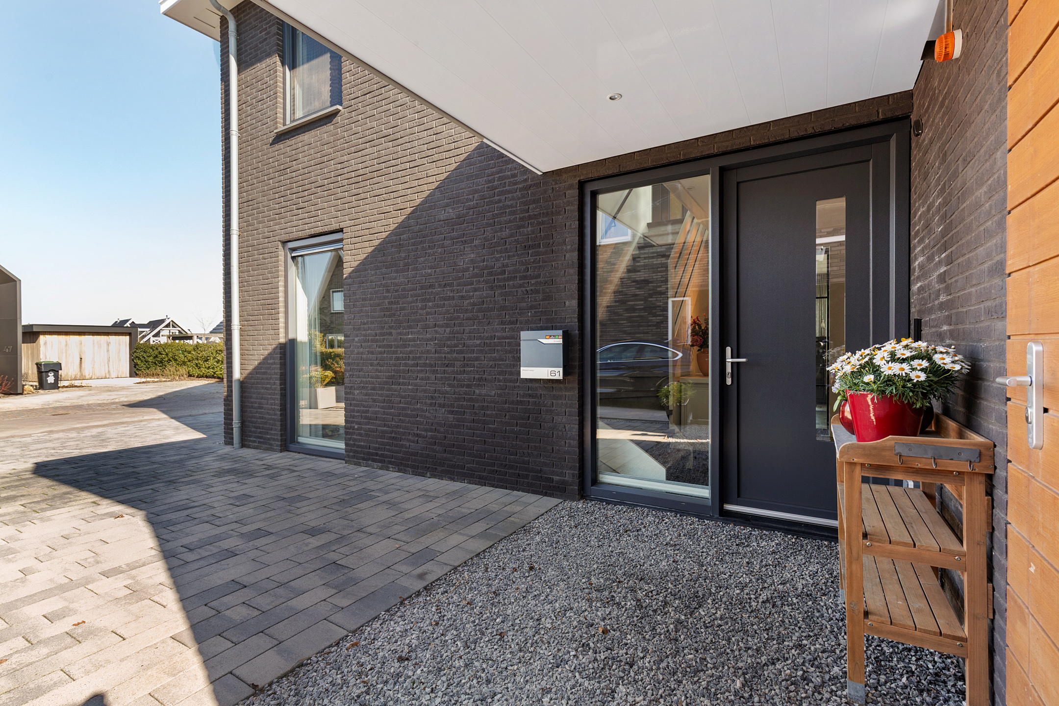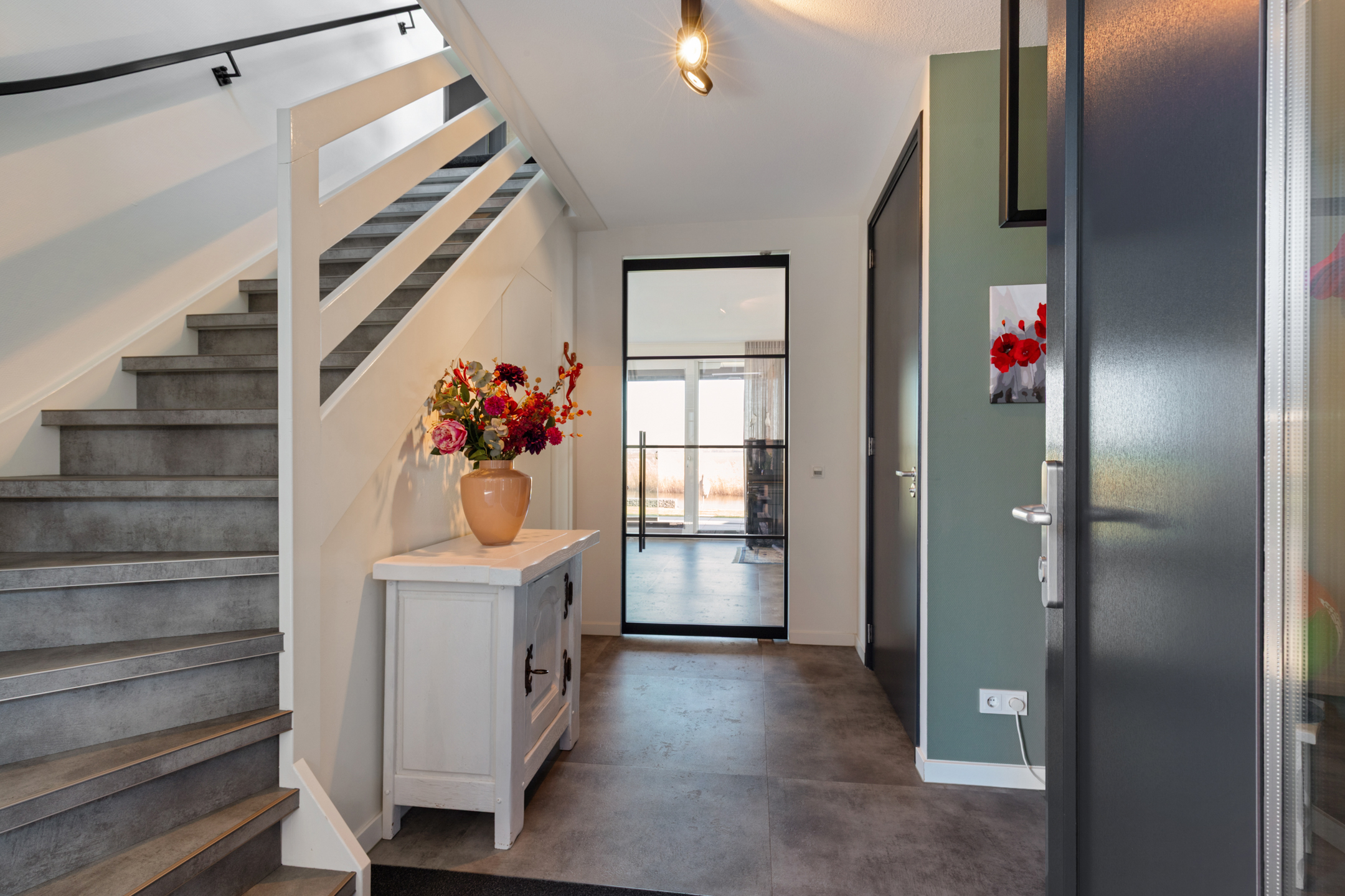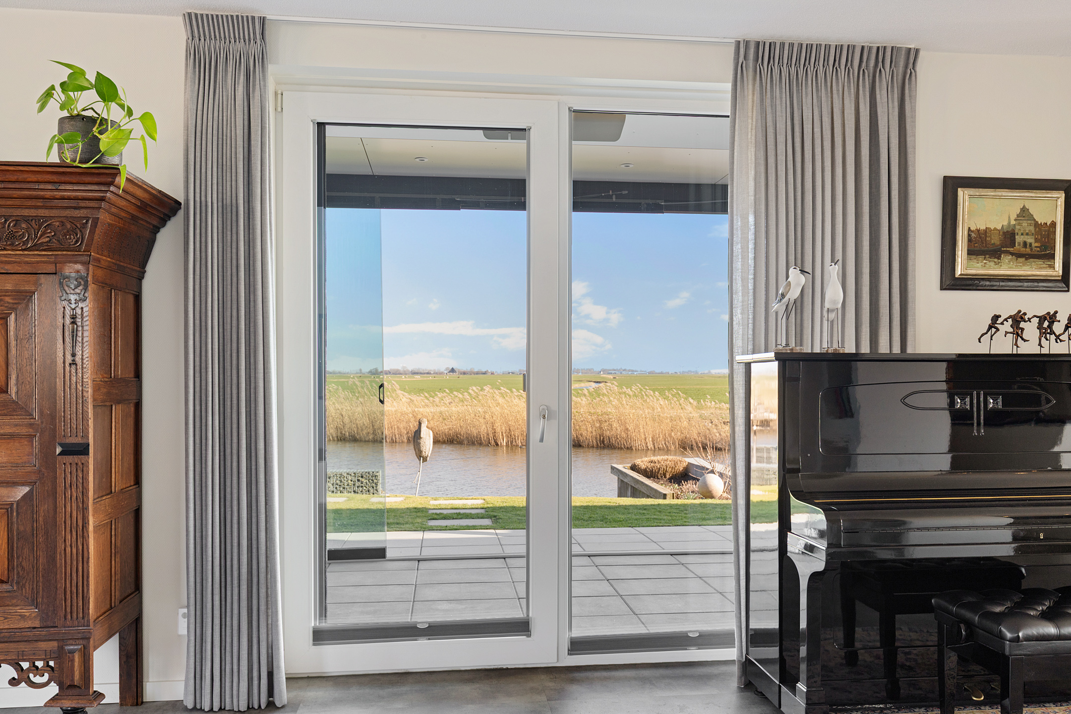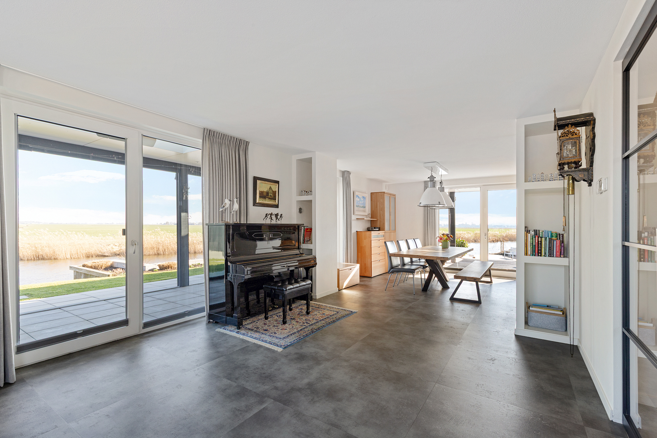 Through the covered entrance, you enter a spacious hall with staircase, guest toilet, and meter cupboard. A glass pivot door provides a beautiful sightline through the living room to the water and open fields.