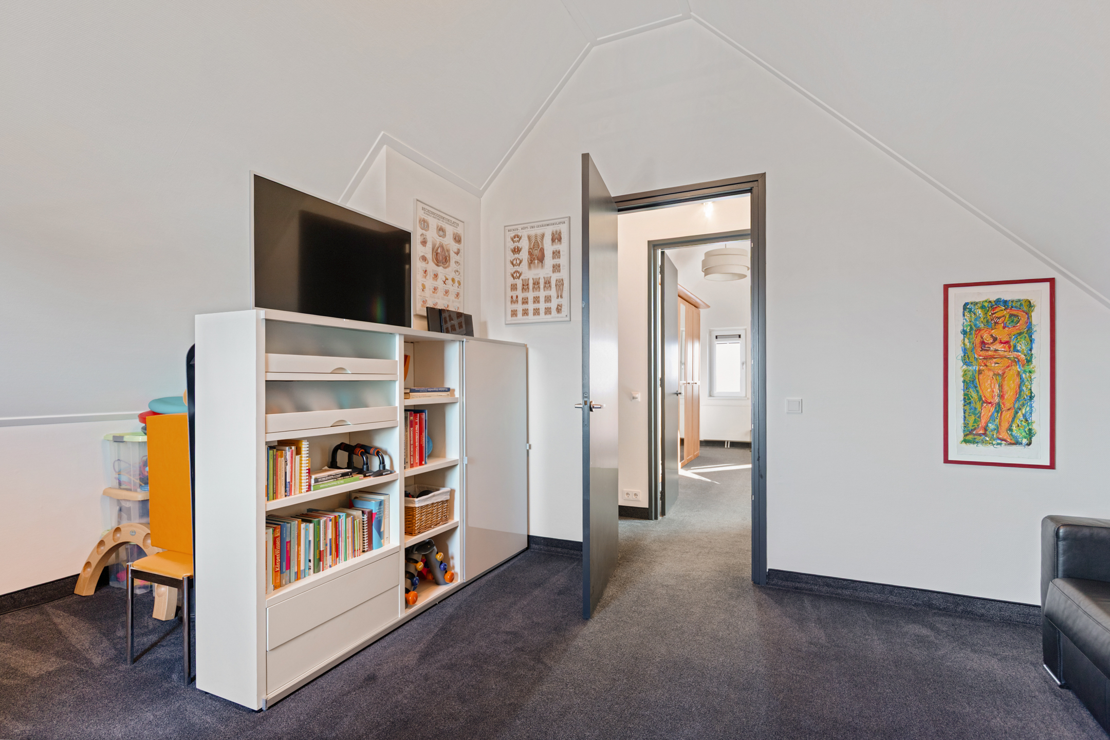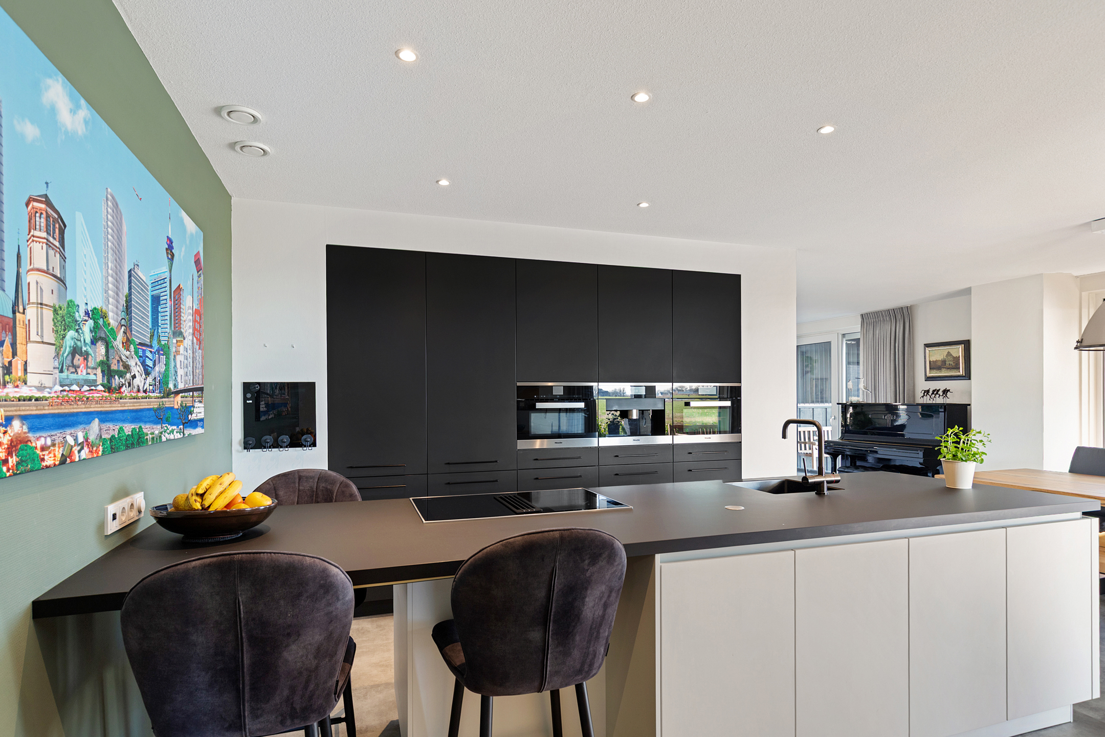 The open kitchen is generously sized and features a cooking/cleaning island and a wall of built-in cabinets with Miele appliances, including a coffee machine, combination microwave oven, combination steam oven, fridge, freezer, and plenty of storage. A hot-water cooker and an induction hob with integrated extractor are also included. The kitchen provides direct access to the spacious utility room with laundry facilities at work height, garden access, and a connection to the garage with heating room. The ground floor has a PVC floor with underfloor heating.