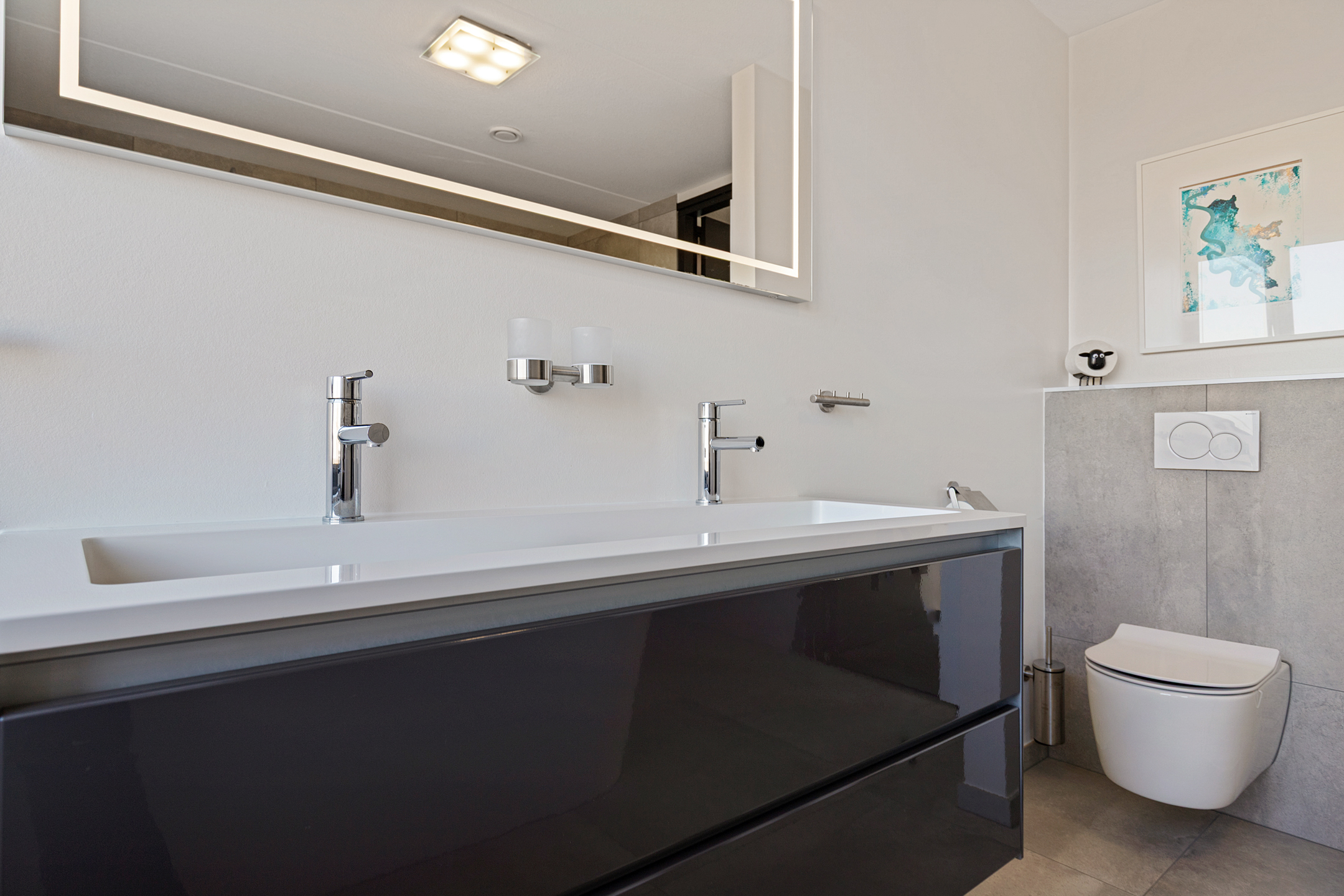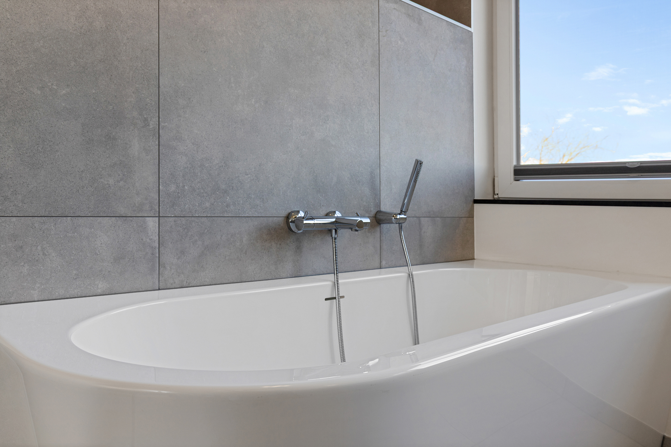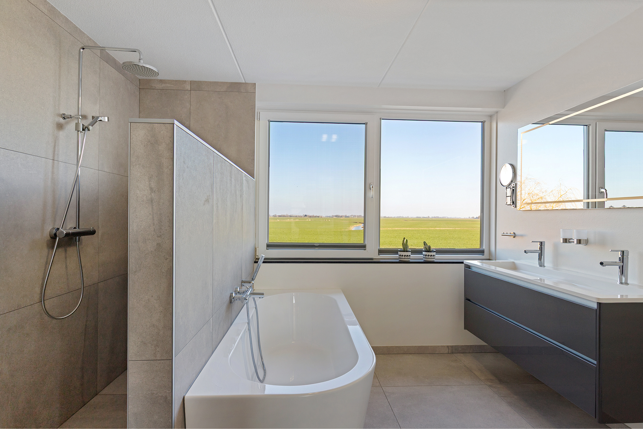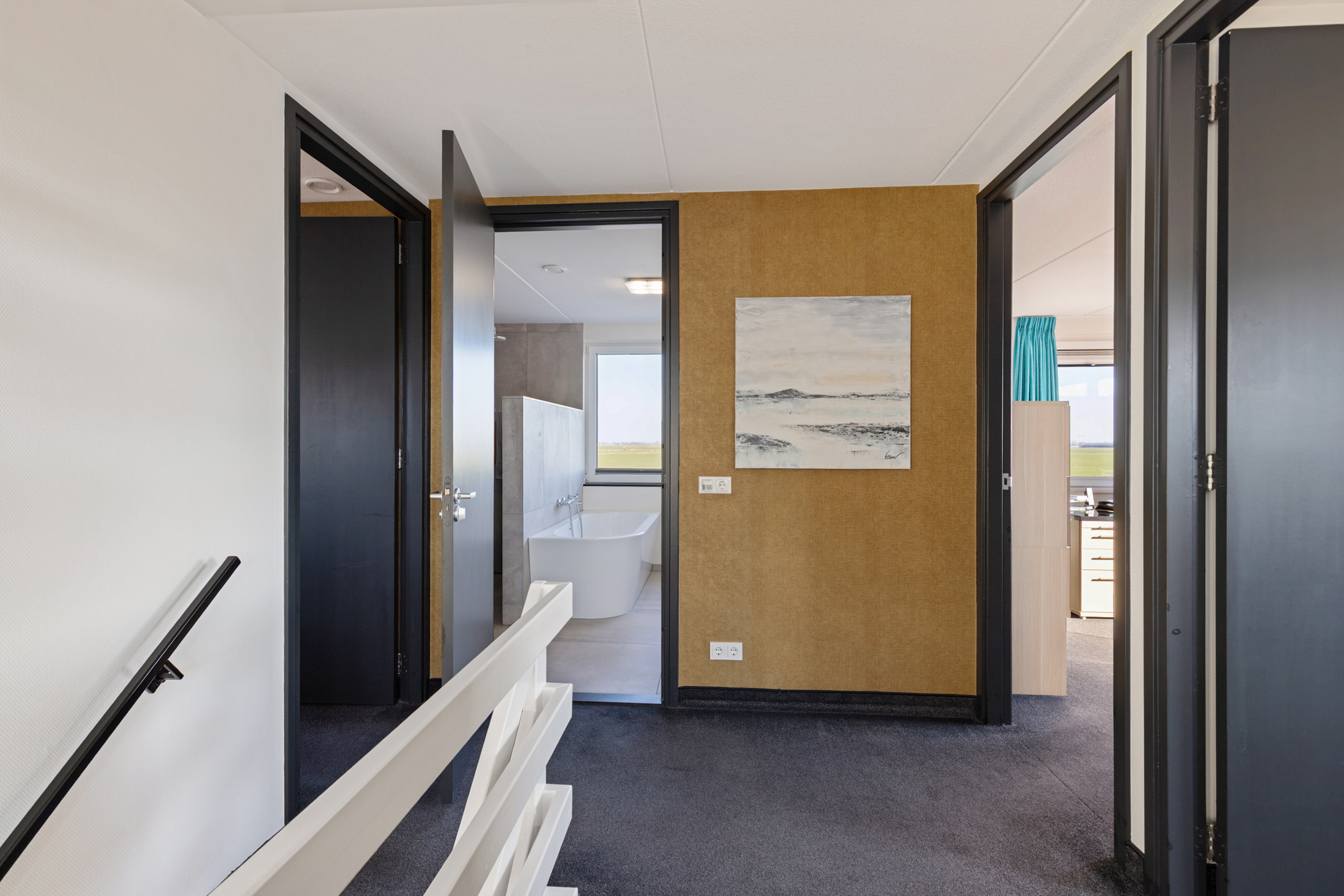 The family bathroom is bright and modern, with a bathtub, wide walk-in shower, and stylish double sink unit. Large windows offer panoramic views over the water and meadows—a spot where time seems to stand still. The first floor is heated with radiators and fitted with carpeting. All windows have insect screens.