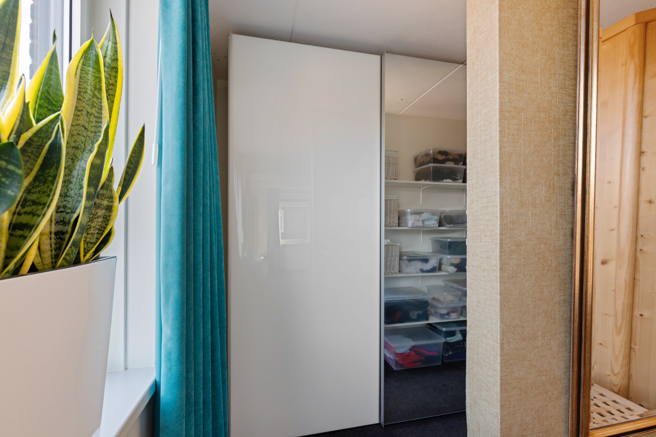 Via a fixed staircase, you reach the second floor, with two bedrooms and a large walk-in storage room (possible additional bathroom). Both rooms have high vaulted ceilings, creating a playful and spacious atmosphere. One room also features its own walk-in closet.
