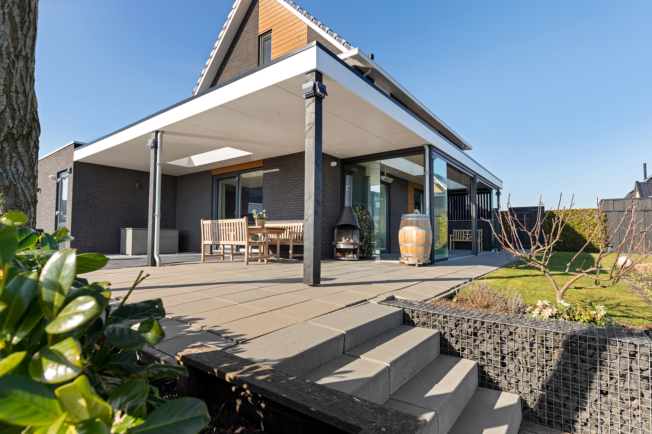 The luxurious garden room is finished to a high standard, equipped with heating, and has fully closable glass sliding doors, making it a true extension of the living space. Daylight from the roof brings in plenty of natural light, with adjustable louvers for shade when needed.