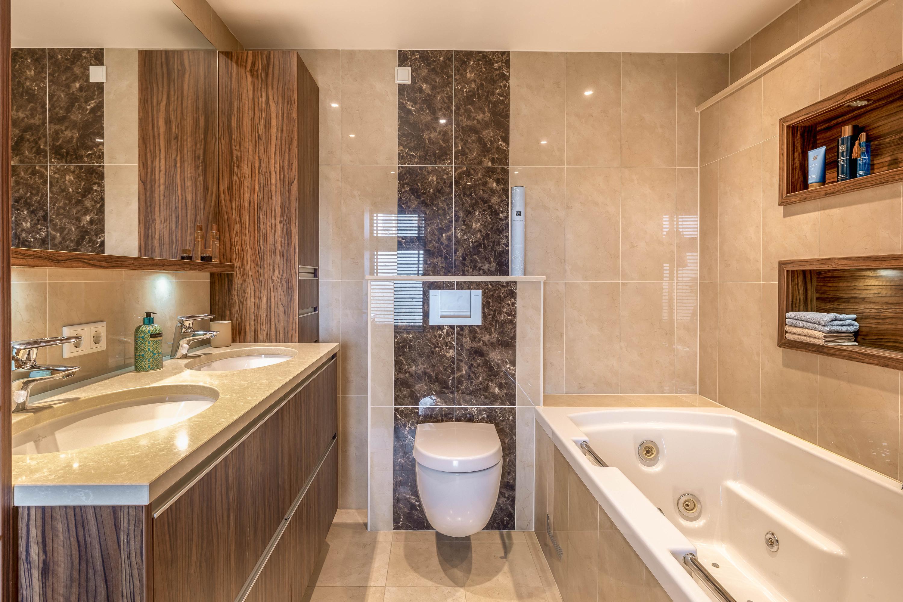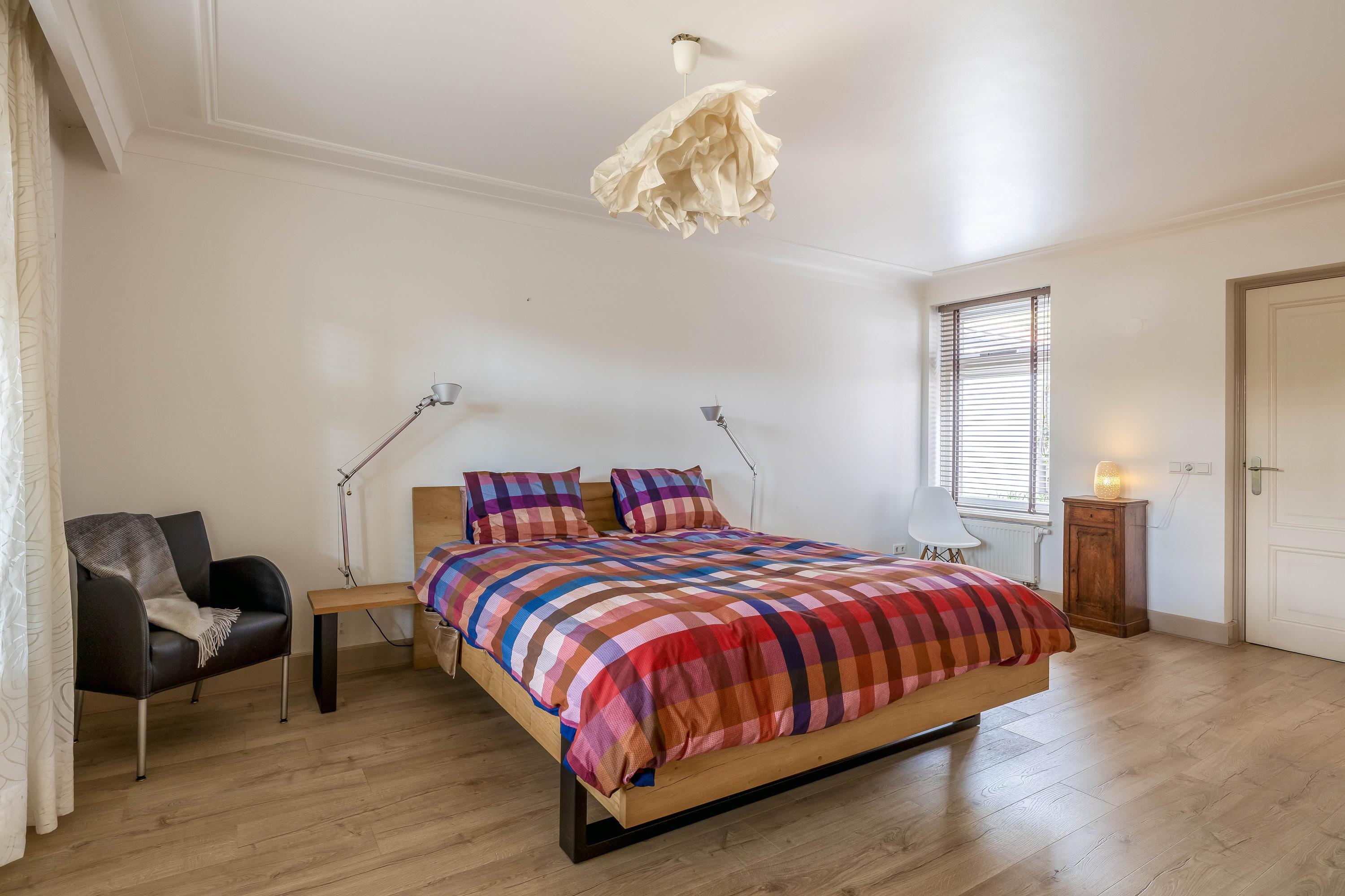 The toilet is fully tiled and equipped with a washbasin and wall-mounted toilet. The attractive living room is accentuated by high-quality ceramic tile flooring with bis and stucco, both on the walls and on the ceiling. The beautiful mouldings give the interior a classic look. The marble fireplace with gas fire provides extra warmth and atmosphere on colder days. A spacious bay window, currently furnished as a workspace, provides extra light in the room. The custom-made kitchen was designed by Hans Kwinten Interiors Projects. This high-quality kitchen is L-shaped and fully equipped with an advanced hob (with a wok burner, two gas burners and two induction burners) and a combi oven that also serves as a steam oven and microwave. In addition, you will find a dishwasher, freezer, refrigerator and a Quooker boiling water tap. French doors and various windows provide a beautiful view of the garden and direct access to the covered terrace and garden. The kitchen provides access to a spacious, man-sized storage cellar. The bedroom with en-suite bathroom and walk-in wardrobe is a delightful space. The floor is finished with laminate. The bathroom is fully tiled and equipped with a Whirlpool bathtub with light therapy, a double sink with a cabinet, a floating toilet and a walk-in shower with a seat. Various niches are an extra nice detail in the room. There is also underfloor heating in the bathroom. The walk-in closet with fixed cupboards and lighting offers optimal clothing storage. From the