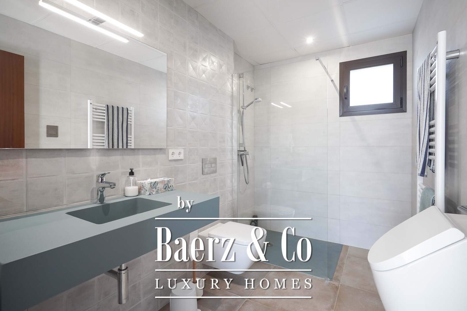 Do you dream of waking up to the sound of the waves of the Mediterranean Sea, feeling the gentle sea breeze, and being on an idyllic beach within a 3-minute walk? Then this villa is exactly what you are looking for. This modern, recently built property is located in a contemporary villa neighborhood, just behind the charming rocky beach of Cala Blanca. The villa is spread over two floors and enjoys a southern orientation. The heart of the home is the bright entrance hall, which also features the staircase and a convenient laundry room. From the hall, you enter the spacious living/dining room with a fully equipped open kitchen and an island. On the other side of the hall, you will find the master bedroom with an en-suite bathroom and a second bedroom with a separate bathroom. The upper floor offers a generous double bedroom with an en-suite bathroom and a private terrace. From this terrace, there is access to a large rooftop terrace where you can catch a glimpse