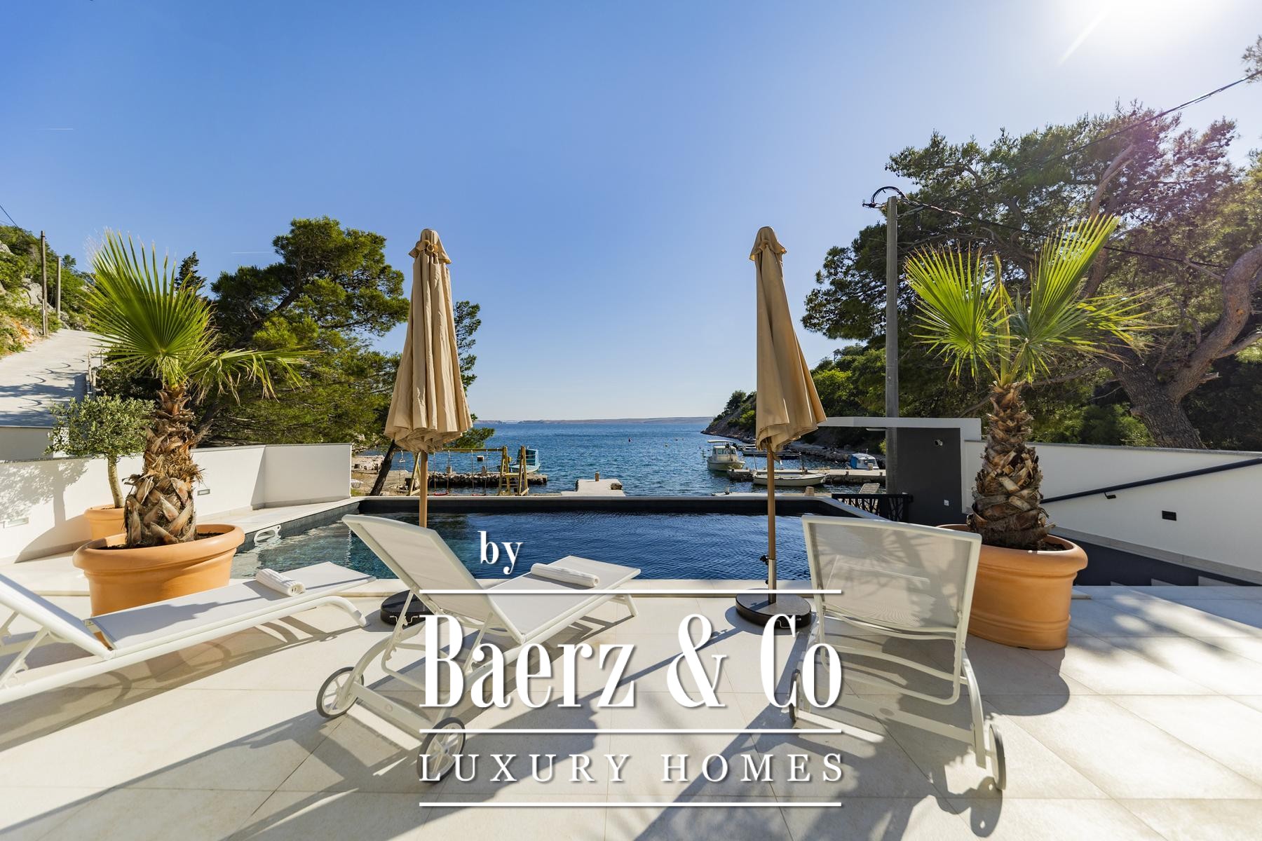 Expansive glass, triple-layered and well insulated, draws in light and frames the Adriatic, while underfloor heating and a fireplace ensure year-round warmth and calm. The main living space, elegantly proportioned, flows into a modern kitchen curated for both ease and sophistication. Outdoor areas invite languid afternoons beside the 32 m² seawater pool, in the jacuzzi, sauna, or at the private gym, with direct access to the sea and a pier that includes a boat slipway system for yacht owners.