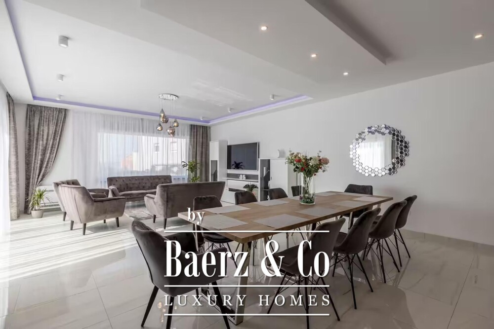 The ground floor reveals a modern kitchen and dining area, fluidly opening into a generous living room that extends onto the outdoor terrace. Natural light moves smoothly across wide interiors, while a central staircase links each level with balanced rhythm. The second floor offers a vast 120 m² terrace, granting open views and a tranquil place to unwind.