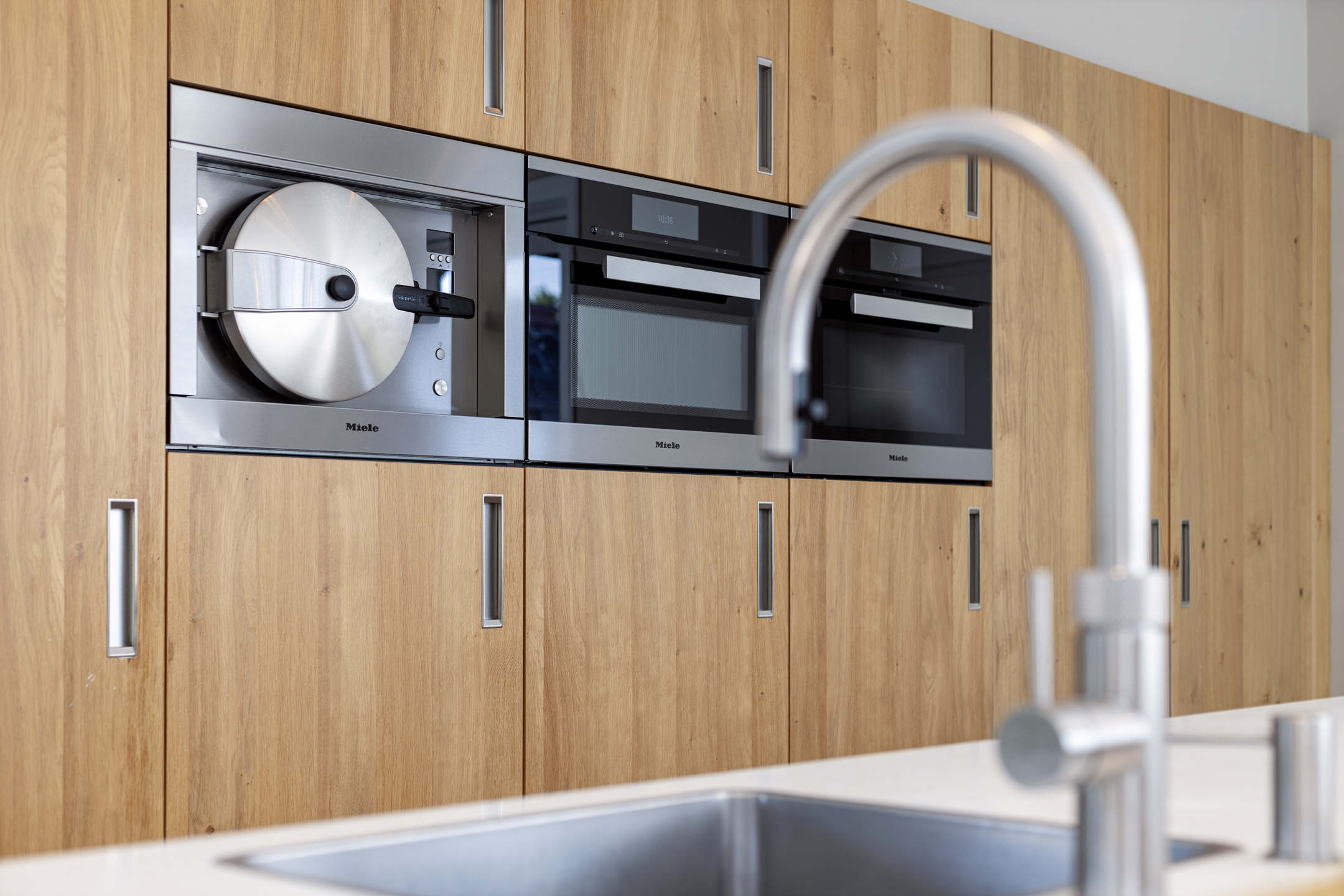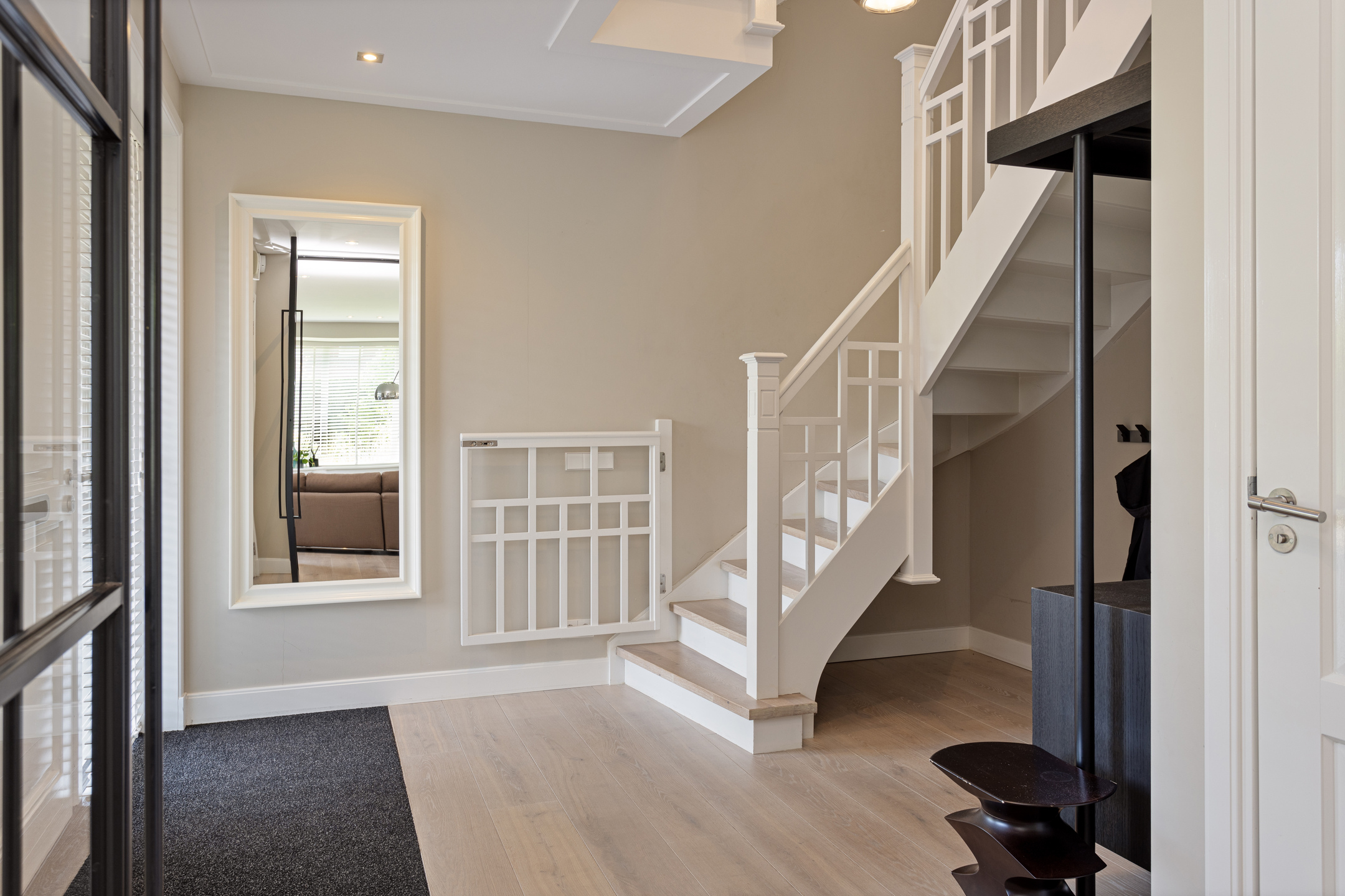 Upon entering there is a generous bright entrance with beautiful staircase and toilet room. Through the steel door we enter the generous, very bright living room with work corner and French doors to the beautiful garden. At the rear of the house is a large modern kitchen with cooking/sink island and breakfast bar; plenty of space for cozy dinners with friends and family. Again, large windows provide an abundance of light. A utility room is of course not missing; this is also where the washing equipment is located.