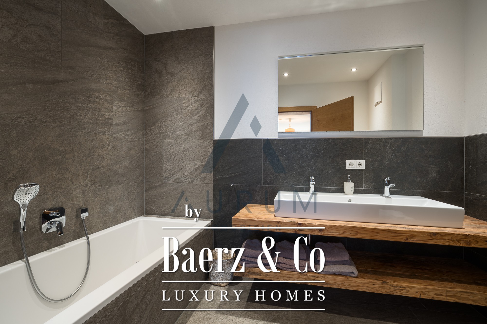 This penthouse apartment Kirchberg in Tirol is set in an exceptionally tranquil location within a contemporary building completed in 2016. The living experience begins in a spacious entrance that unfolds into a refined living and dining area, where a fireplace and exposed roof trusses set an inviting tone. Natural light moves across oak floorboards, while oversized porcelain stoneware tiles and Venetian blinds punctuate the refined space. The professional kitchen, thoughtfully separated yet sight-connected, features name-brand appliances and grants direct access to a private balcony poised above the landscape.