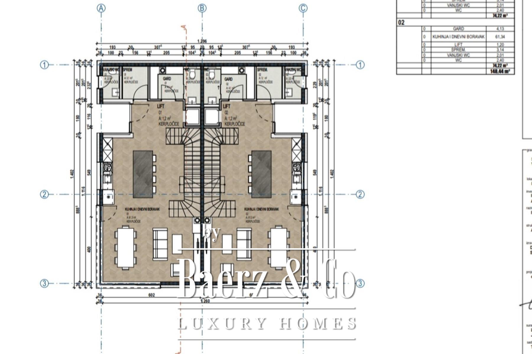 The upper floor is dedicated to private retreats, with three en suite bedrooms, including a master suite with a balcony overlooking the Adriatic. Materials and engineering reflect a commitment to both comfort and longevity, with Daikin heat pump technology, ceiling air conditioning, and ALU windows. With completion scheduled for the end of 2024, this semi-detached house for sale in Kostrena invites a life of quiet coastal refinement.