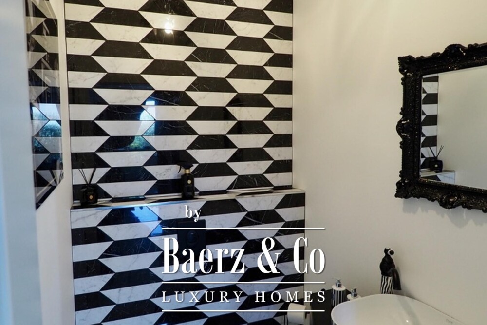 The garden is structured for both contemplation and convivial gatherings, offering a 32 m² swimming pool, sunbathing deck, covered terrace with grill area, outdoor shower, and precise landscaping maintained by a Husqvarna robotic system. Three additional storage units, including a technical room and two aluminum storage spaces of 8 m² each, contribute to an effortless rhythm of daily living.
