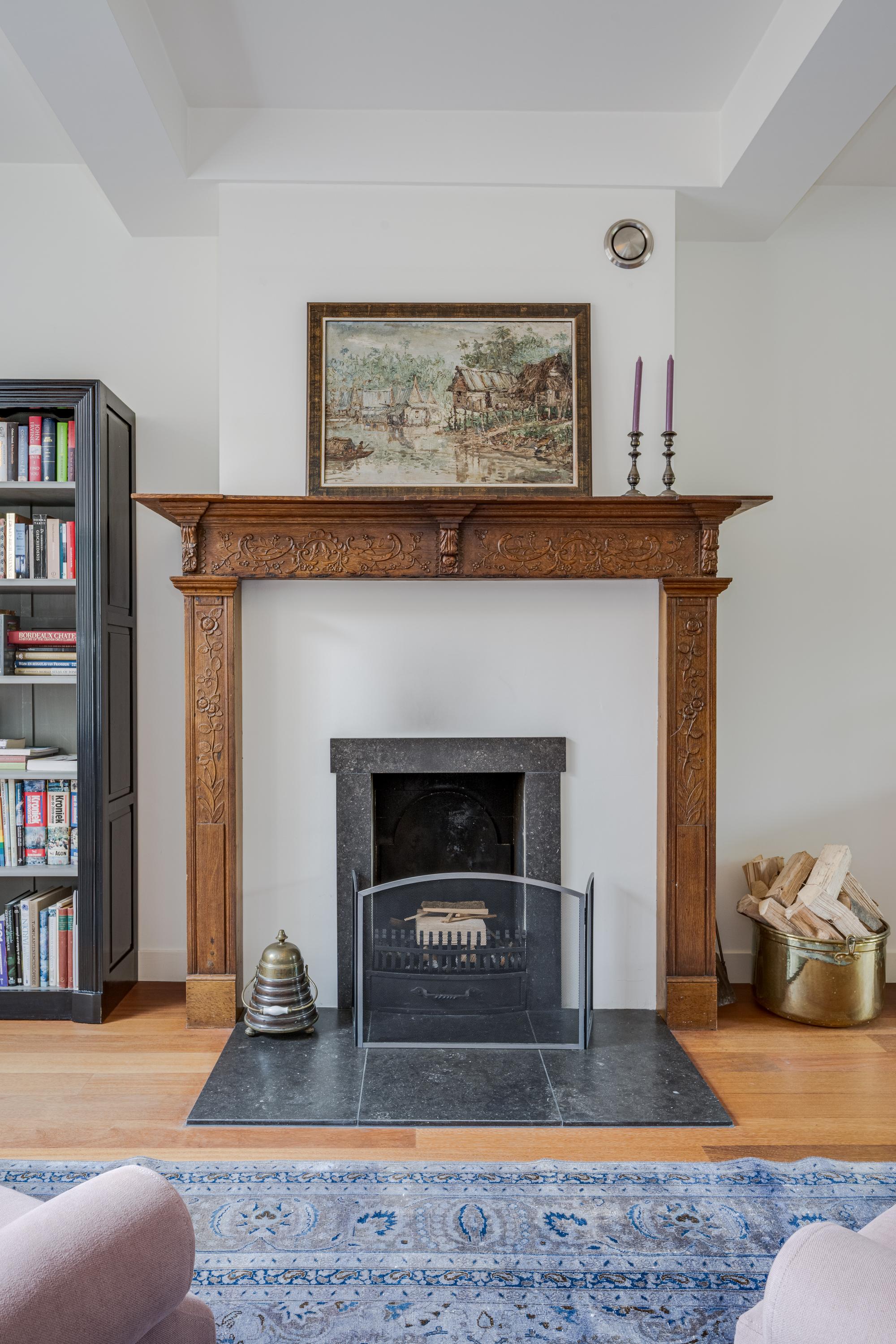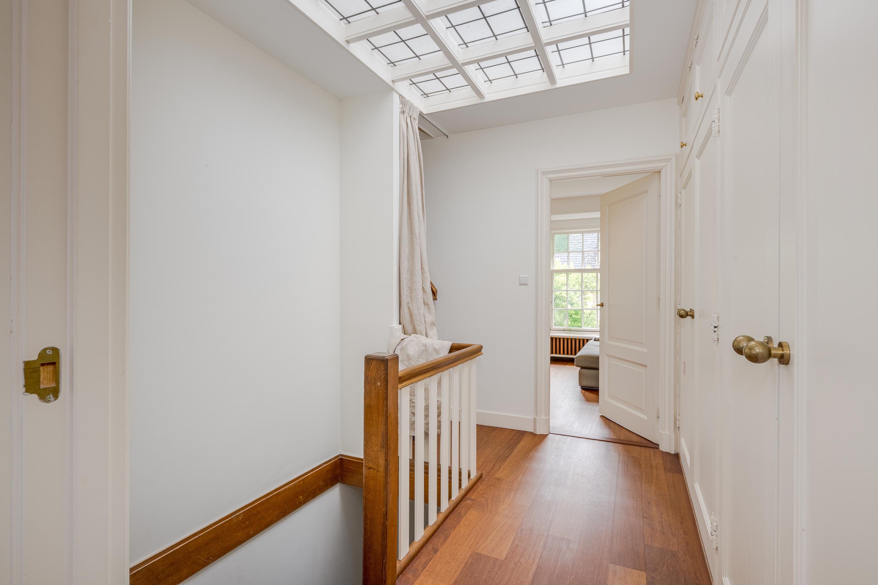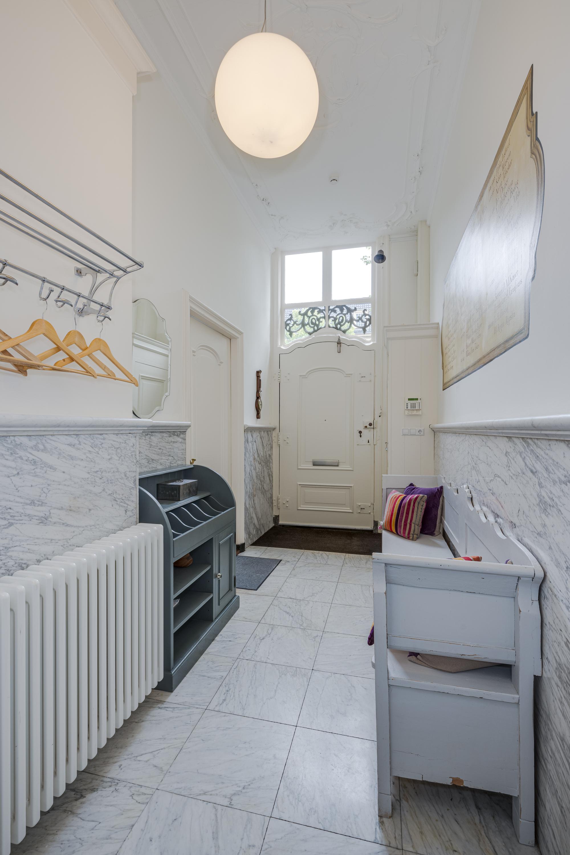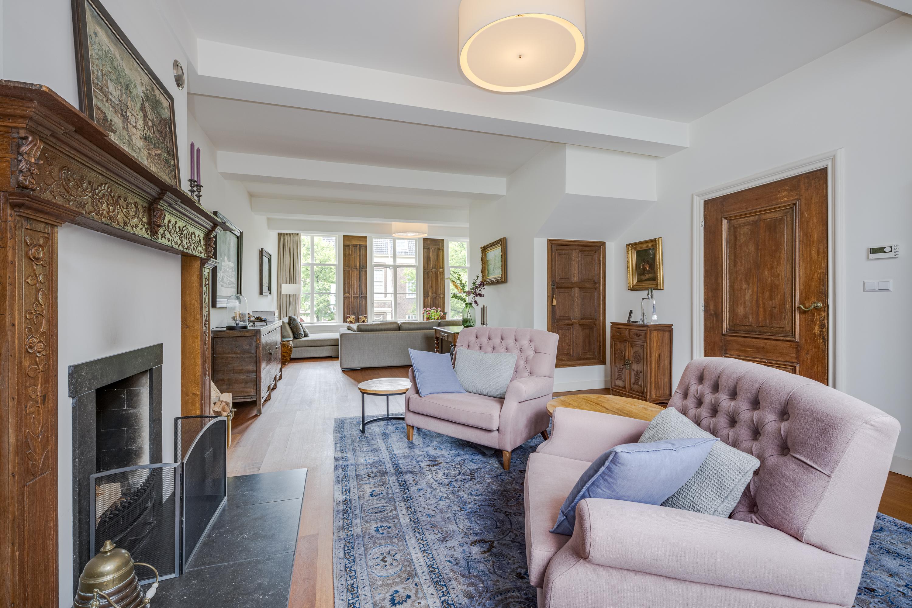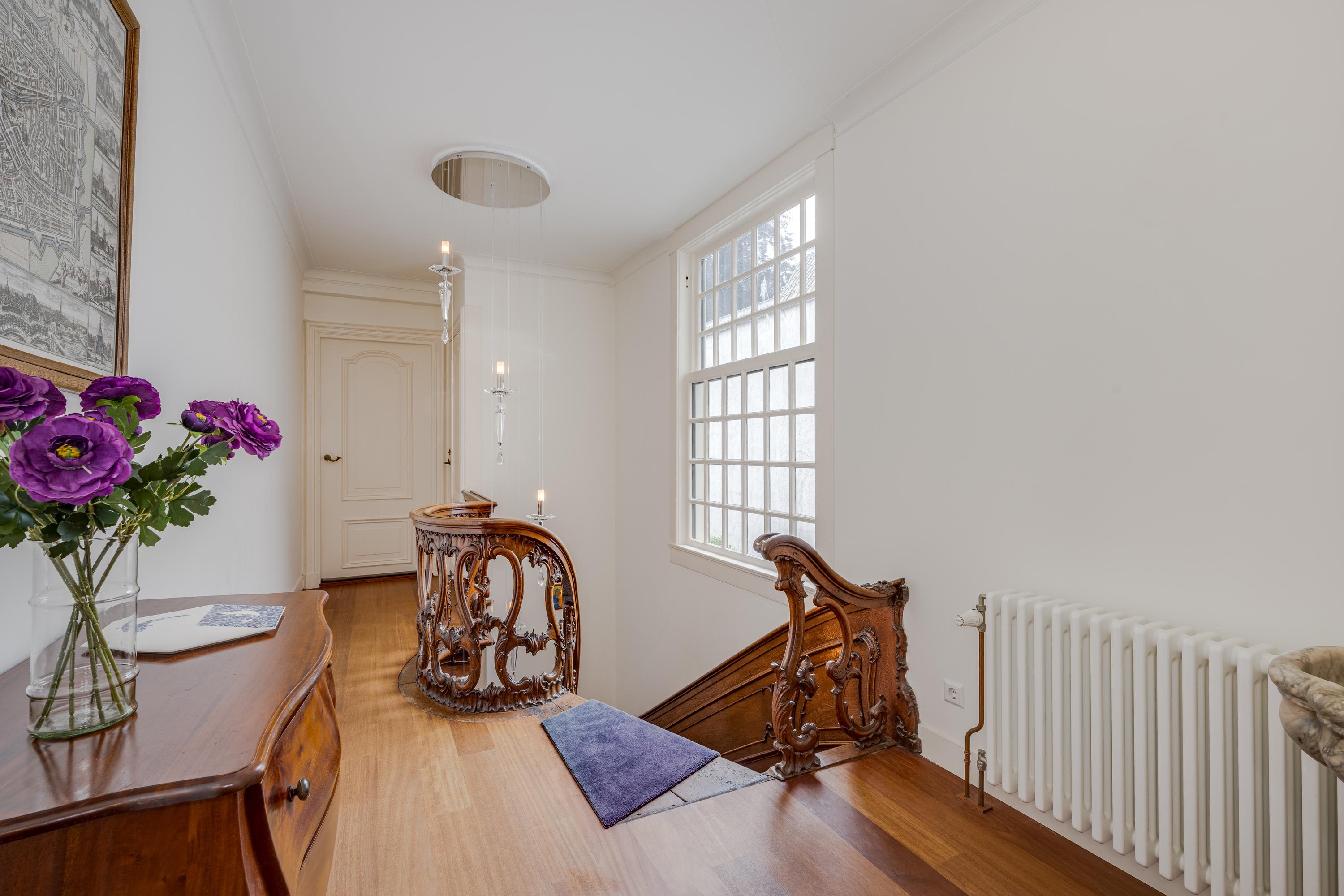 A monumental staircase leads to the first floor. In the back house there is a separate toilet and a bedroom with modern bathroom en suite. At the front you will find the very spacious and bright living room with a sitting room around the fireplace on the garden side and at the front (3 windows wide) a nice bright living room with a beautiful view of the canal and the city.