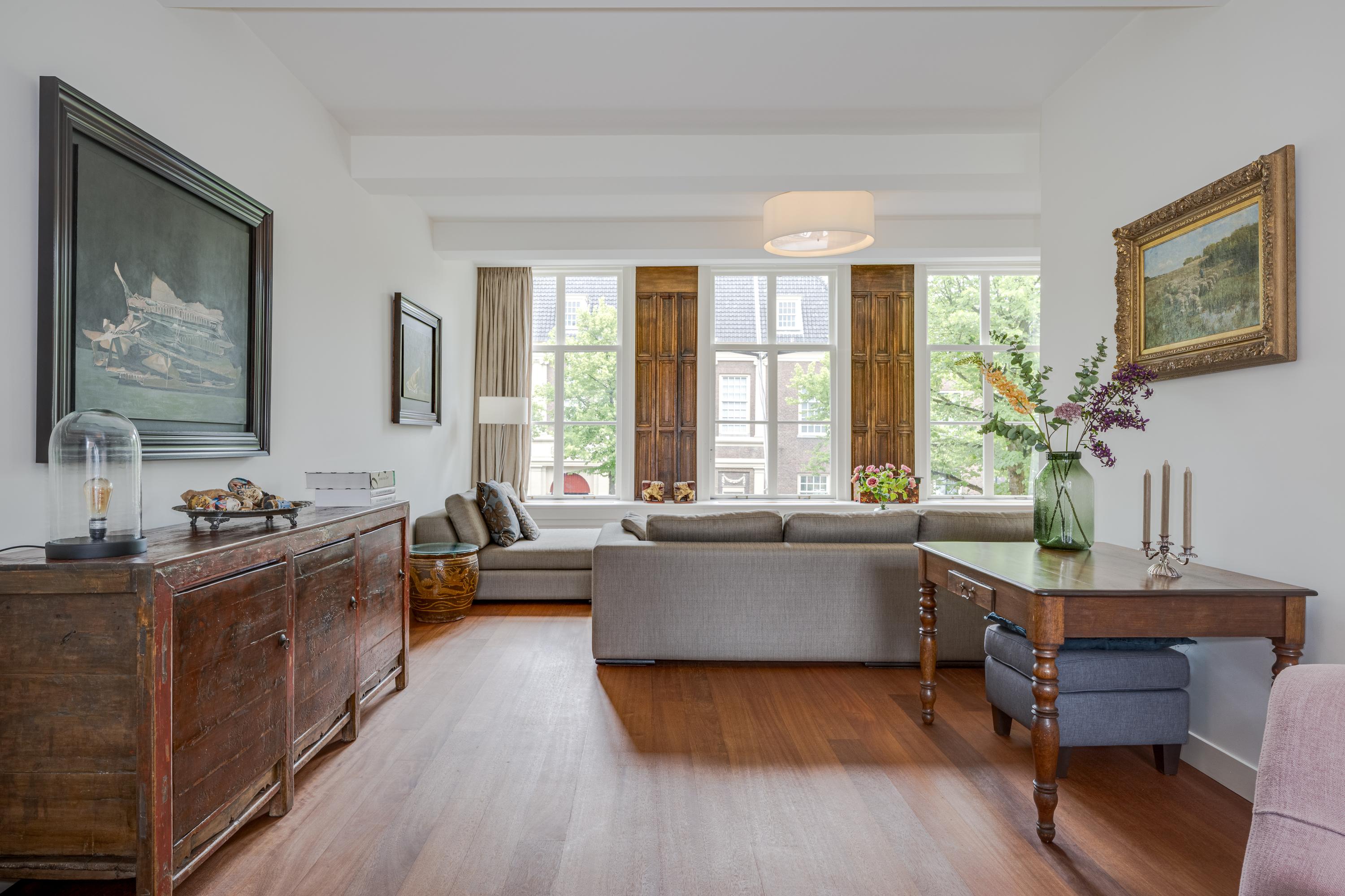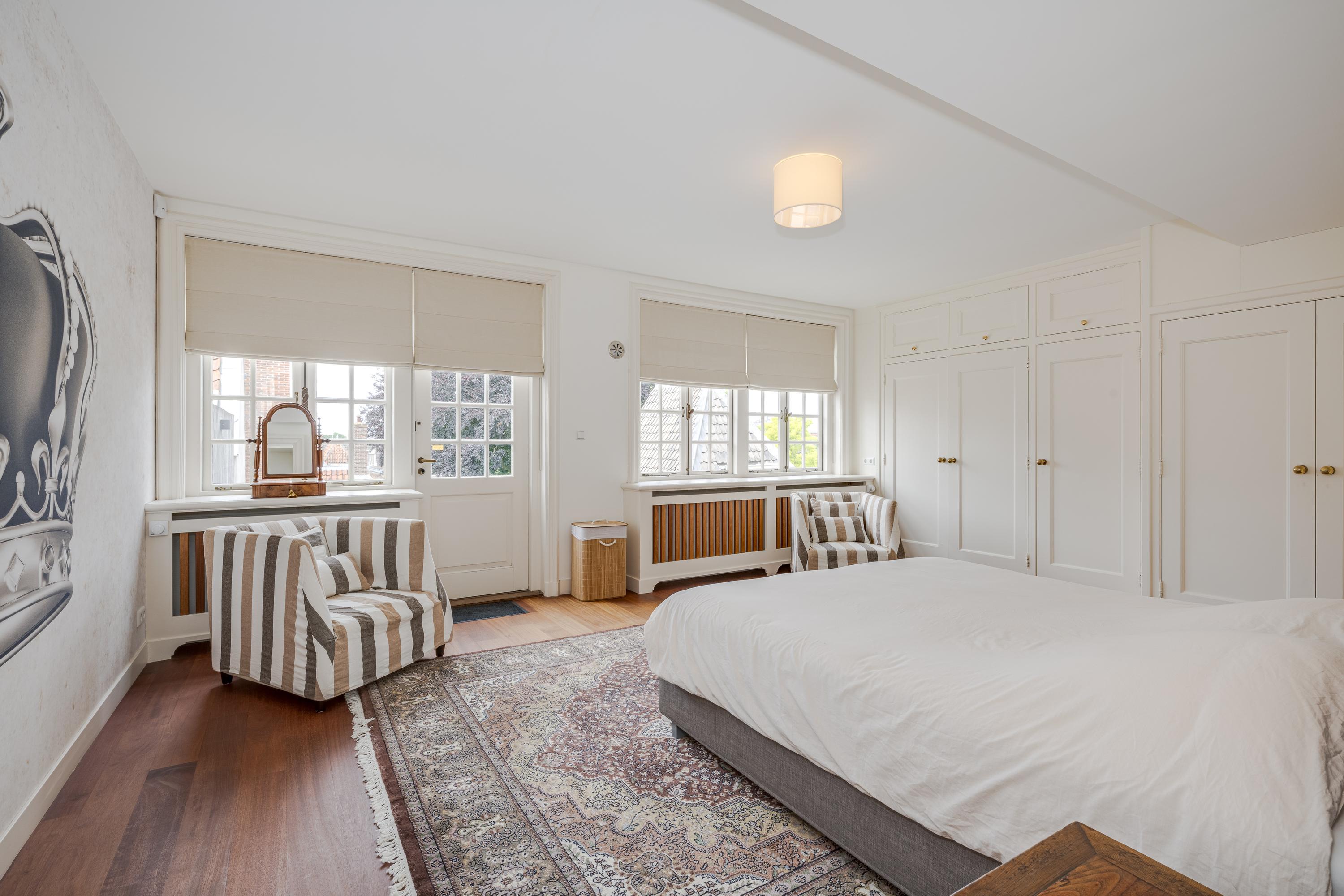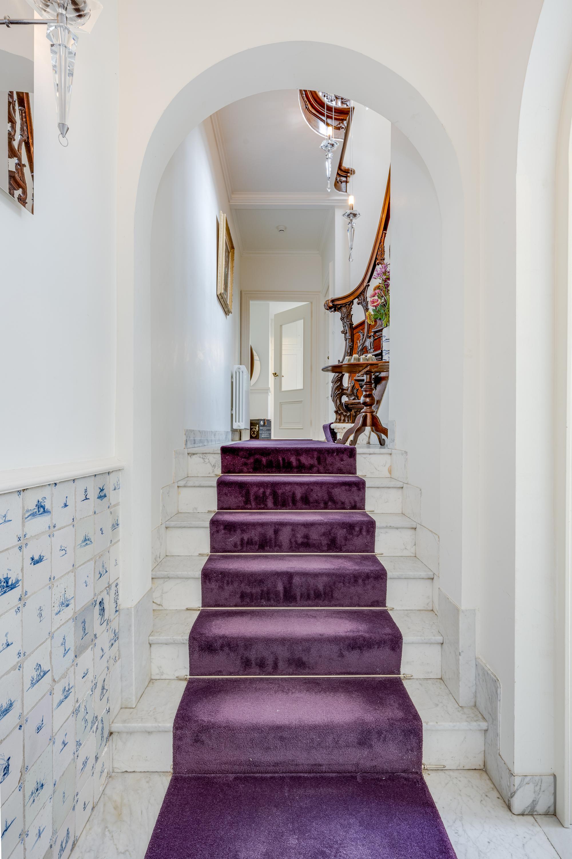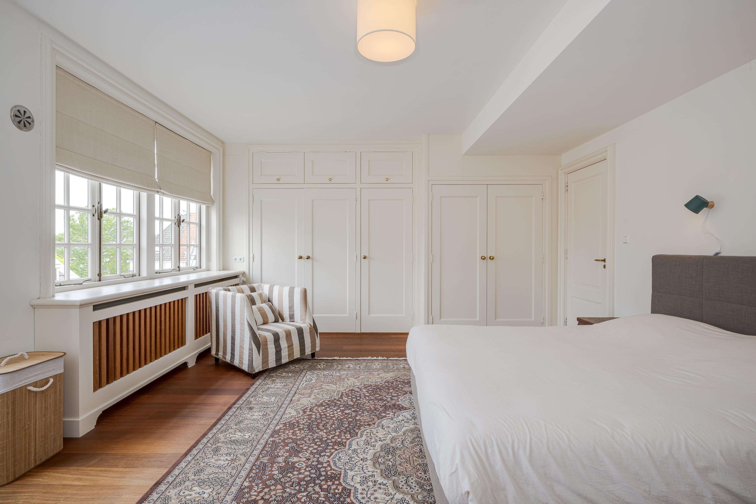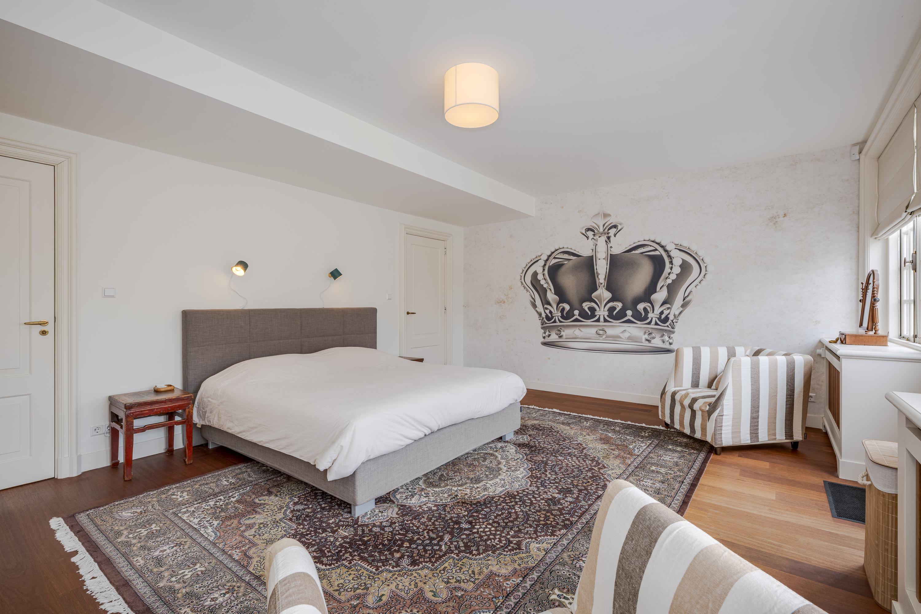 A monumental staircase leads to the first floor. In the back house there is a separate toilet and a bedroom with modern bathroom en suite. At the front you will find the very spacious and bright living room with a sitting room around the fireplace on the garden side and at the front (3 windows wide) a nice bright living room with a beautiful view of the canal and the city.