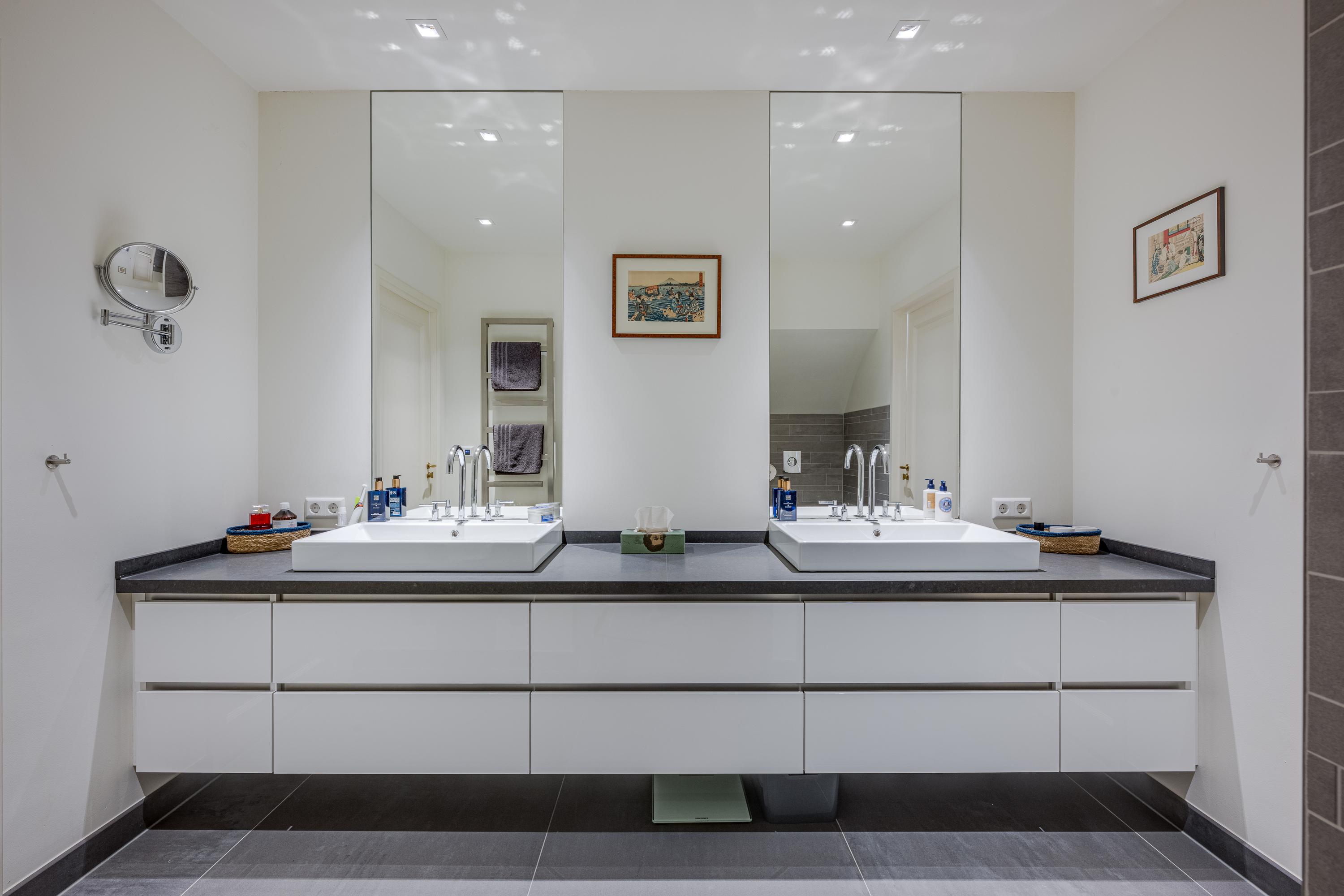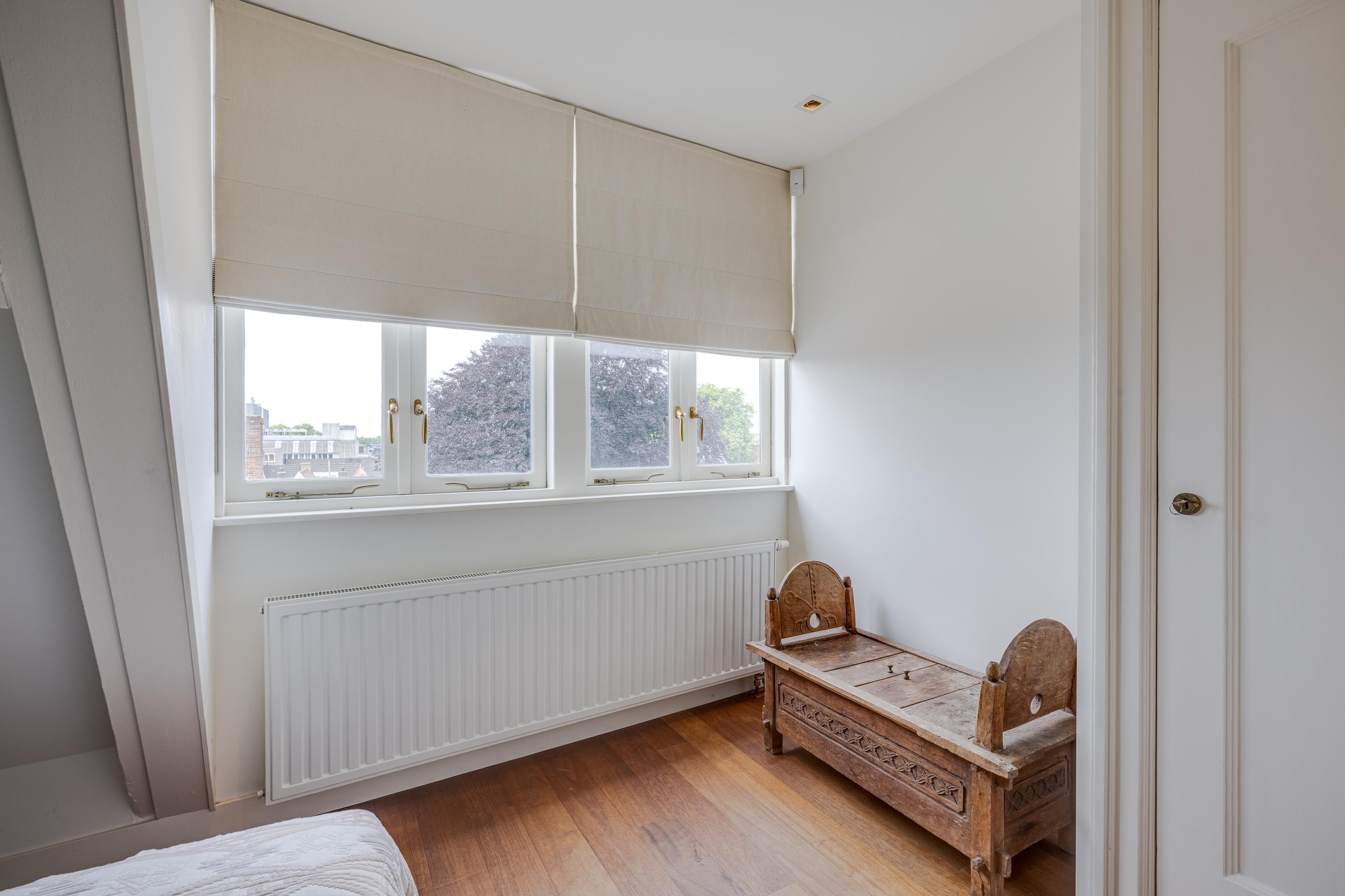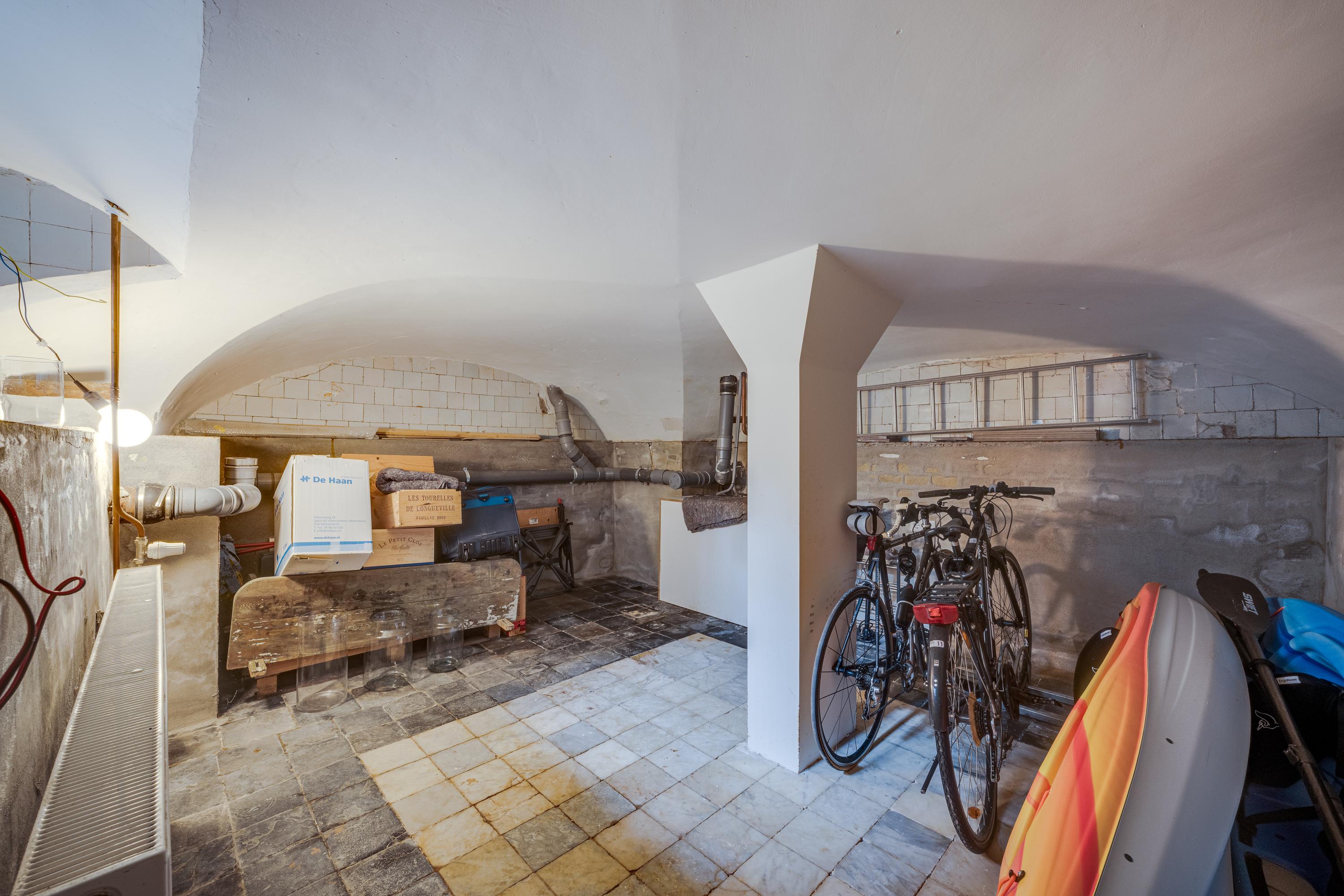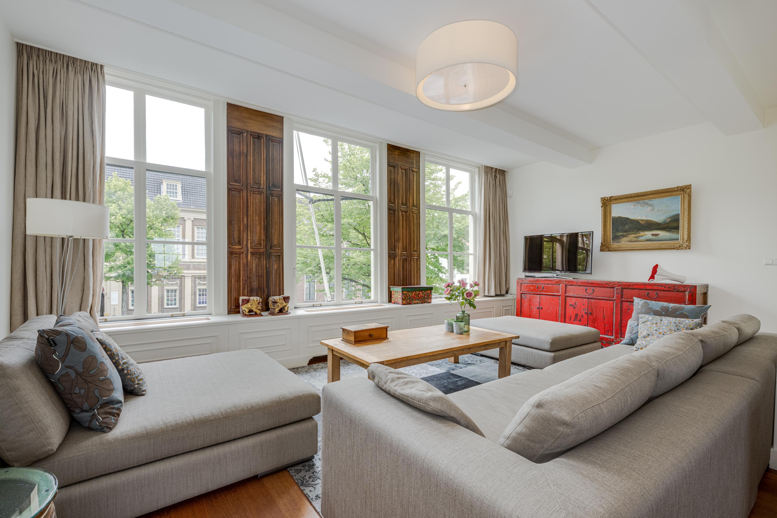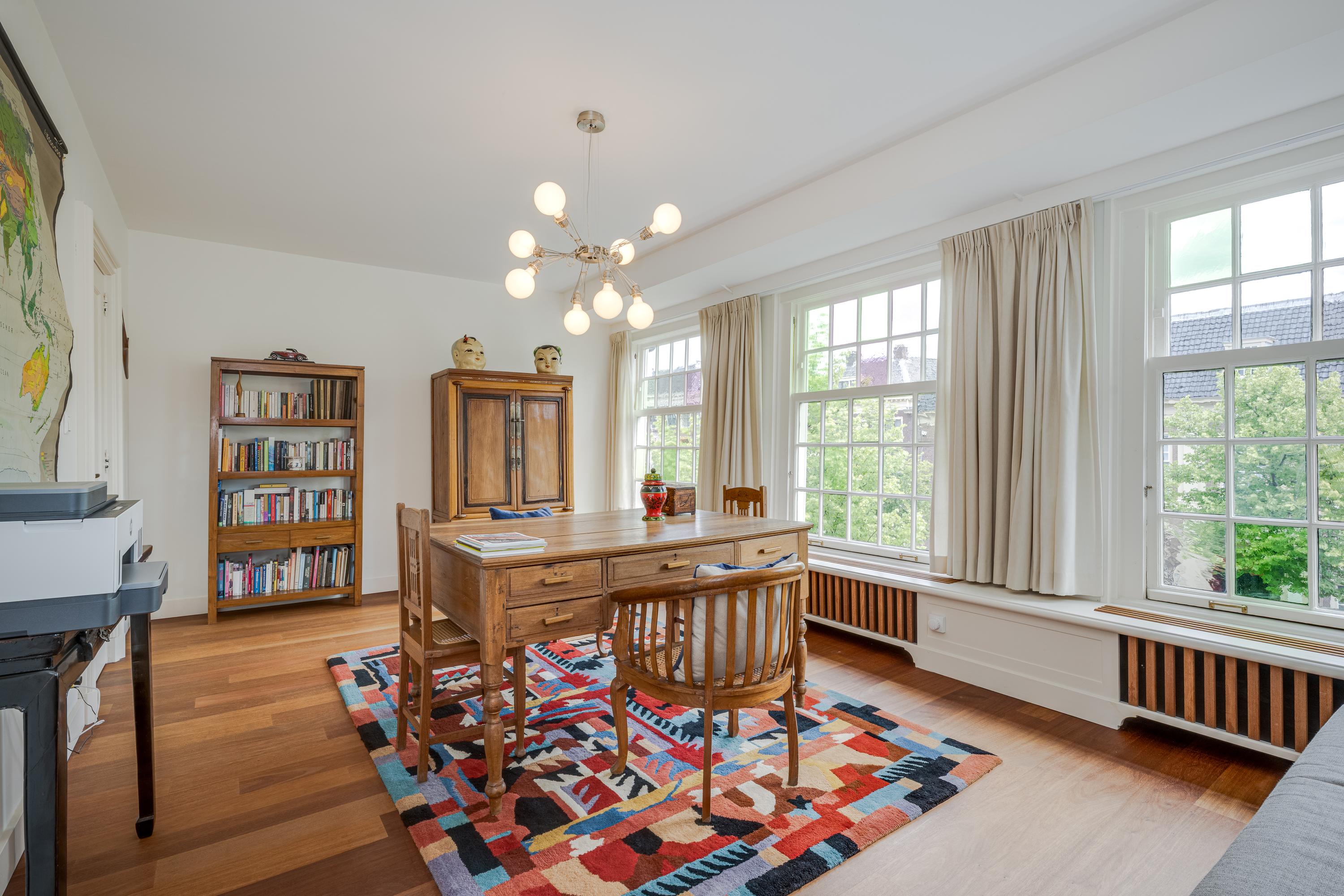 A monumental staircase leads to the first floor. In the back house there is a separate toilet and a bedroom with modern bathroom en suite. At the front you will find the very spacious and bright living room with a sitting room around the fireplace on the garden side and at the front (3 windows wide) a nice bright living room with a beautiful view of the canal and the city.