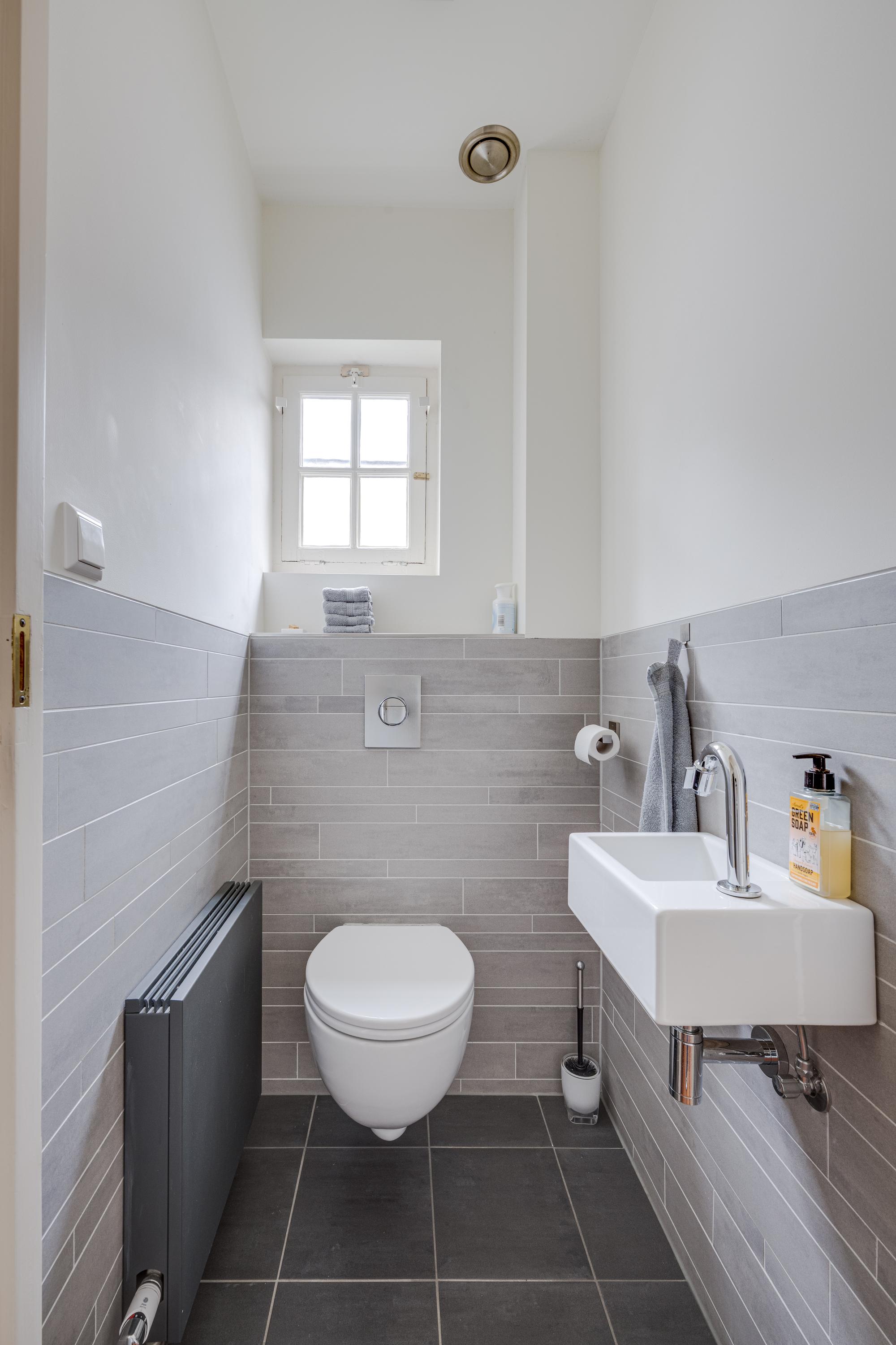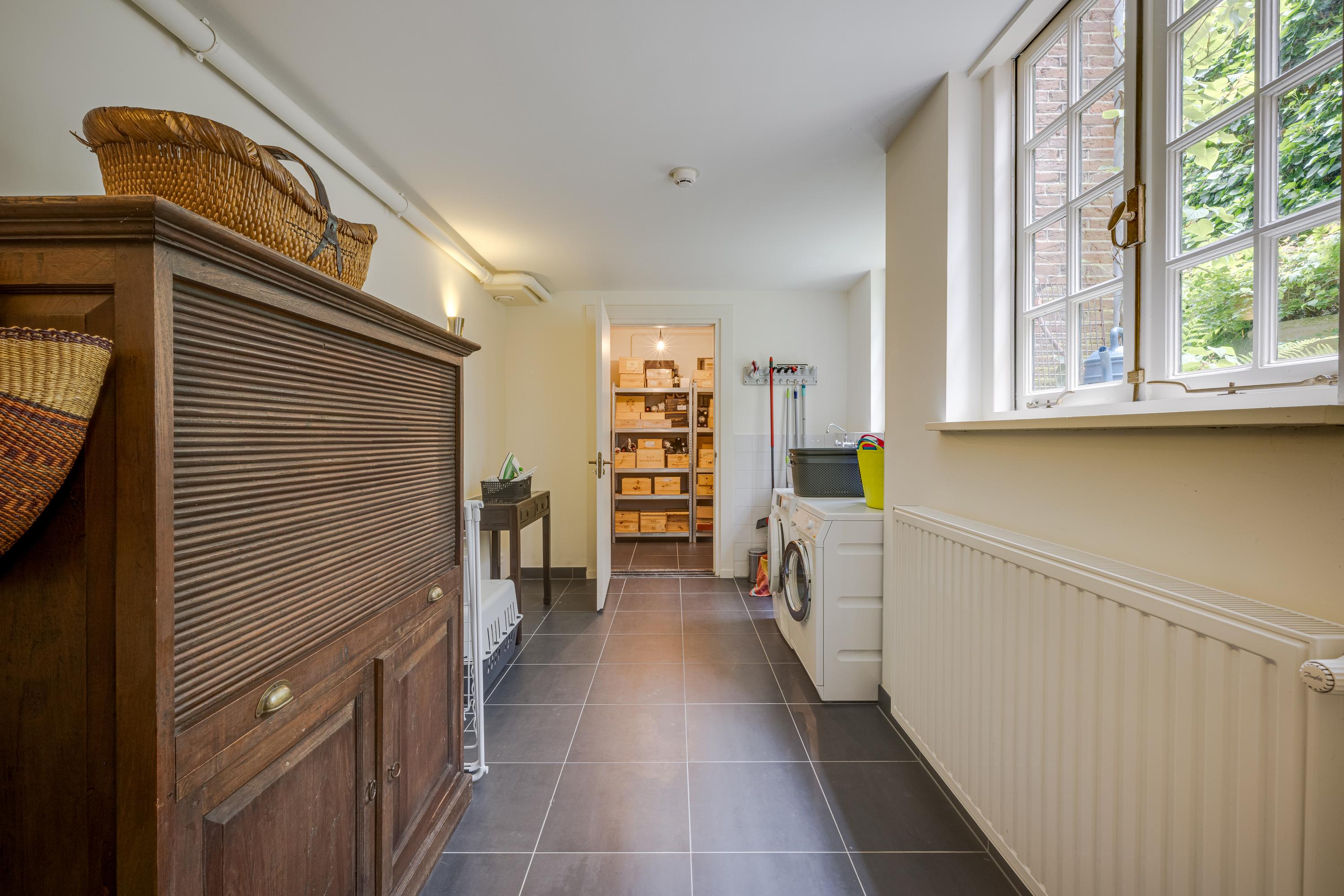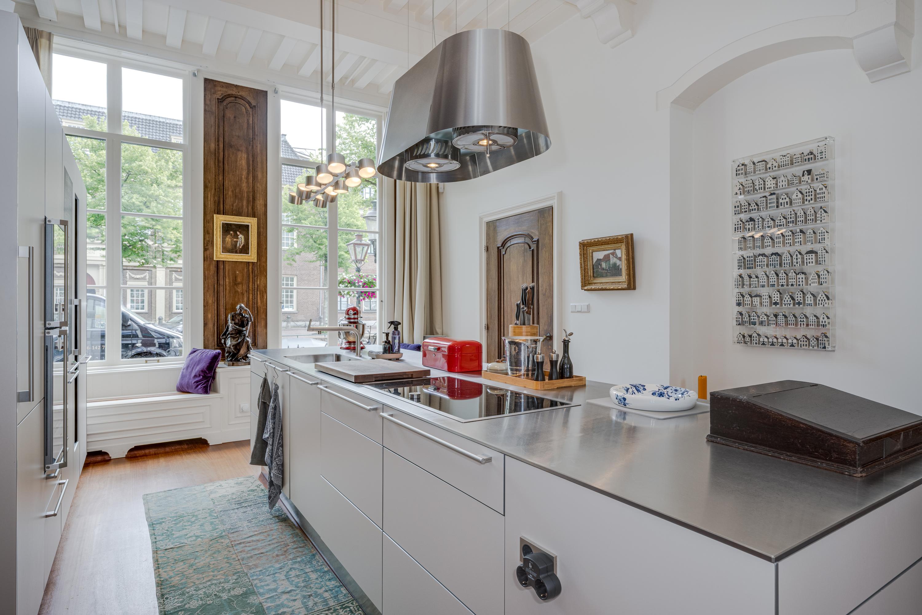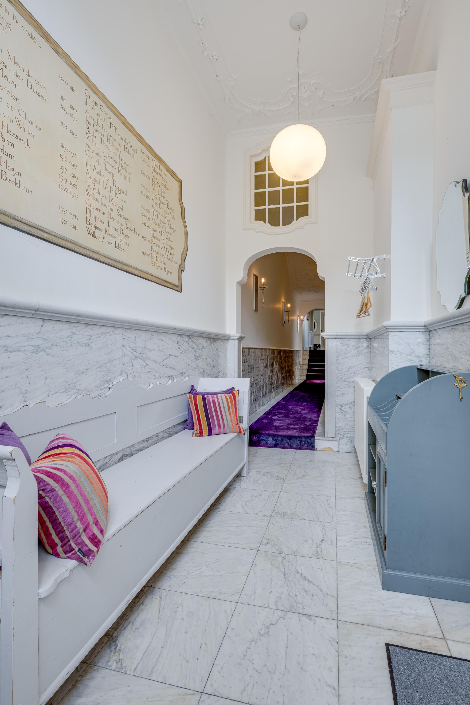 Spacious and bright entrance. Door to the kitchen. This is a beautiful and very atmospheric space with 2 high windows on the canal side and French doors to the back garden. The luxurious Bulthaup kitchen is of course equipped with all the usual appliances. The wide gas fireplace on the garden side adds extra atmosphere to the dining and sitting area of ??this space. The long hallway with Delft Blue tiles on both sides leads to a small hall with access to the garden and a staircase to the basement. This is currently used as a laundry room. On the street side, there is a vaulted cellar for storage on this level. Back to the hallway, here you will find another guest toilet and at the end of the hallway a multifunctional room.