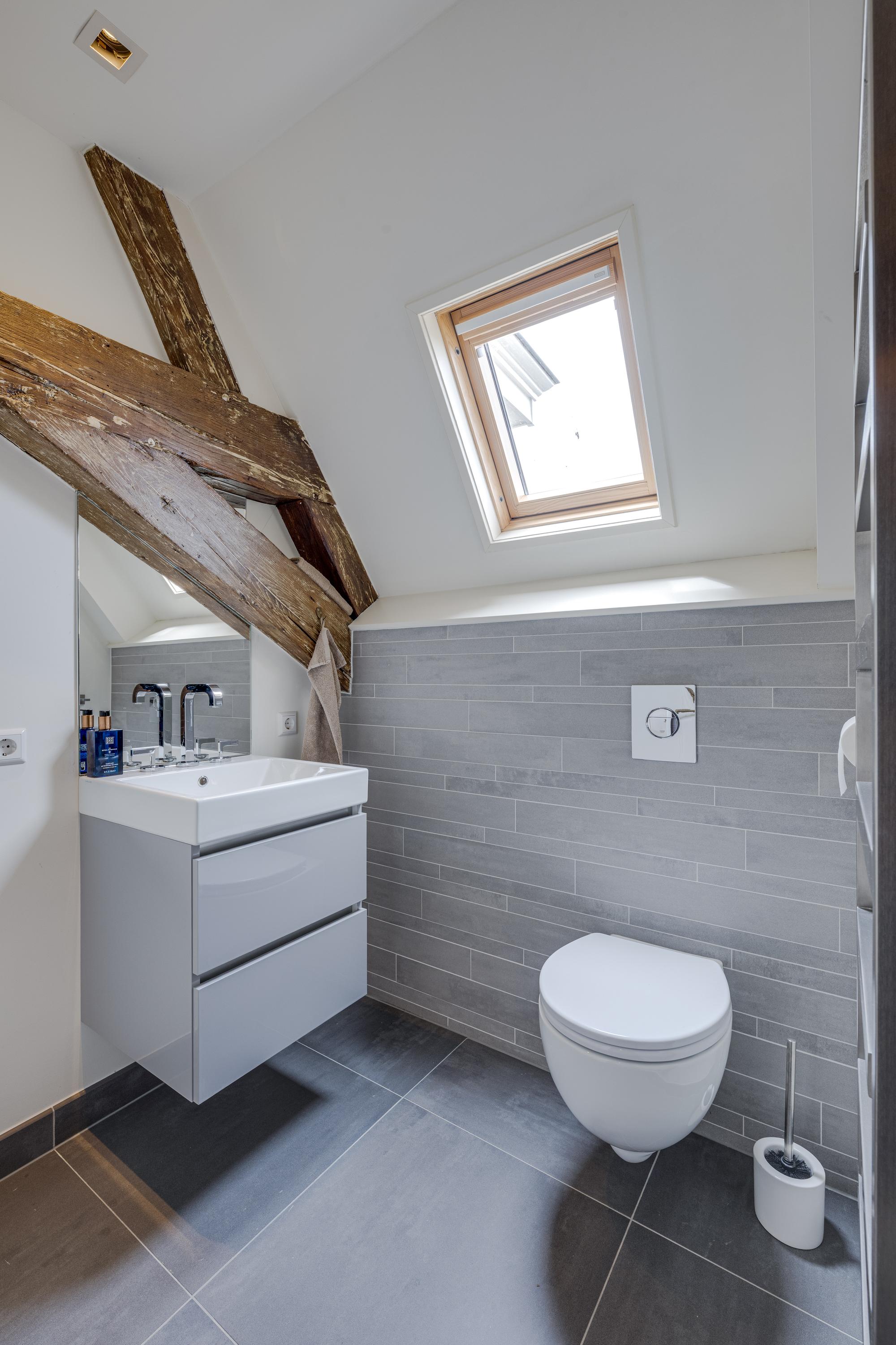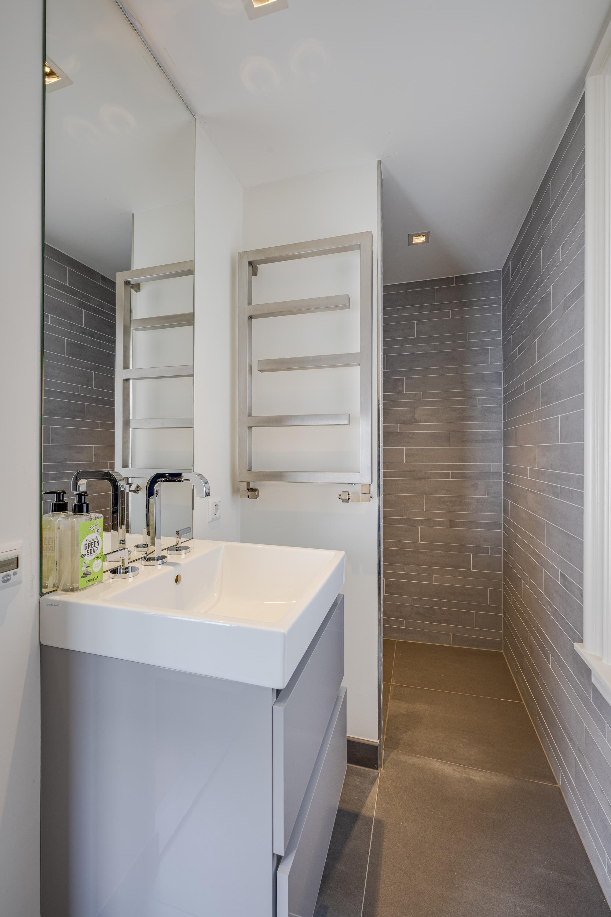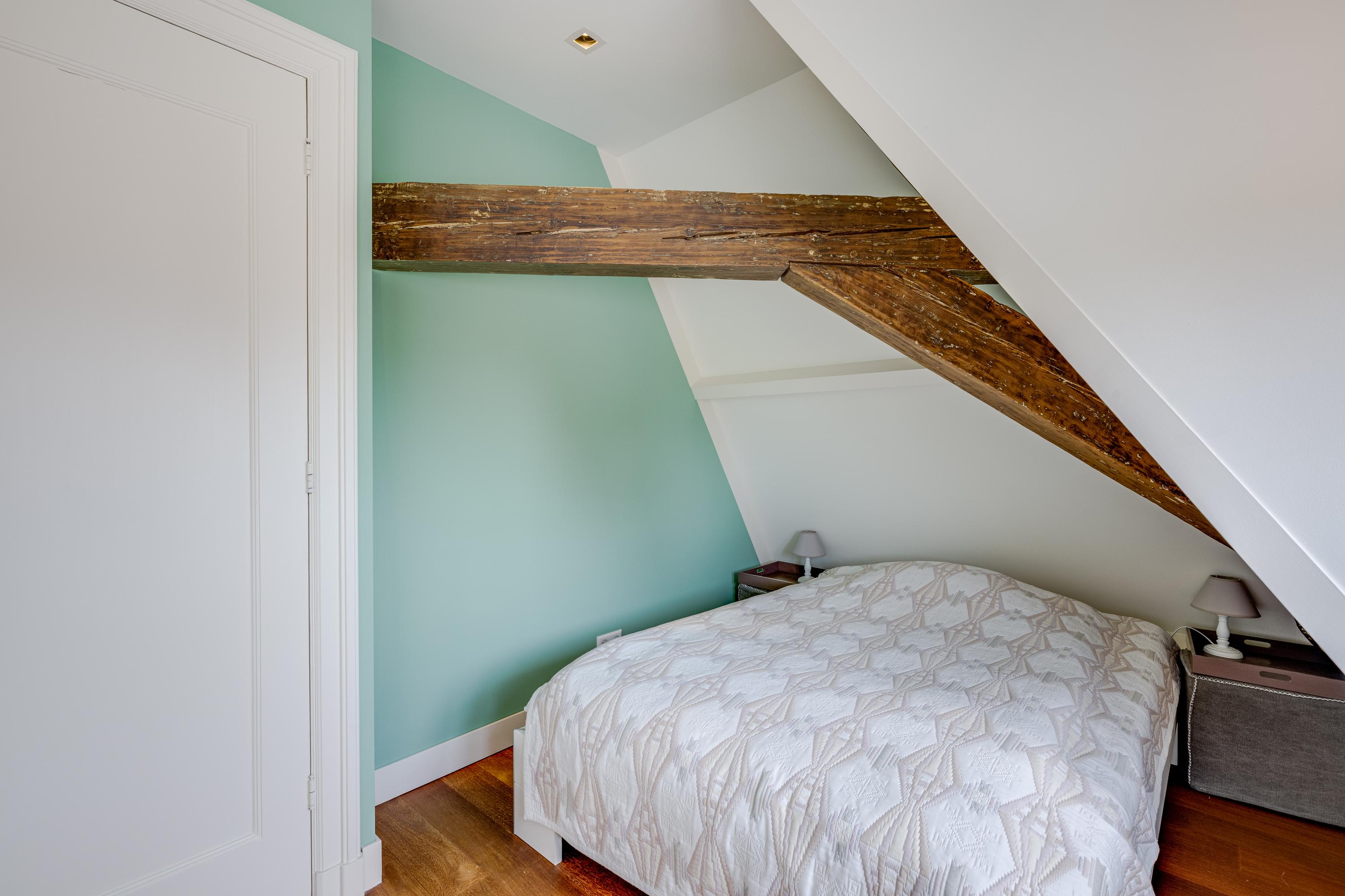Landing, bathroom with shower, toilet and bedroom. Very spacious and attractive bedroom at the front with dormer window and built-in closet. Here is also a hatch with loft ladder for access to the large attic space with, among other things, the setup for the central heating. Furthermore, at the rear is one smaller bedroom with dormer window.