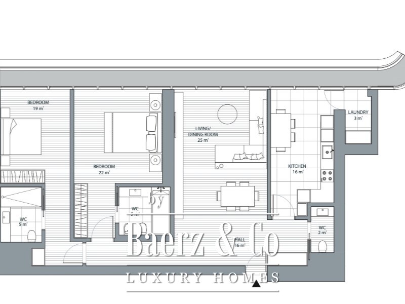 Apartment Lisboa offers an understated elegance within the Infinity Condominium, presenting a bright two-bedroom layout where quality blends with quiet sophistication. The property, spanning 139 m², welcomes with a generous 16 m² entrance hall, setting a poised tone for the living experience that follows. The main living space, measuring 25 m², flows in natural light and provides a refined setting for both social gatherings and private downtime, connected seamlessly to a wraparound balcony that traces the exterior of every room.
