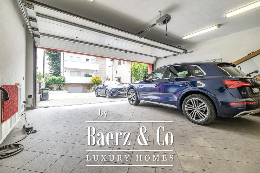 The architectural layout spans four levels, connected by a central staircase that grounds the property in calm, cohesive rhythm. The basement features a tavern-style kitchen and dining area equipped with a grill and oven, alongside a wine cellar and guest facilities. The ground floor is organized around a three-room apartment with open living, dining, and kitchen, all flowing directly onto a terrace and garden. A heated garage with internal access, storage, and laundry underscore functional sophistication.