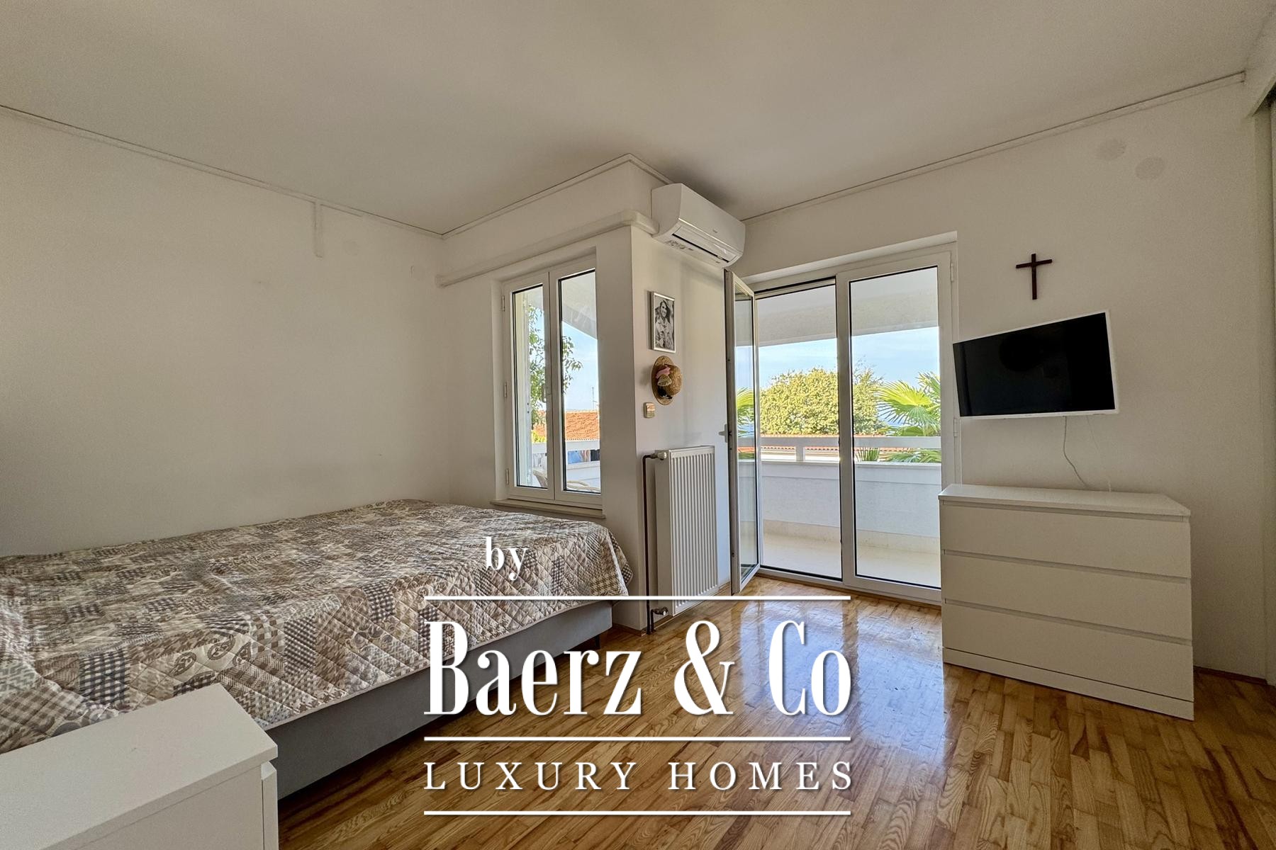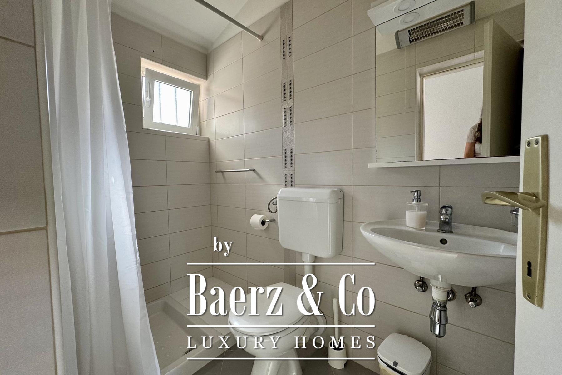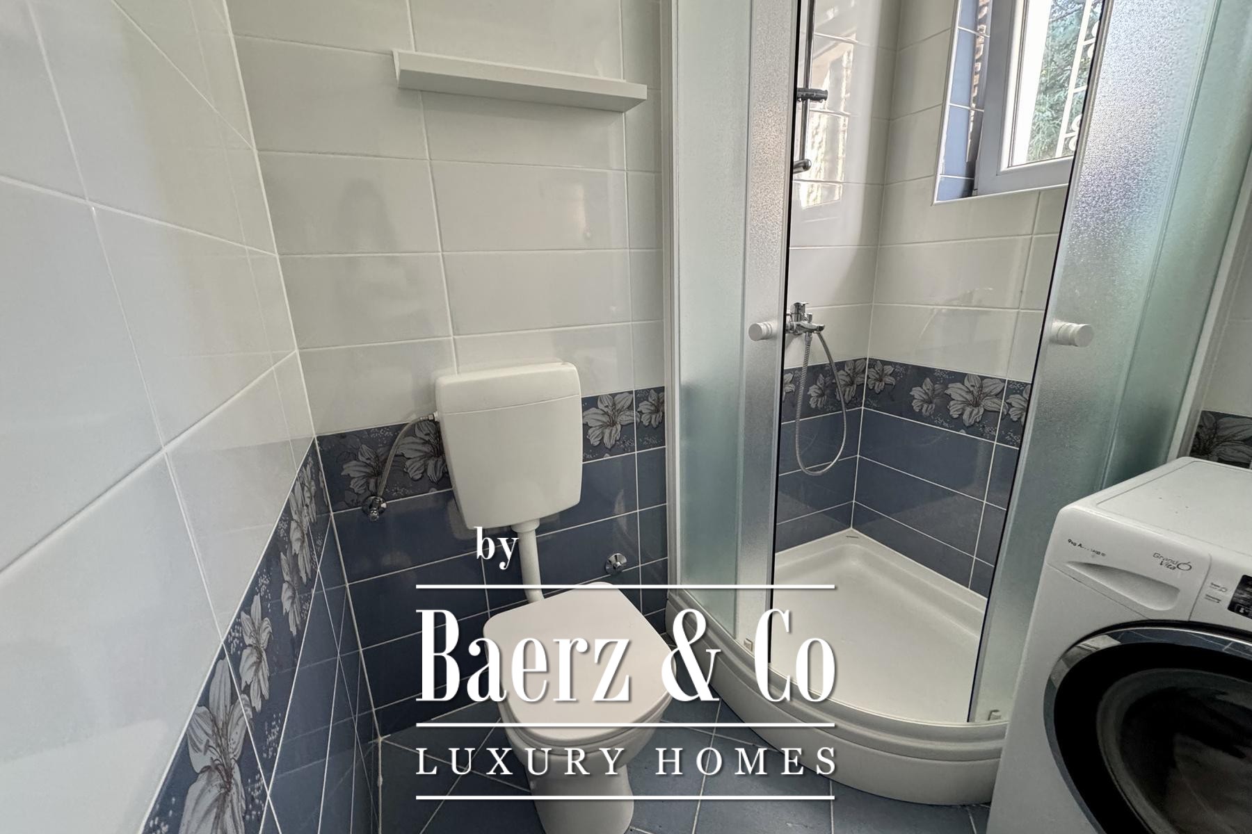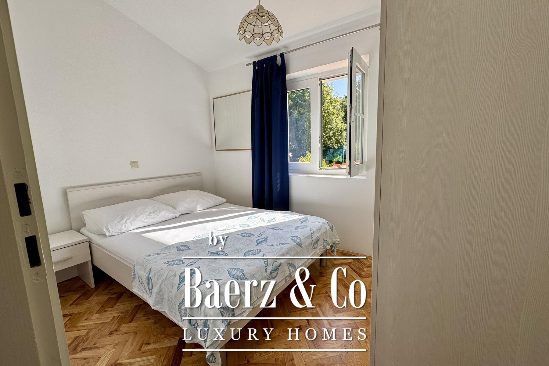 The main two-story apartment features two bedrooms, two bathrooms, a storage room, and a generous open-plan living area. Natural light fills the interior, connecting seamlessly to a covered terrace and two balconies, each framing glimpses of the Adriatic and the ever-changing Mediterranean light.