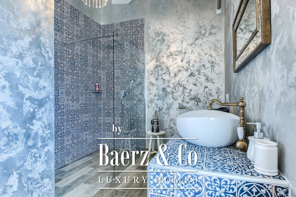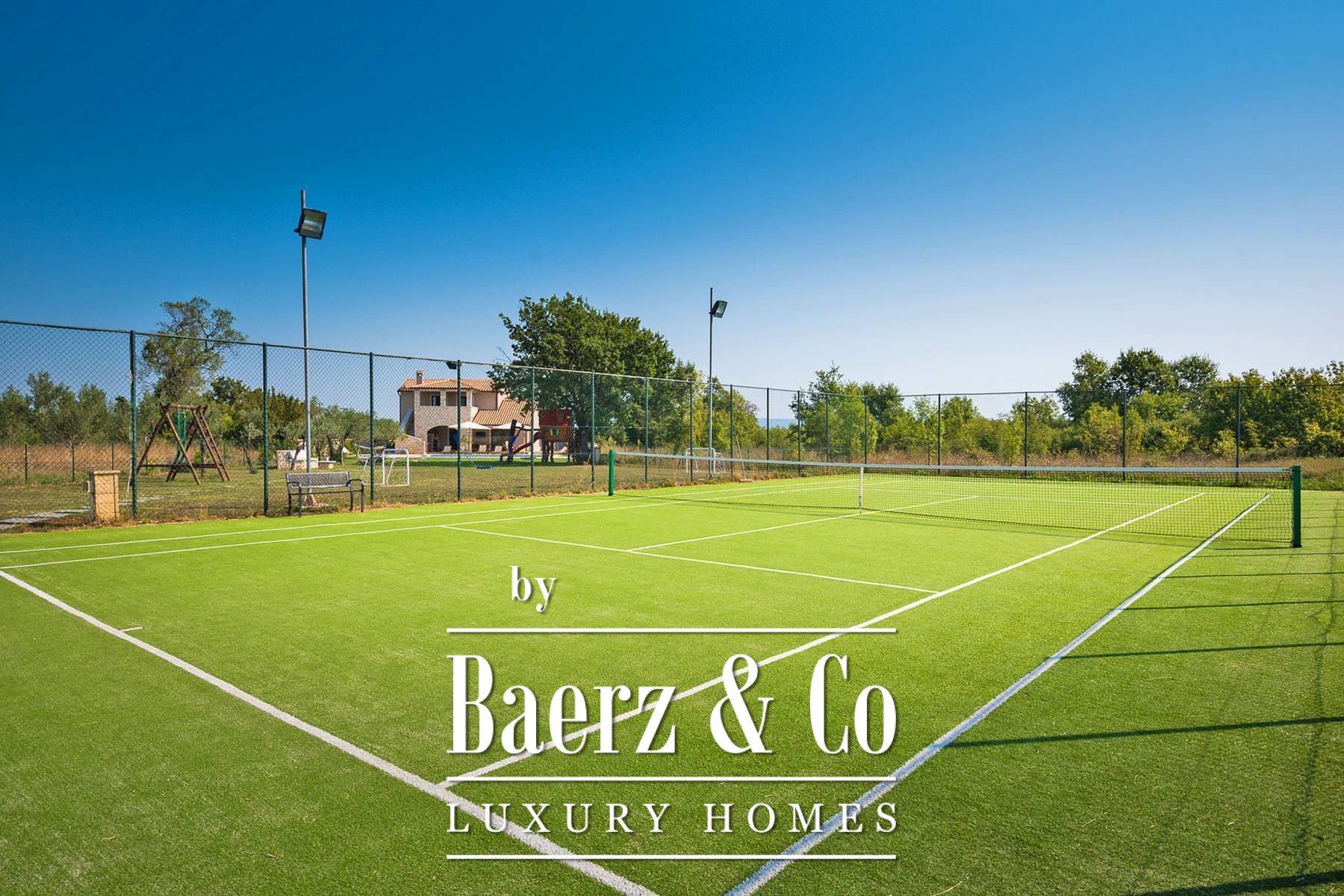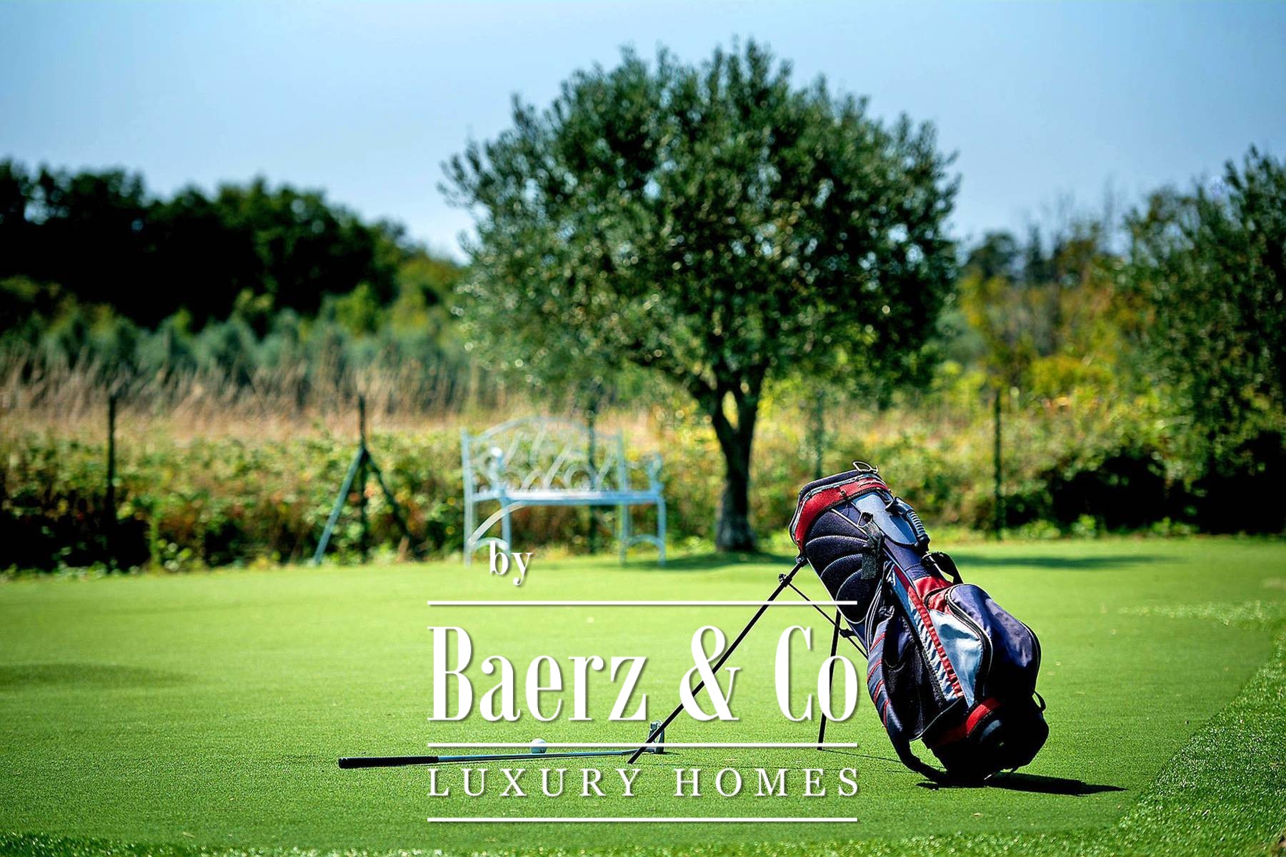 Ascending to the first floor reveals two more bedrooms, both with en-suite bathrooms and access to a balcony that offers views across the pool, olive trees, and the surrounding Mediterranean landscape. The outdoor rhythm of the property resonates with a covered terrace for open-air cooking and dining, overlooking a heated pool of 50 m², a tennis court, golf putting green, and multiple sports fields. Children’s play areas and a football field provide space for leisure for all ages.