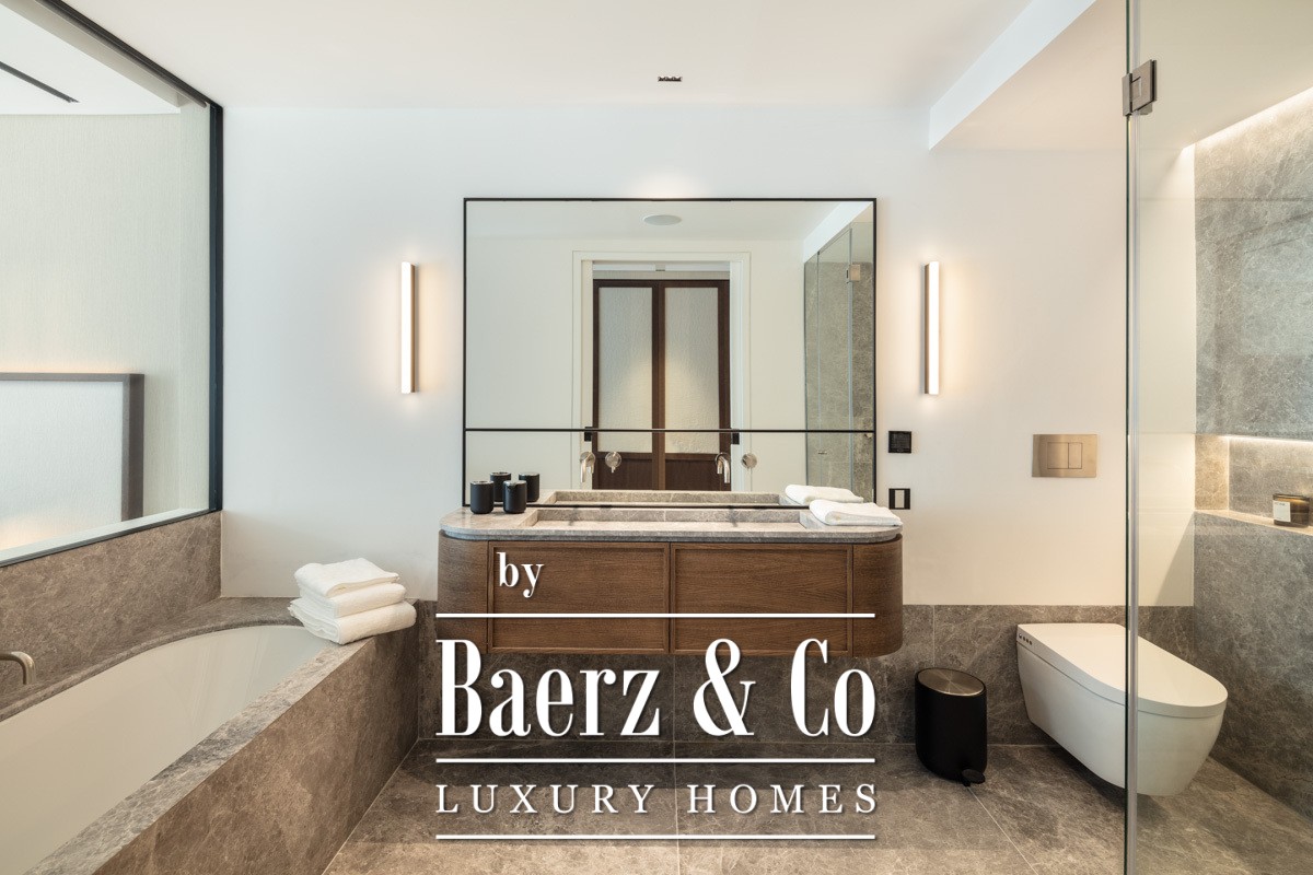 The kitchen features marble finishes and a concealed appliance setup, supporting both refined entertaining and effortless daily living. The covered, expansive terrace extends the living space outward for alfresco dining and relaxation, with direct access from the master suite and living area. Each of the three bedrooms maintains its own en-suite bathroom, finished in the finest materials. The master suite, with its privacy glass partition and grey stone double vanity, offers a discreet space to unwind.