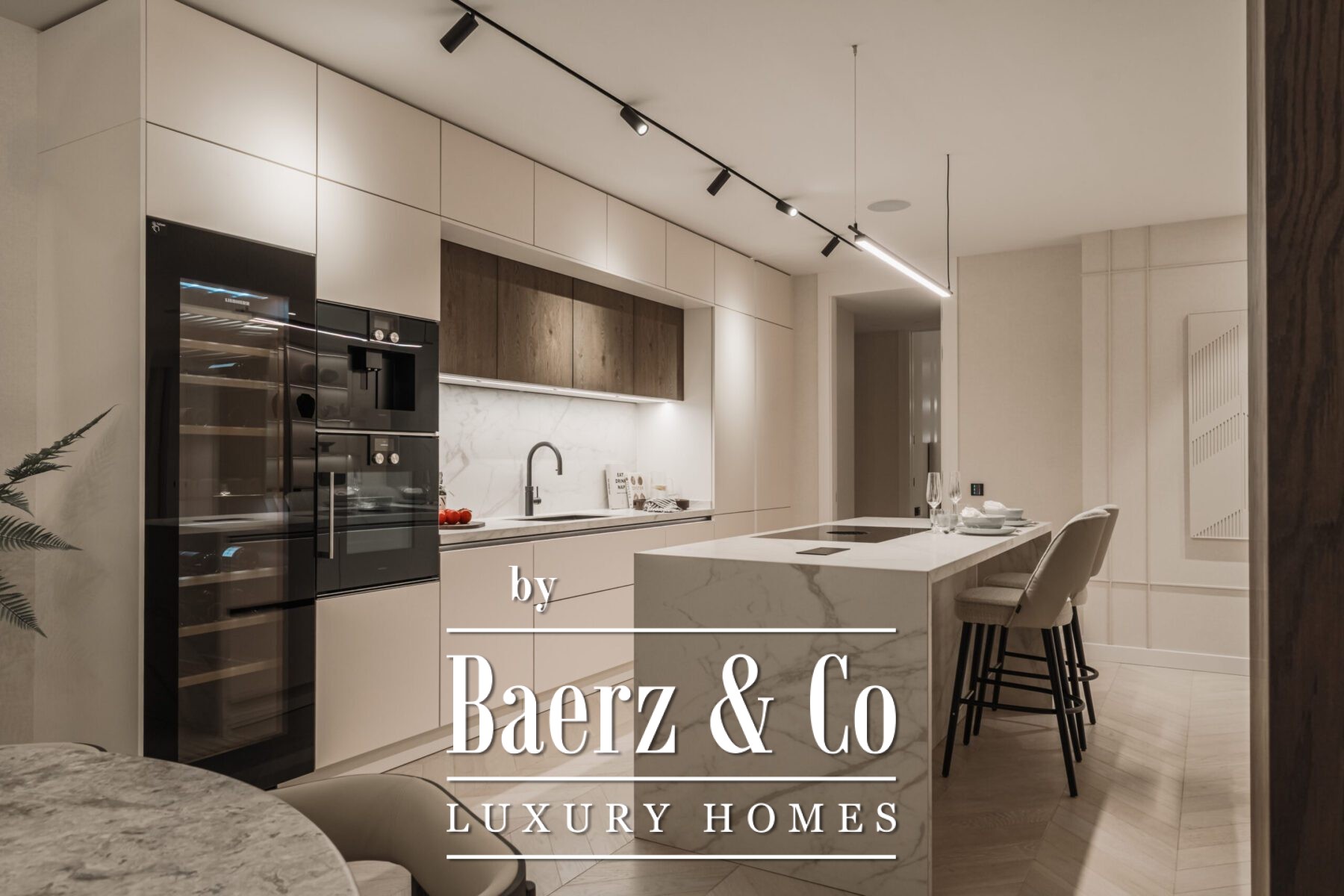 The apartment features an open-concept living and dining area with floor-to-ceiling windows that flood the space with natural light and create a seamless transition to the expansive outdoor terrace. The kitchen is equipped with state-of-the-art Gaggenau appliances, natural oak floors add warmth and character, and a smart home system allows for effortless control of lighting, temperature, and more.