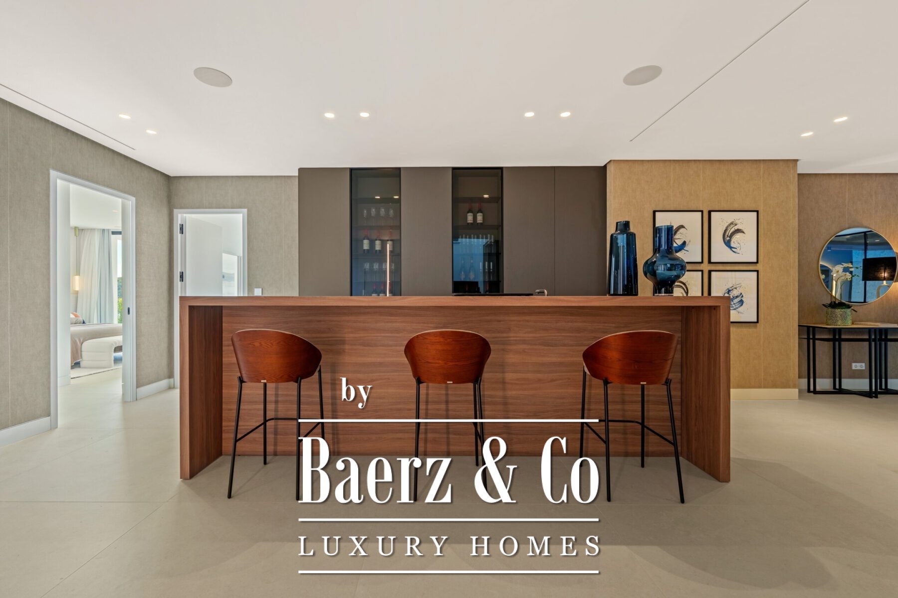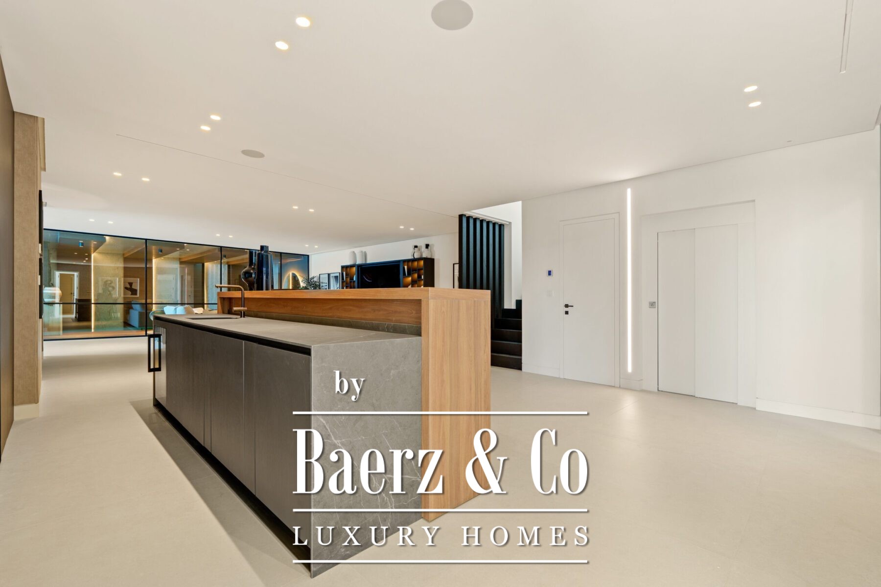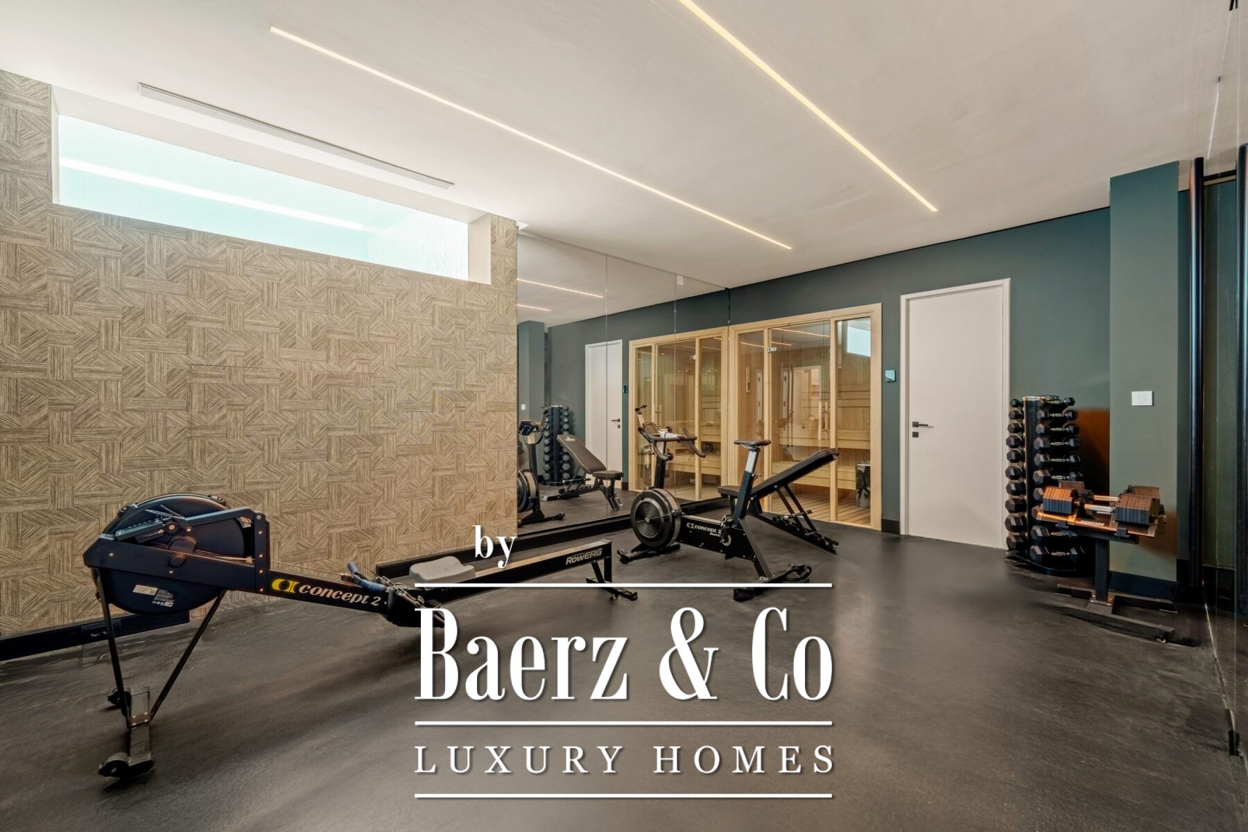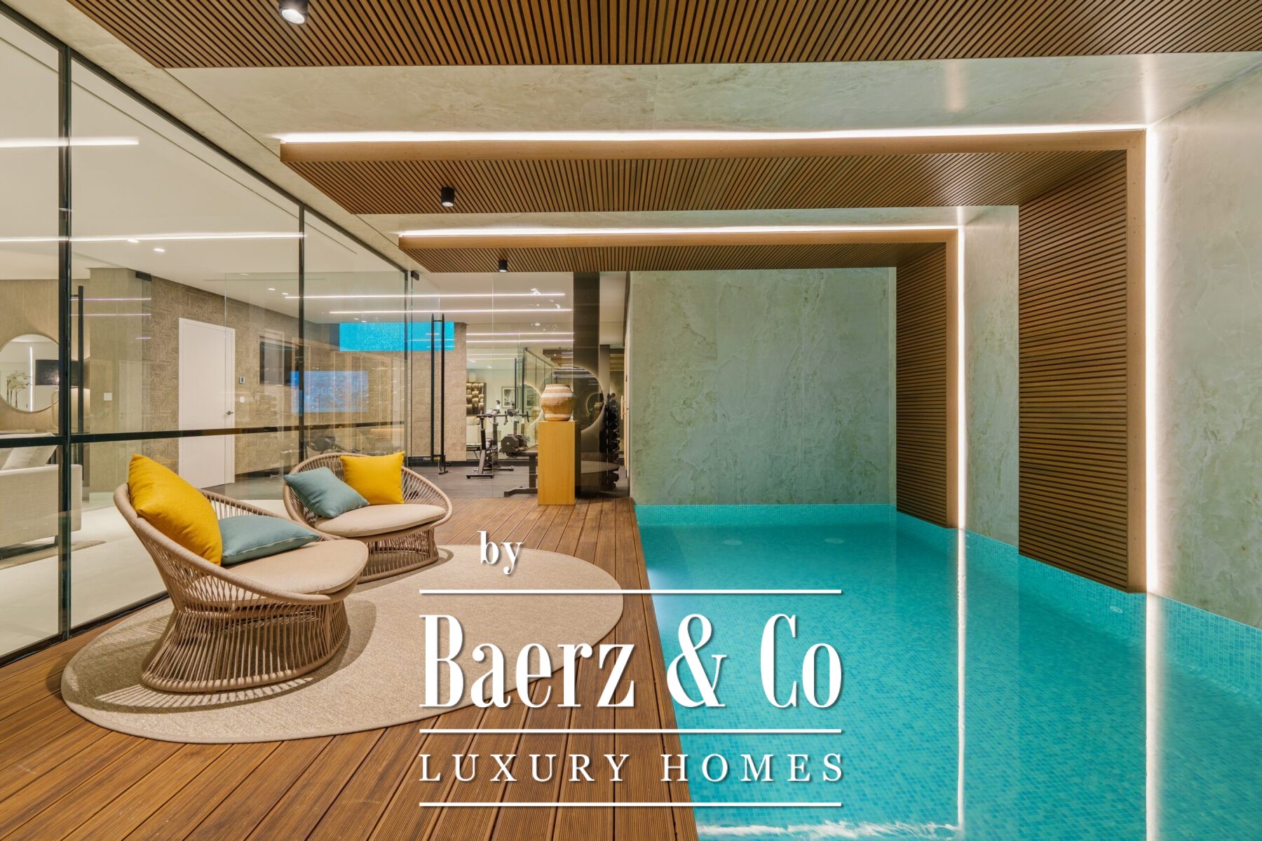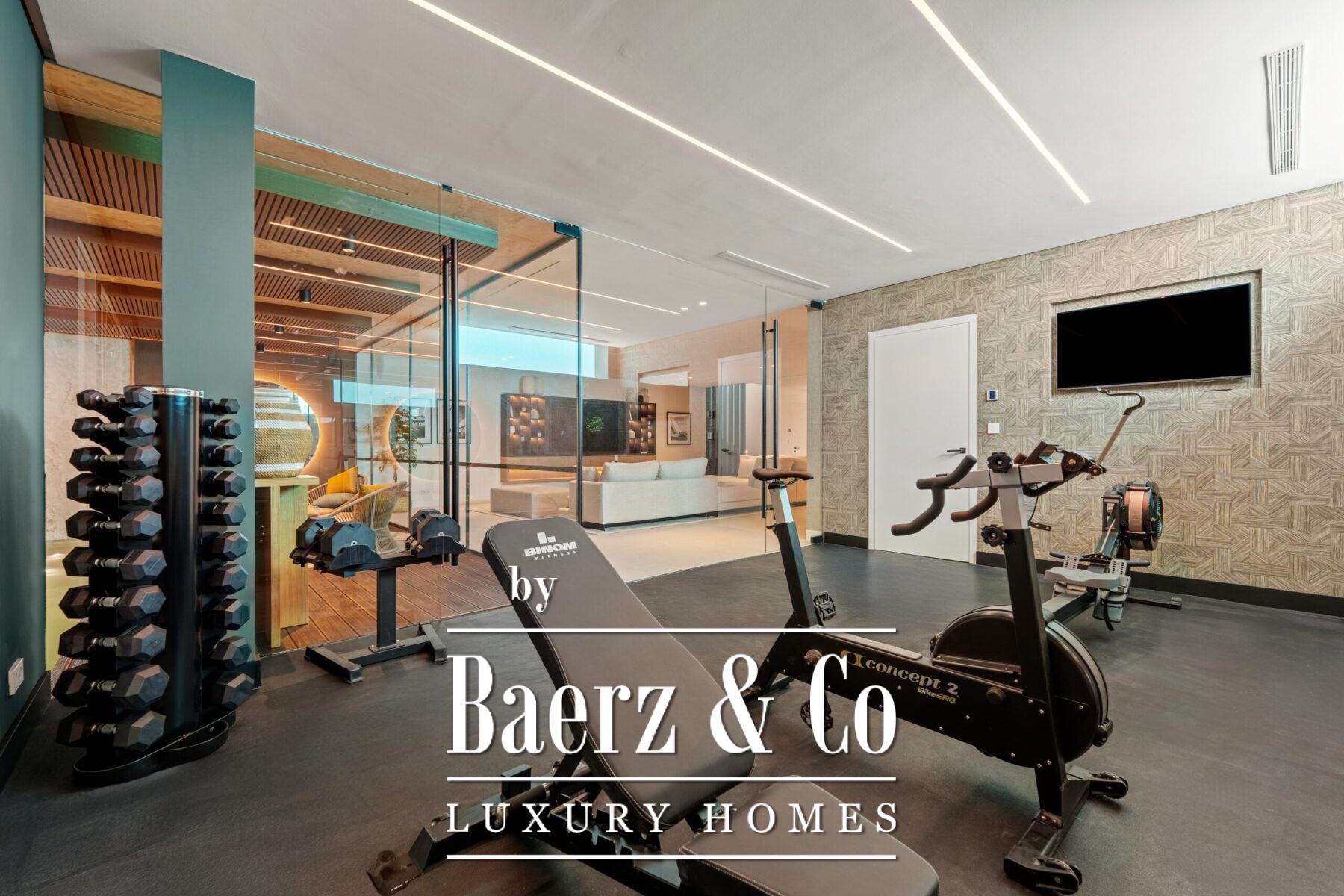 The home is structured around an open-plan concept, seamlessly connecting living, dining, and kitchen areas to expansive terraces. Floor-to-ceiling glass doors create a natural flow between indoor and outdoor spaces, enhancing the sense of light and openness. Multiple lounge and dining areas, both inside and out, make the property well suited for contemporary family living as well as entertaining. An entire level of the property is dedicated to leisure and wellness. This includes a fully equipped home gym, spa facilities, and an indoor pool designed with modern finishes. A separate entertainment space provides additional versatility, creating a setting for cinema, games, or social gatherings. The integration of these features establishes the property as a complete lifestyle residence.