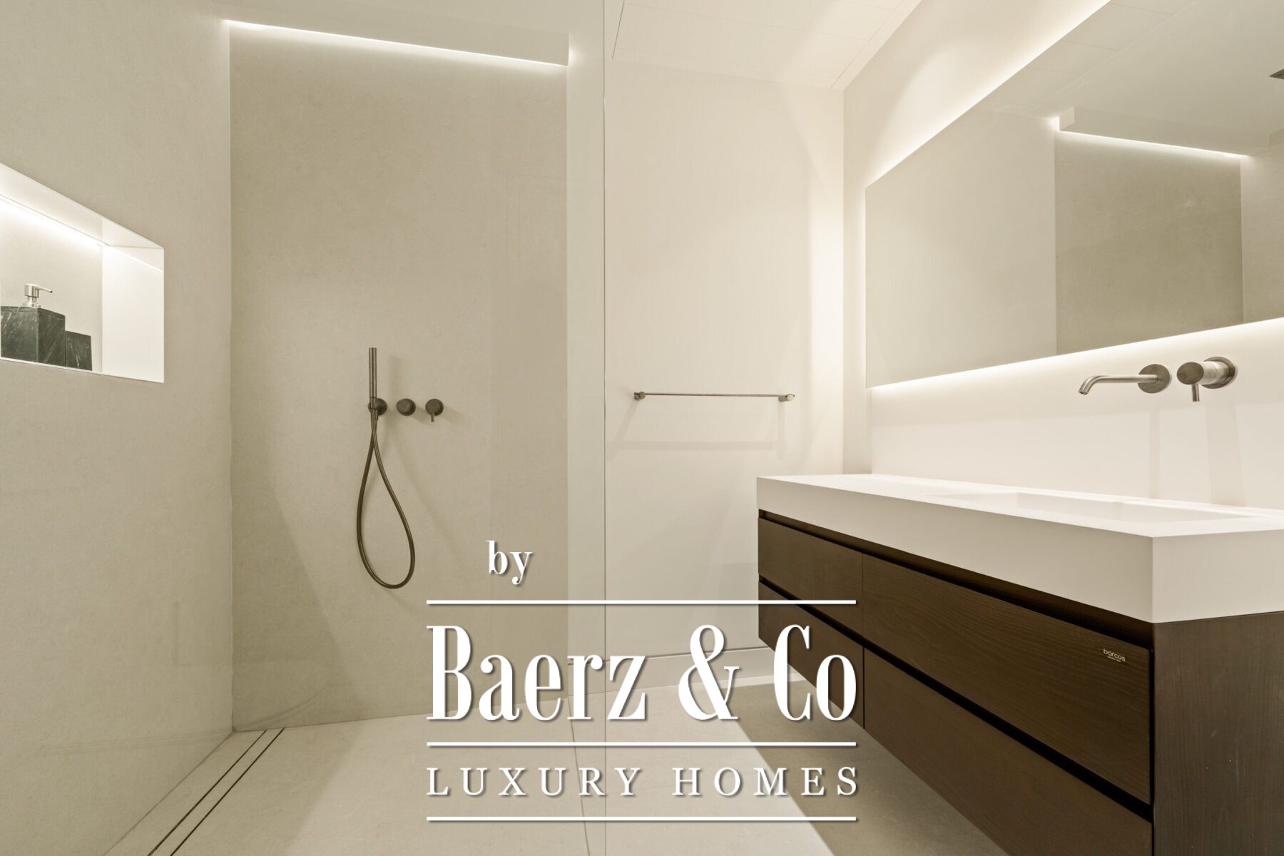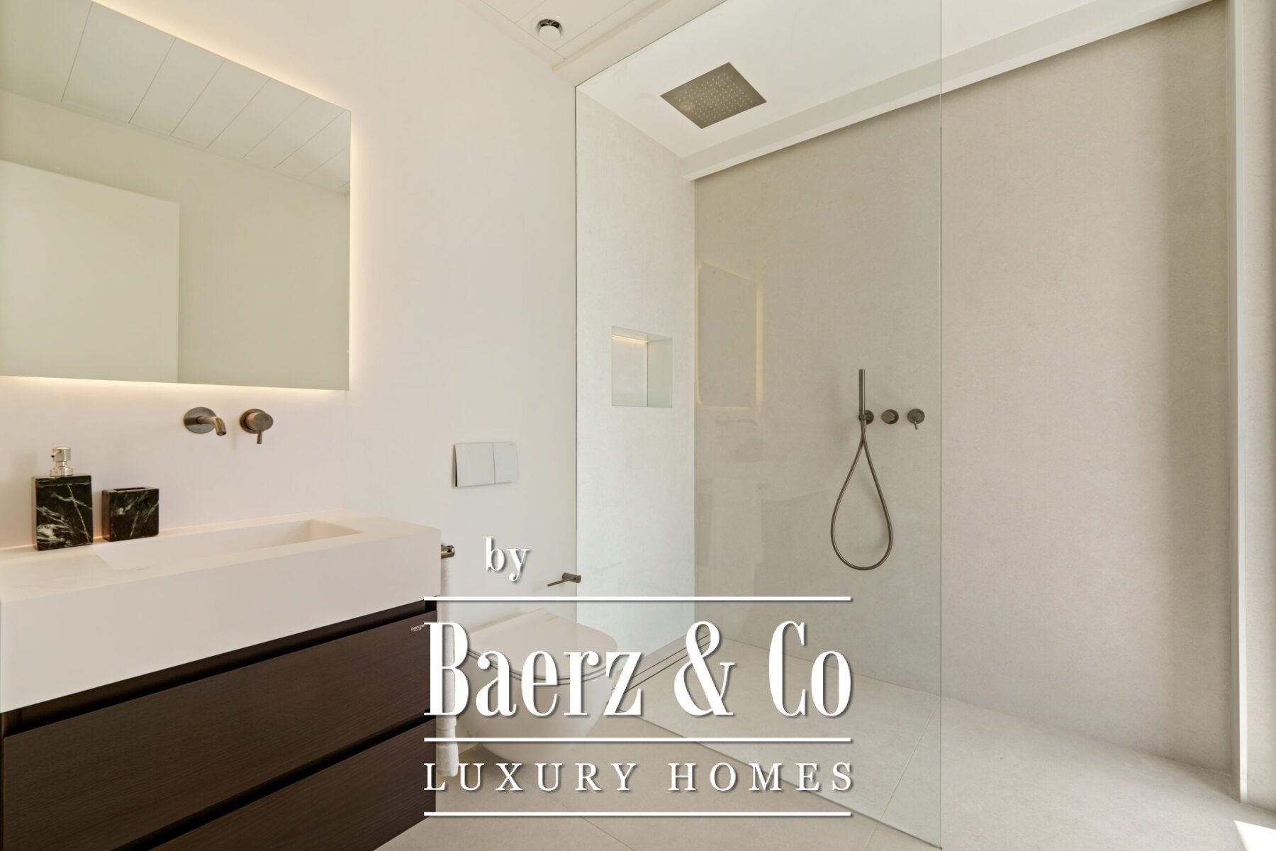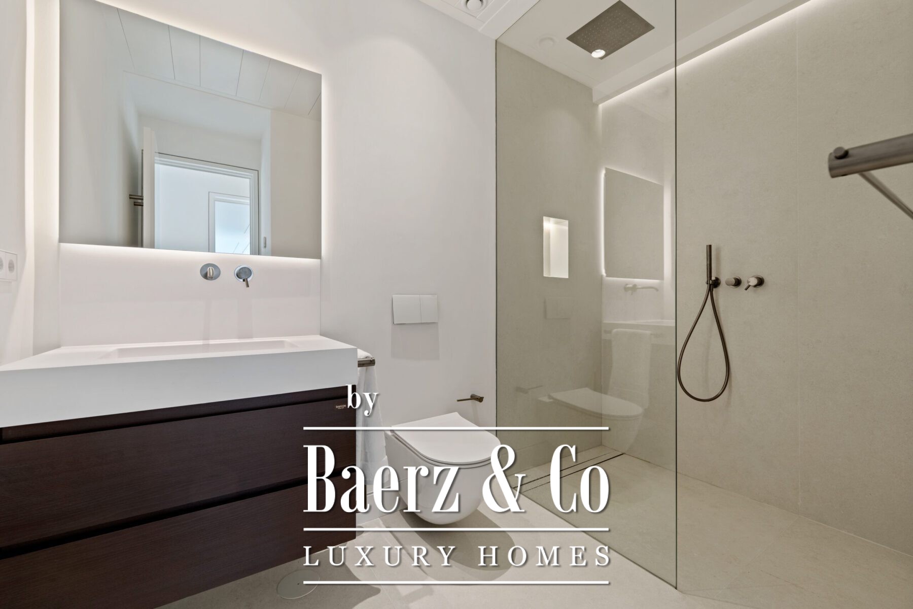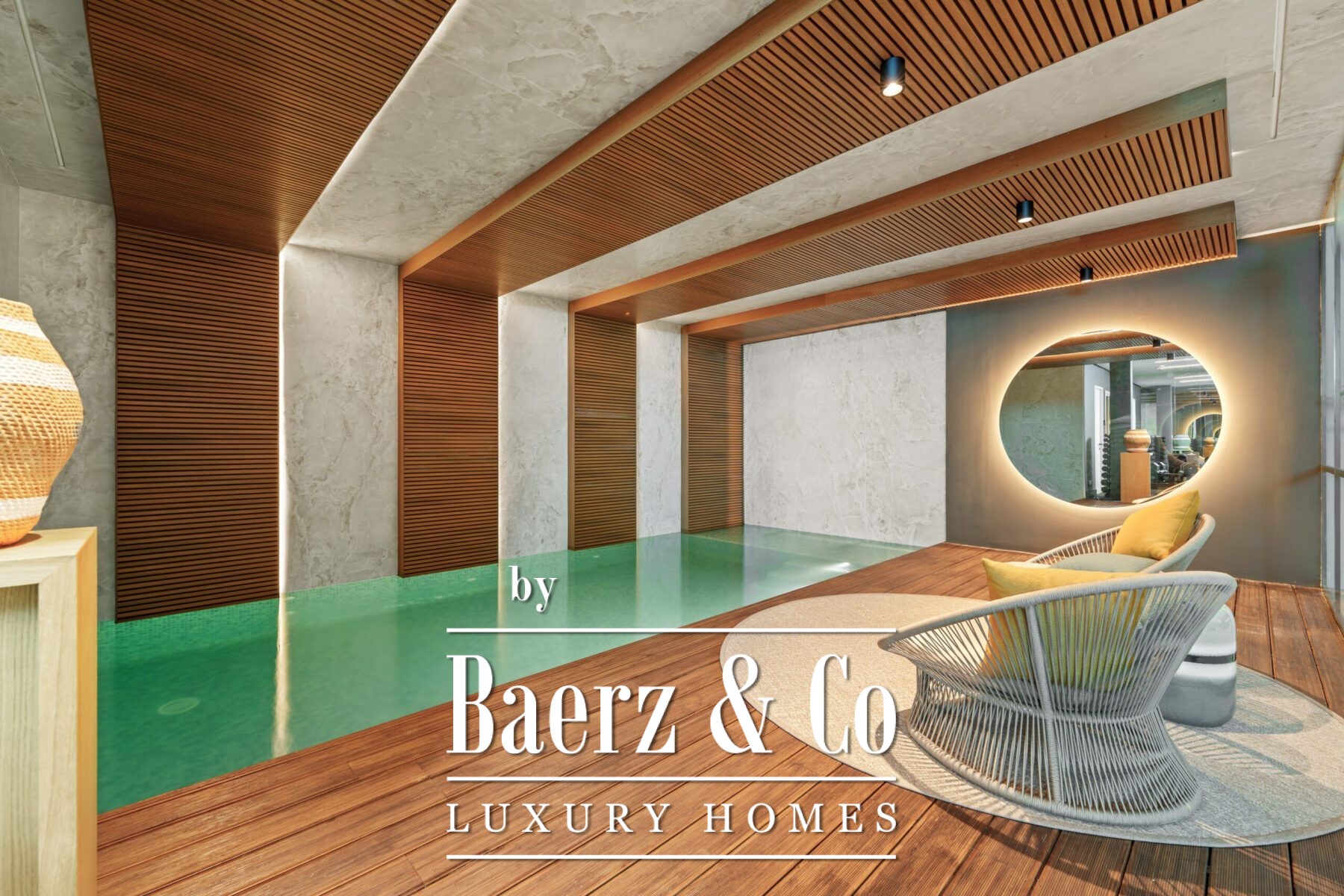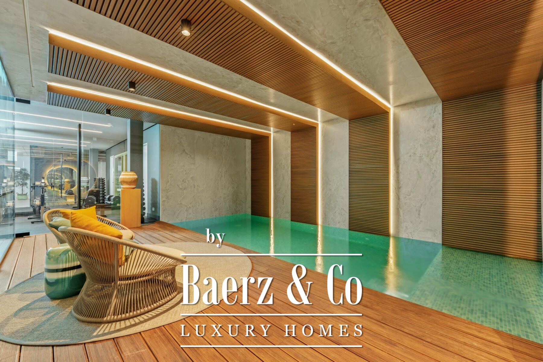 The home is structured around an open-plan concept, seamlessly connecting living, dining, and kitchen areas to expansive terraces. Floor-to-ceiling glass doors create a natural flow between indoor and outdoor spaces, enhancing the sense of light and openness. Multiple lounge and dining areas, both inside and out, make the property well suited for contemporary family living as well as entertaining. An entire level of the property is dedicated to leisure and wellness. This includes a fully equipped home gym, spa facilities, and an indoor pool designed with modern finishes. A separate entertainment space provides additional versatility, creating a setting for cinema, games, or social gatherings. The integration of these features establishes the property as a complete lifestyle residence.