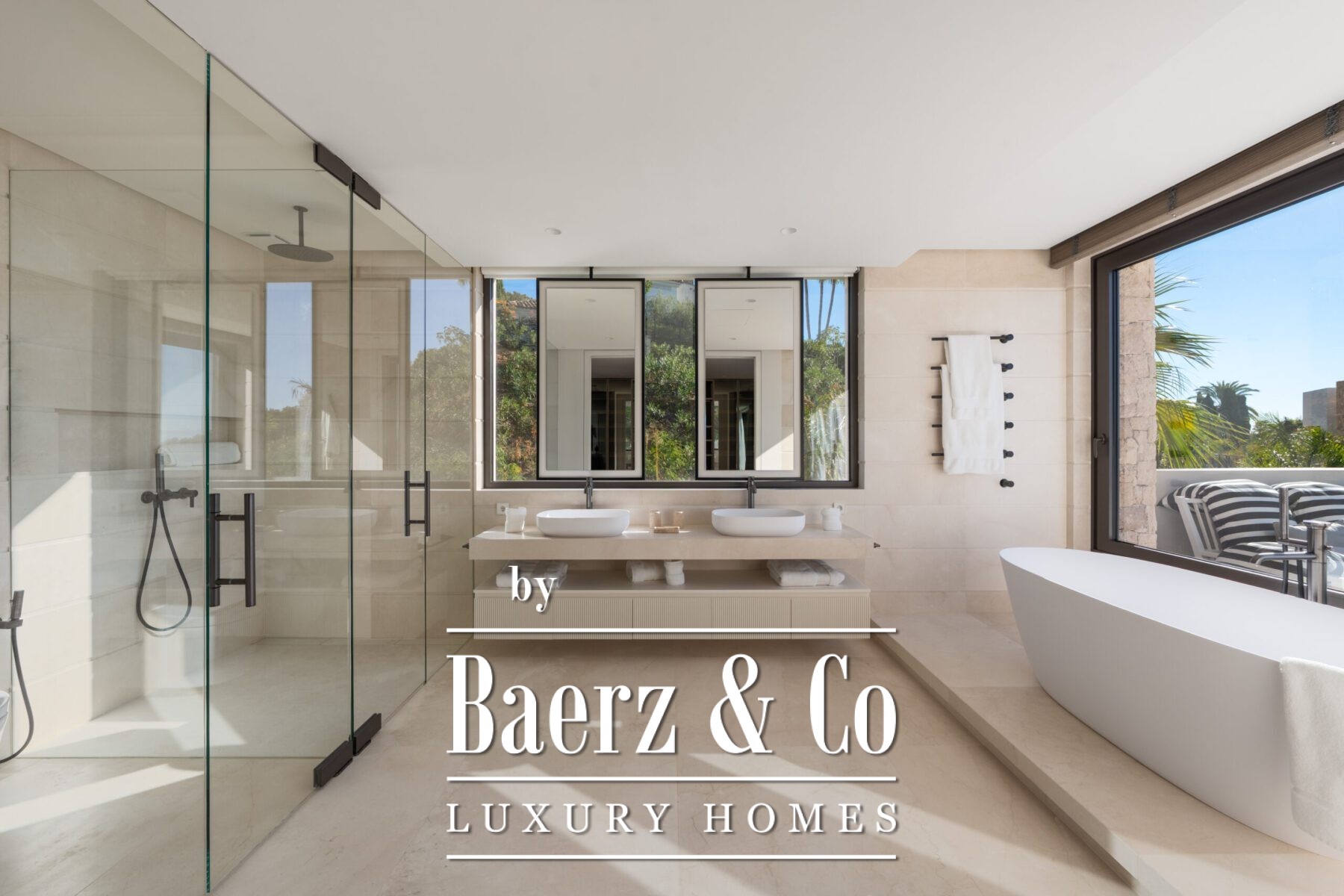 Sophisticated amenities include a home office, bespoke bar, entertainment room, home gym, Turkish bath, indoor pool, and dedicated cinema room. Outdoor space is equally deliberate, offering a private swimming pool, solarium with outdoor kitchenette, and a succession of terraces, all oriented toward panorama views of the Mediterranean and the mountains. With 24-hour security, proximity to golf, the sea, and Marbella's cultural enclave, this luxury villa for sale in Marbella Hill Club articulates discretion and enduring value.