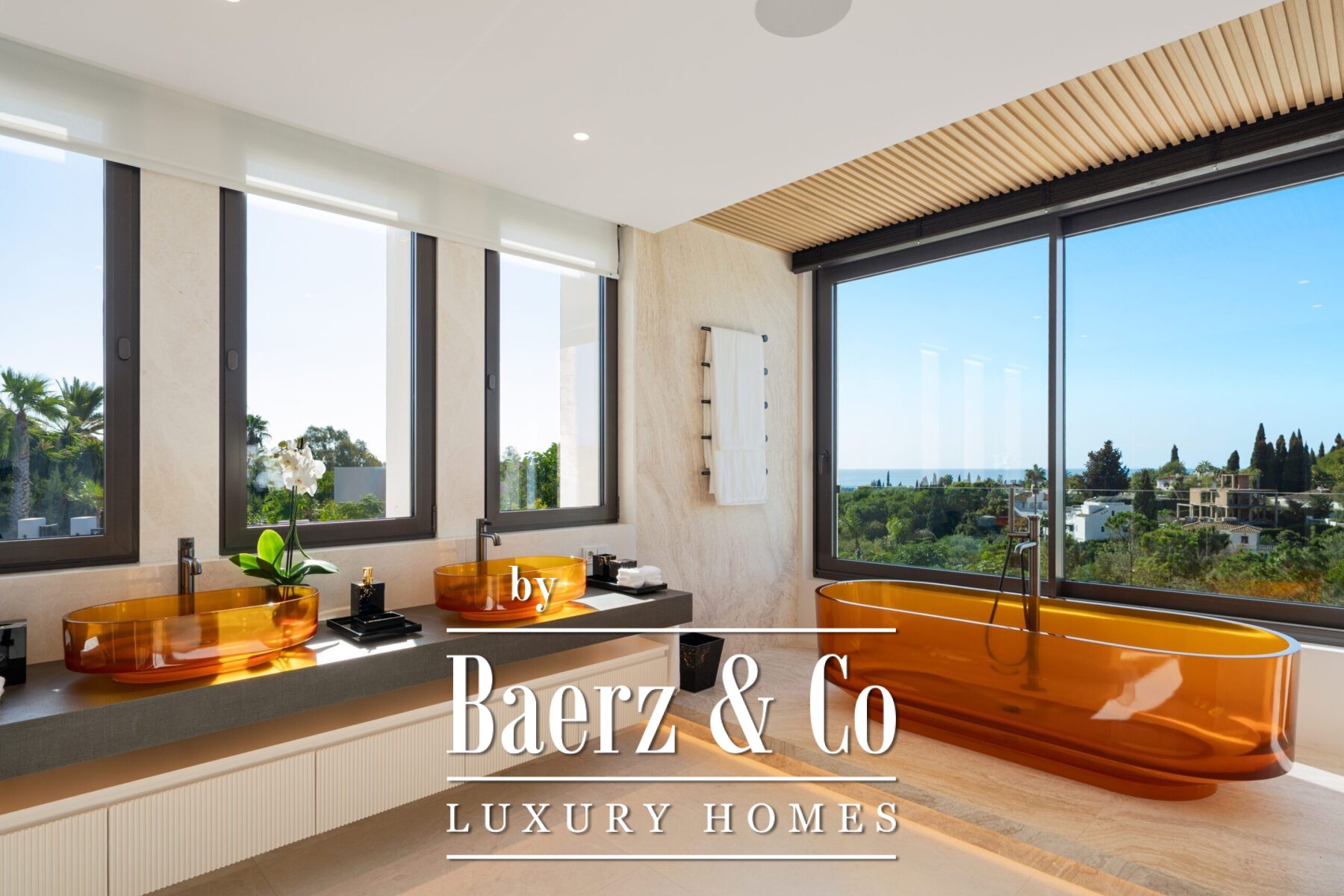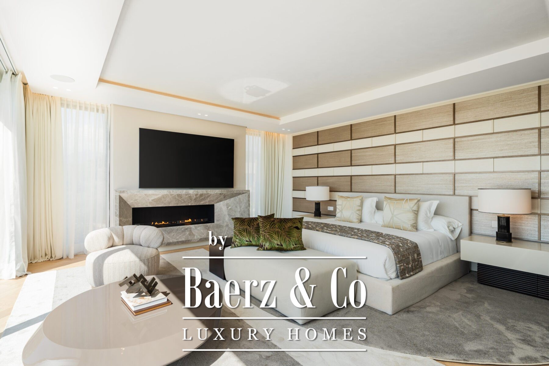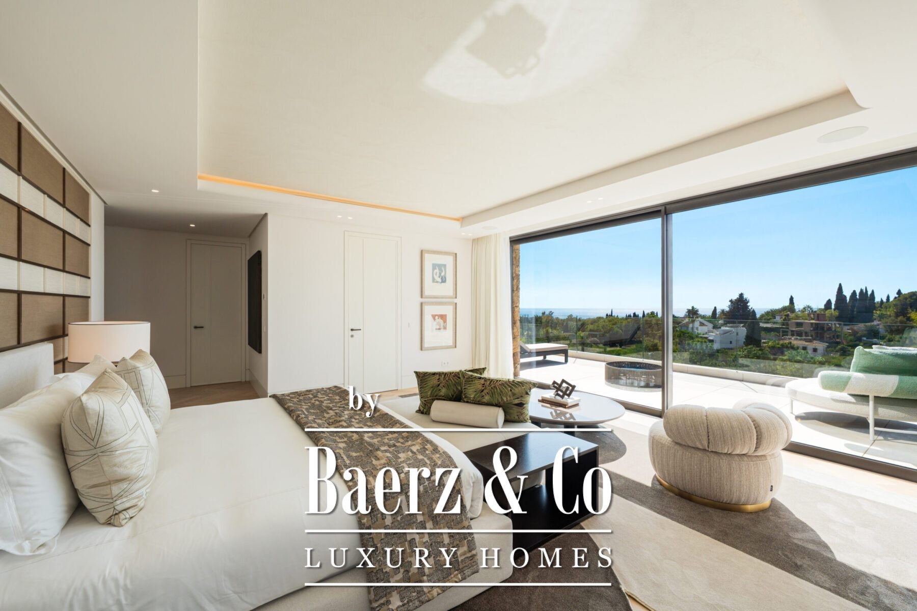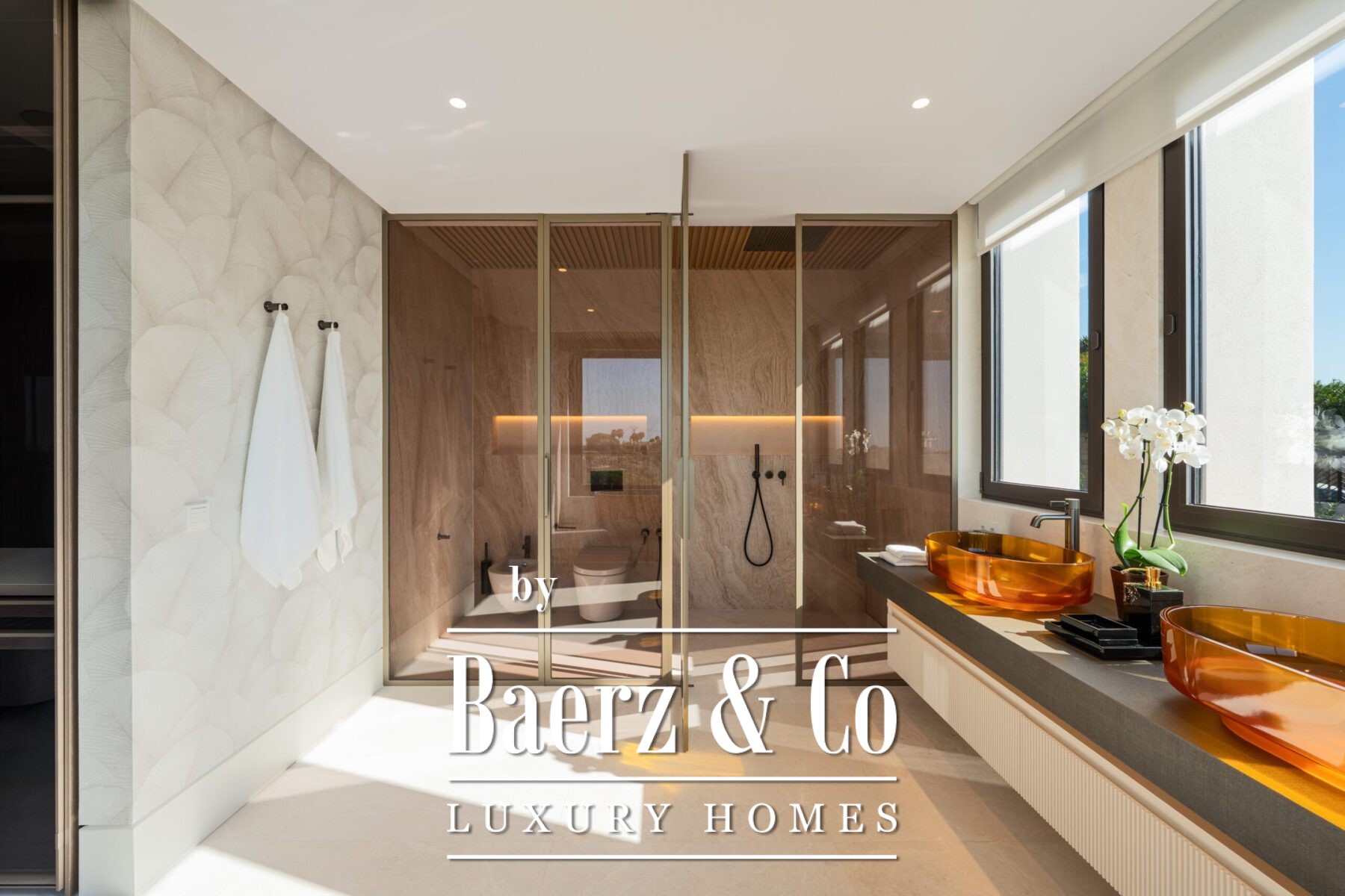 Above, the master suite commands sweeping views and includes a walk-in closet, refined bath, and its own terrace retreat. An additional guest suite and a tranquil home office complete the upper floor, with an elevator linking each level. Brand new, secure, and fully serviced with advanced amenities such as air conditioning, underfloor heating, 24-hour security, and private garage, this luxury villa for sale in Marbella Hill Club offers a rare synthesis of elegance and ease. Access to golf, the sea, and prime amenities is moments away, emphasising both the property’s privilege of location and immersive sense of place.