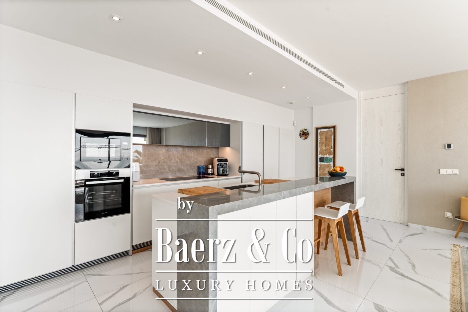Indoors, open-plan living, dining, and kitchen areas harmonise contemporary Scandinavian tone with functional sophistication. Features such as floor-to-ceiling doors, Miele appliances, stone worktops, electric blinds, underfloor heating, and a guest WC contribute to a cohesive, comfortable atmosphere. Two underground parking spaces and a storage room ensure practical luxury.
