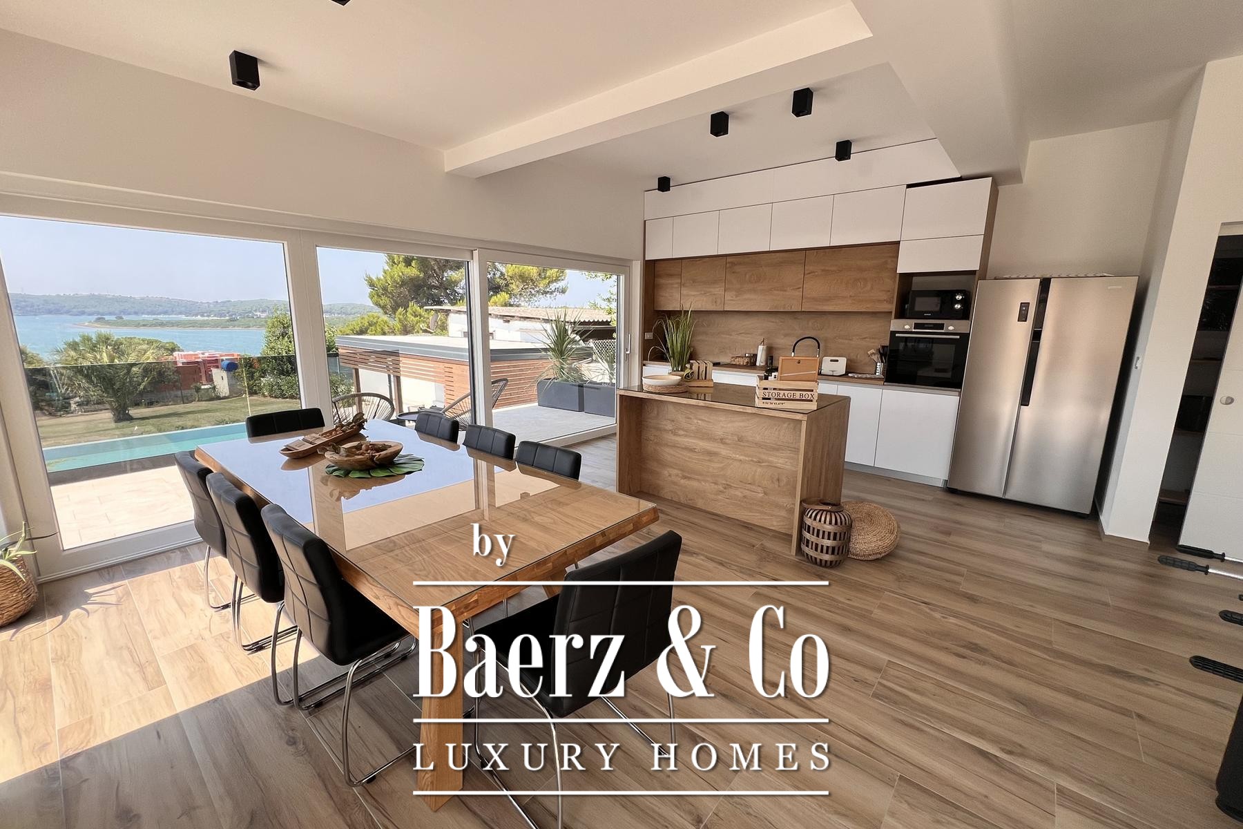 Villa Medulin occupies a discreet position in Pomer, removed from the bustle yet oriented to panoramic sea views from nearly every room. This villa, newly built and situated on a plot spanning 944 m², offers a net usable area of 190 m² across a ground and first floor, with a layout designed for both privacy and connected living.