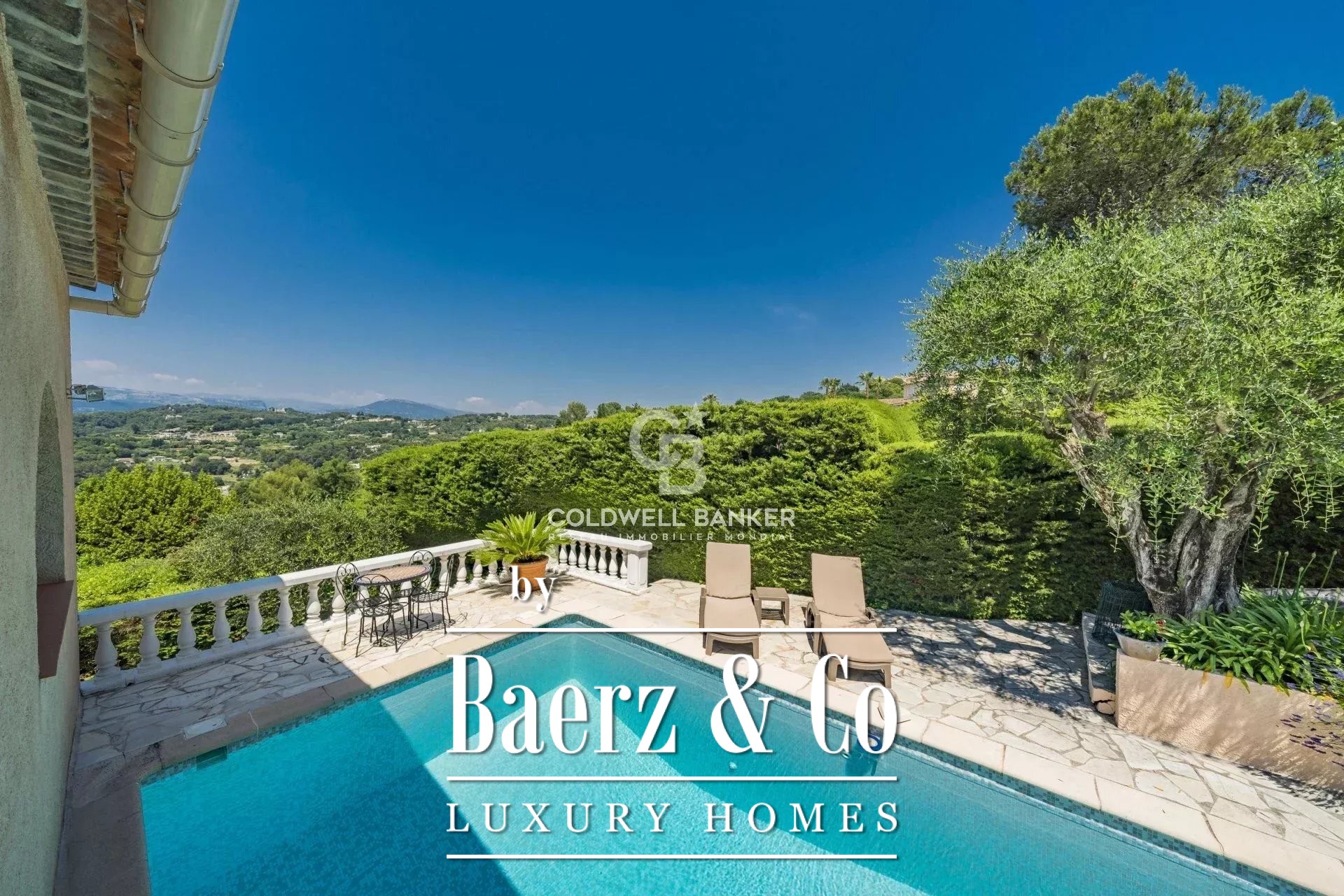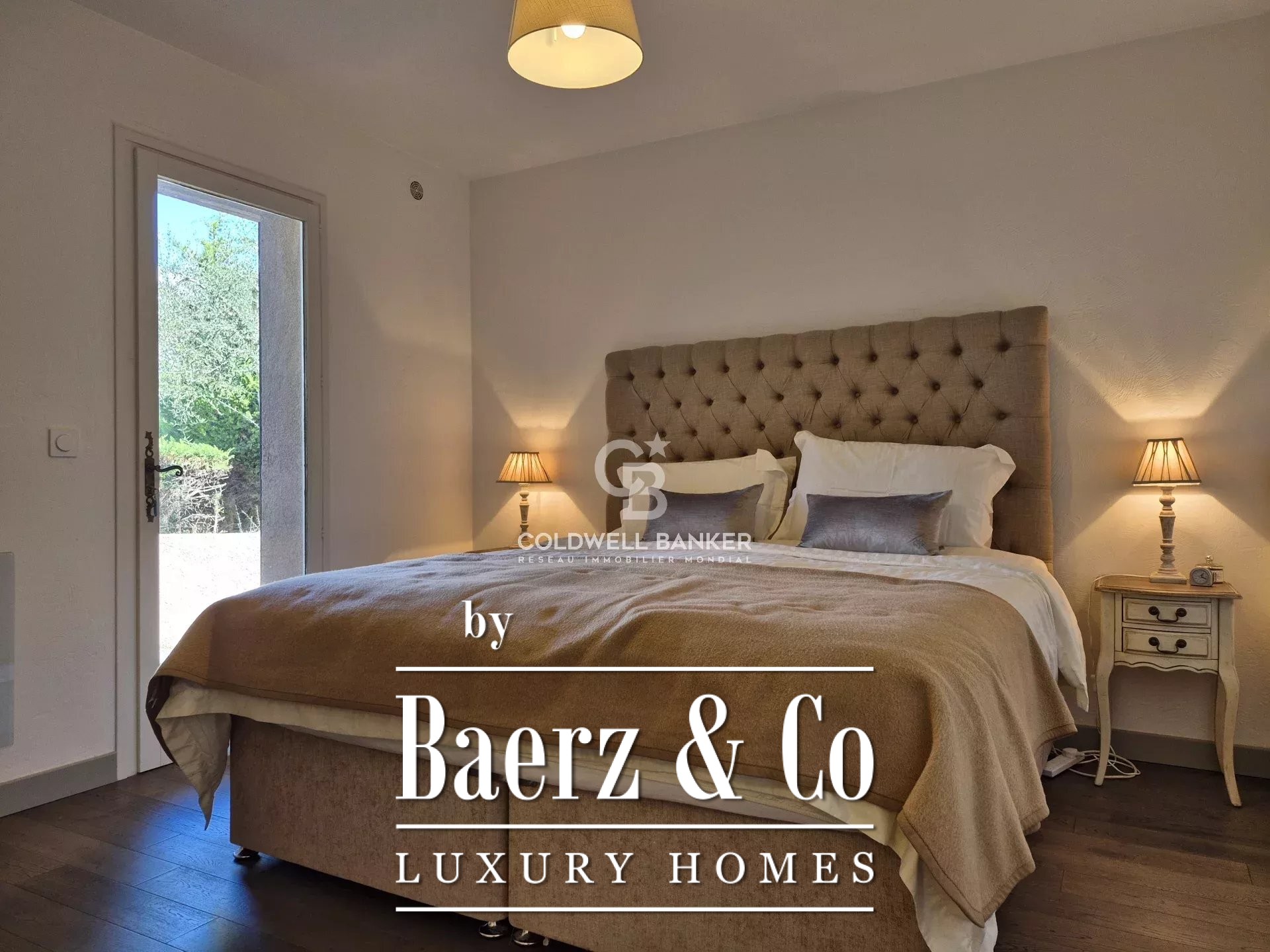 Surrounding the residence, a 620 m² garden is composed for leisurely afternoons, featuring a swimming pool bordered by outdoor lighting and mature greenery. A private garage and secure electric gate facilitate seamless arrival, while amenities such as air-conditioning, double glazing and an intercom ensure day-to-day ease. From the garden and living spaces, views sweep out over the undulating hills and mountains, offering a striking sense of place.