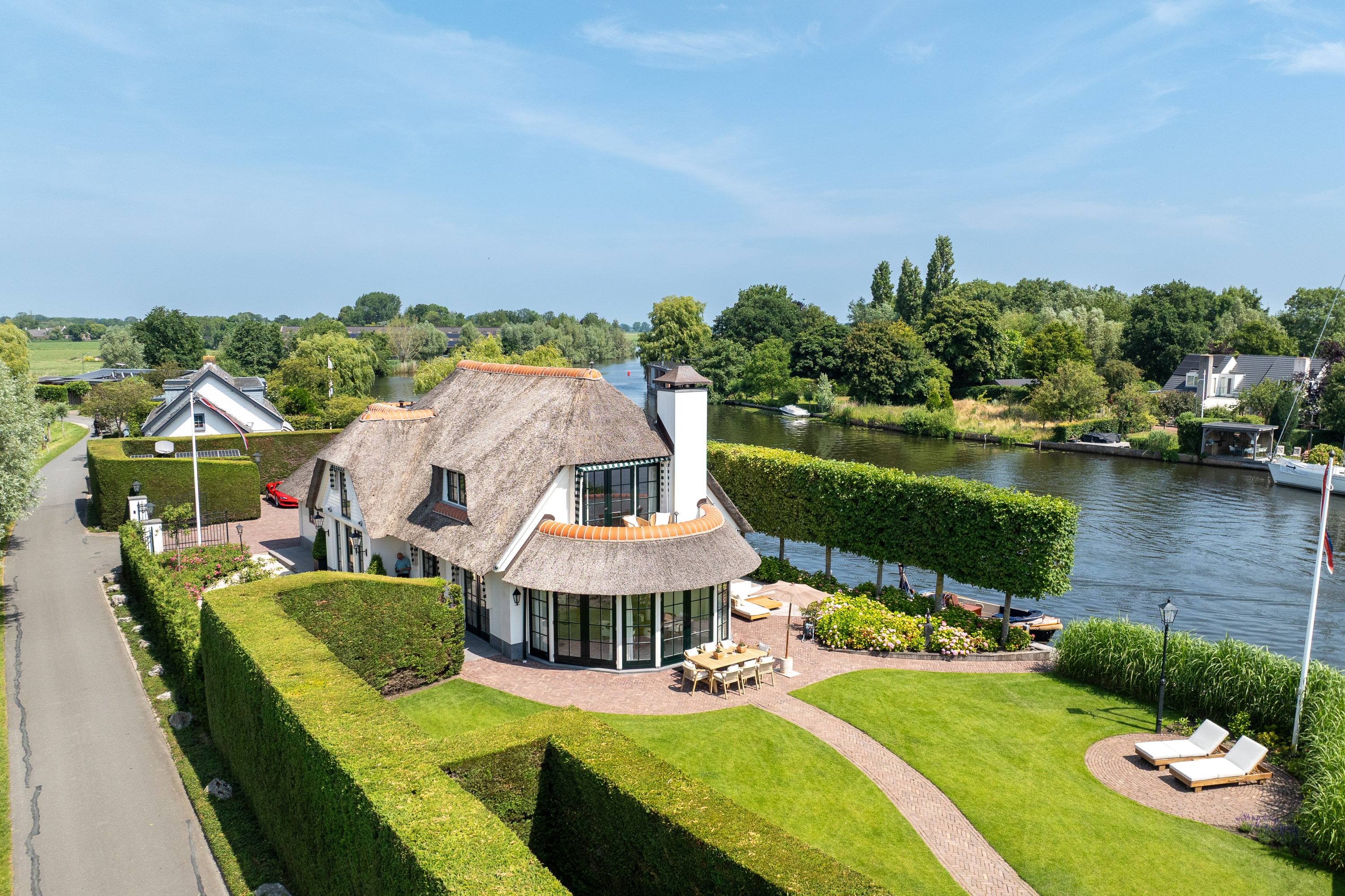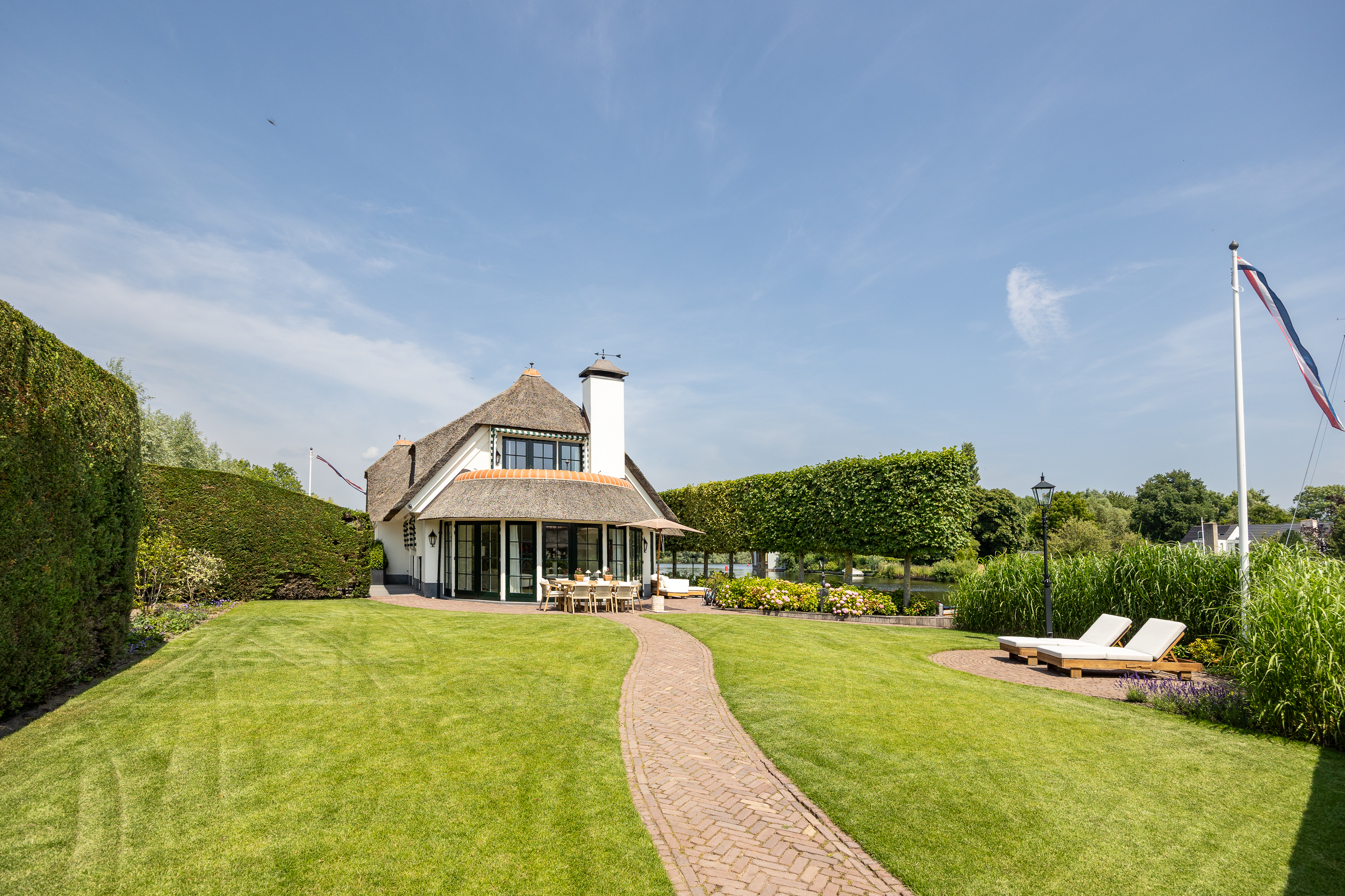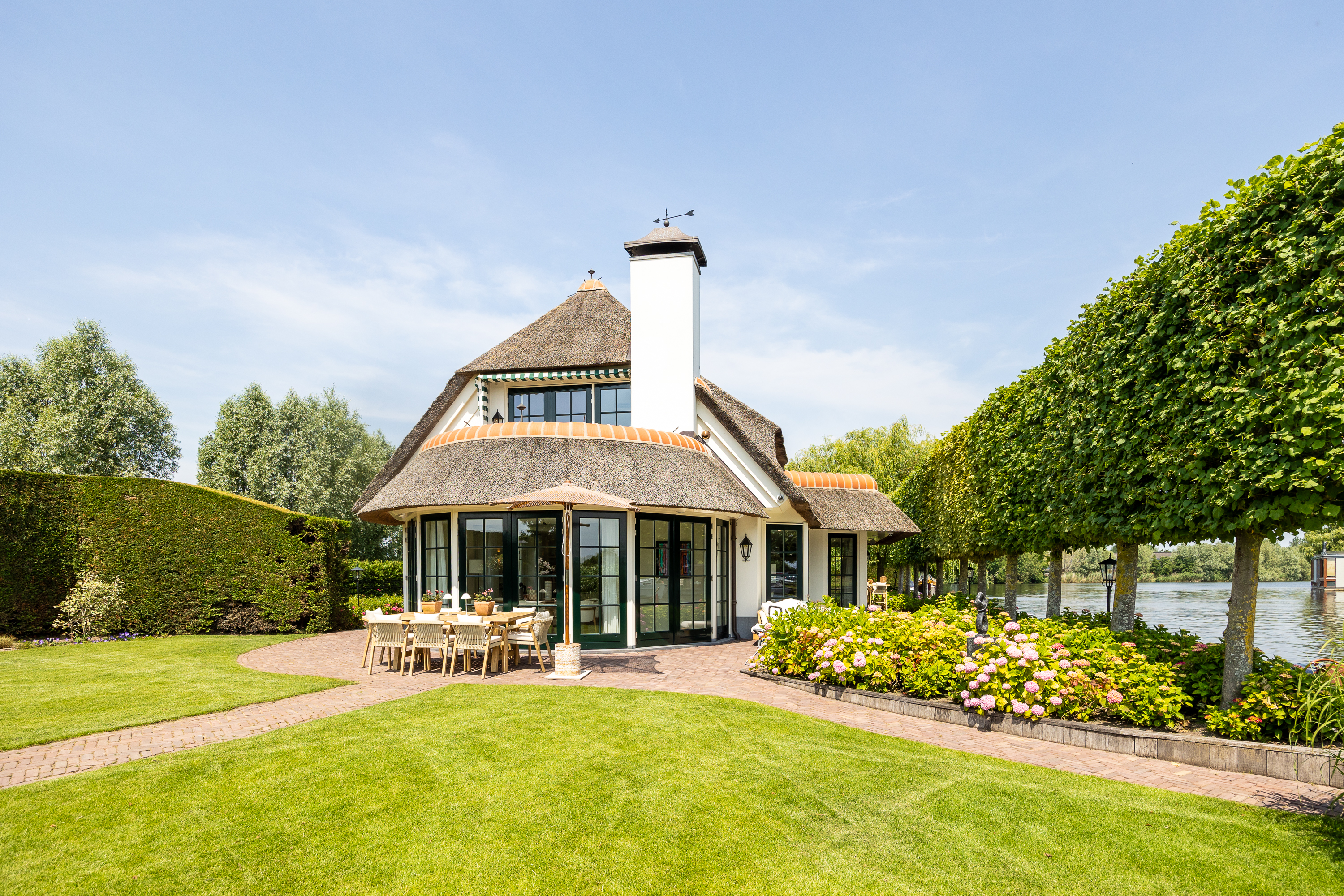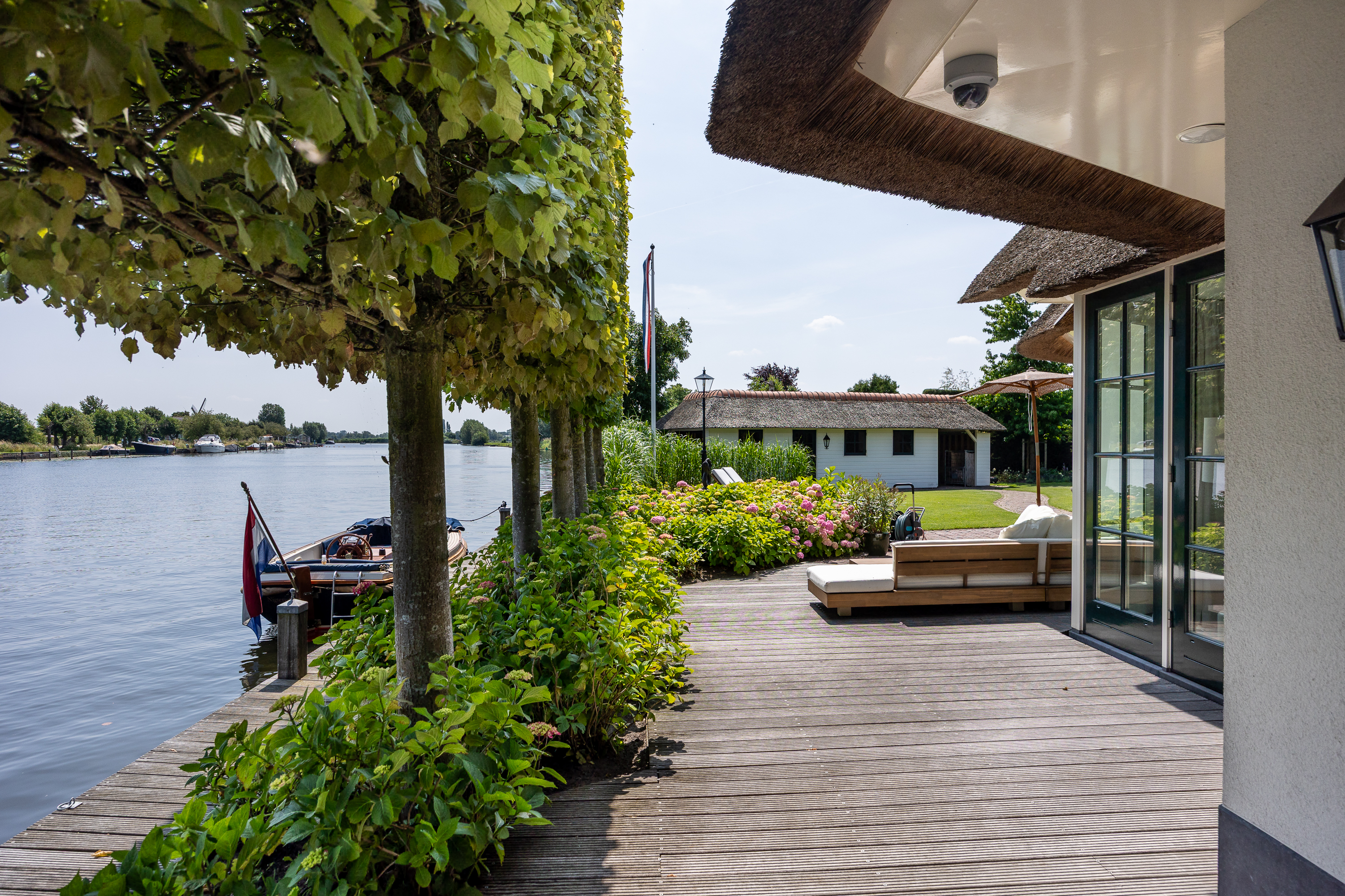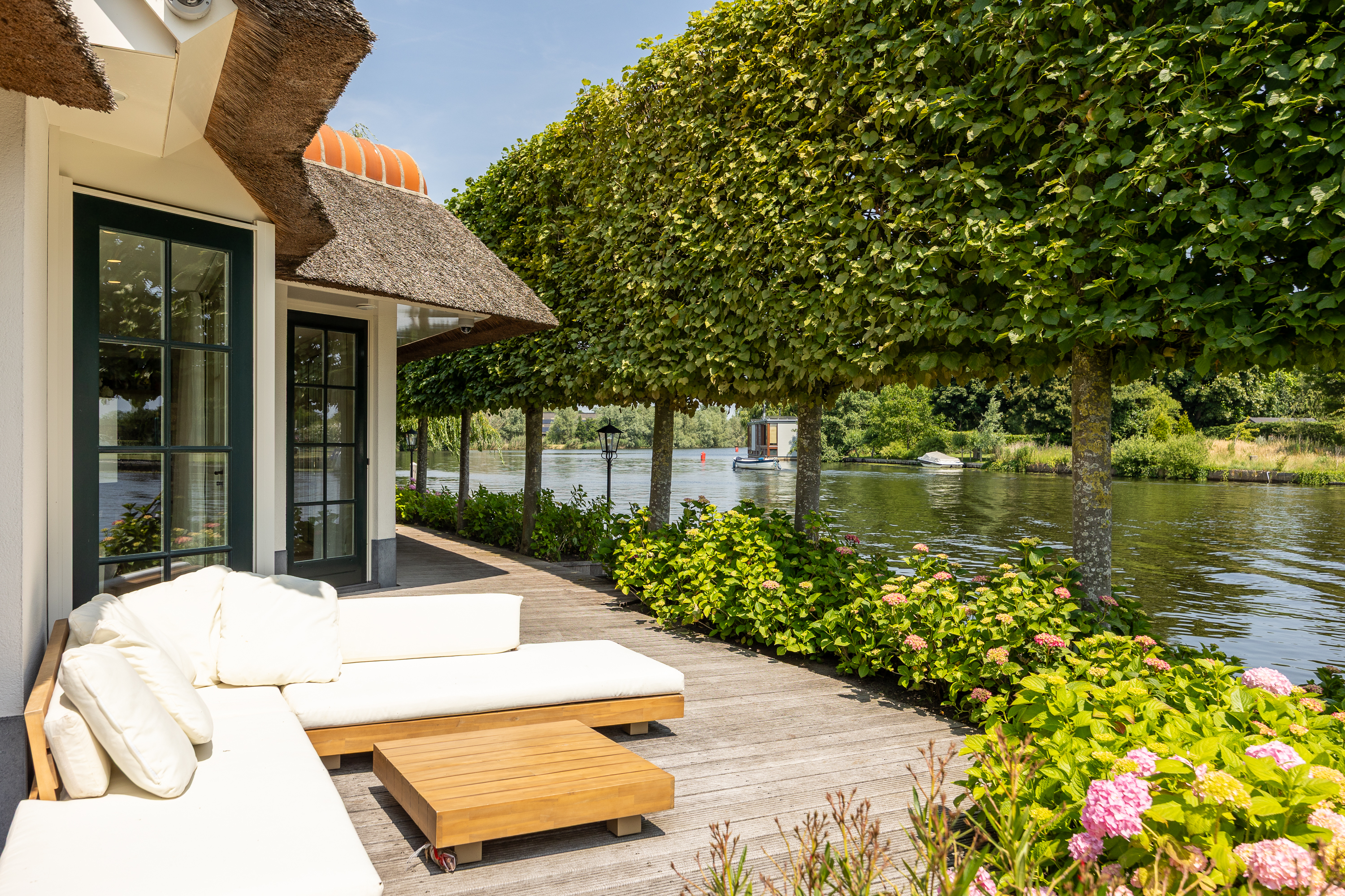 Vreelandseweg 99 in Nigtevecht - A beautiful, modern (completely renovated in 2023), luxurious, thatched villa on the majestic River Vecht, just outside Amsterdam. Living here means endless enjoyment with family and friends of the beautiful nature, the conviviality of water sports on the river, but also the ultimate peace and privacy that this magnificent place has to offer. And all this just a stone's throw (20 minutes) from Amsterdam and the charming villages of Nigtevecht and Vreeland (5 minutes).